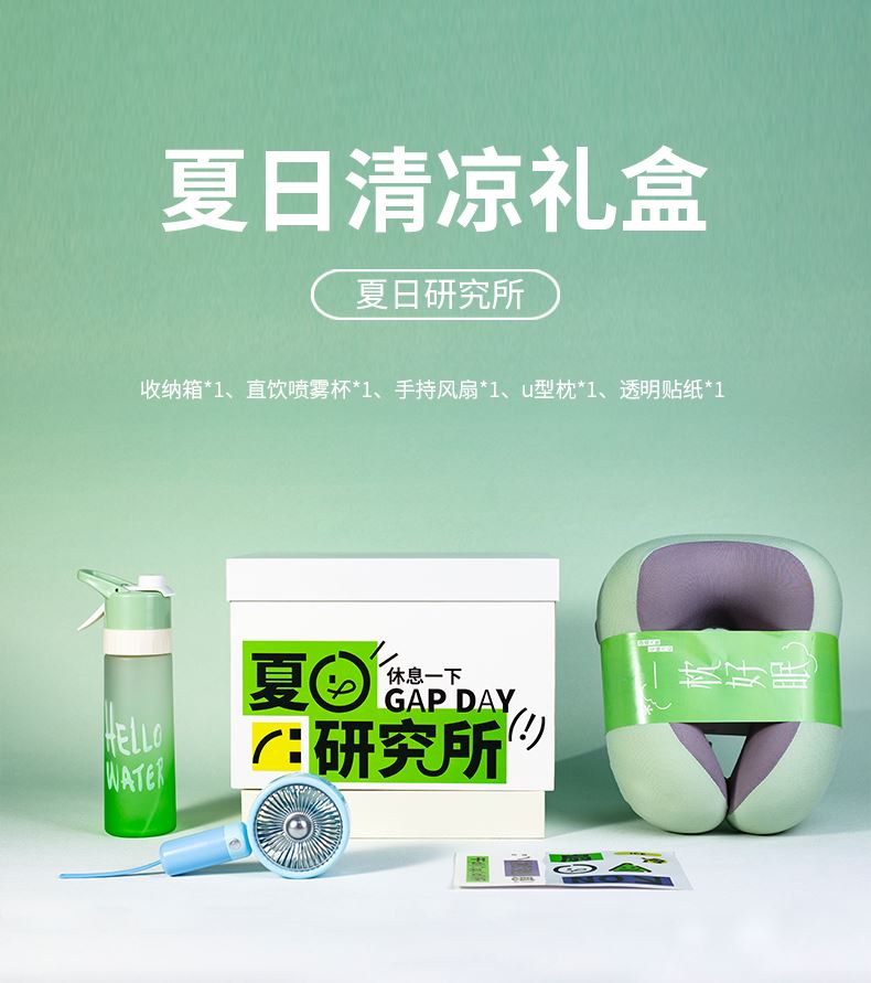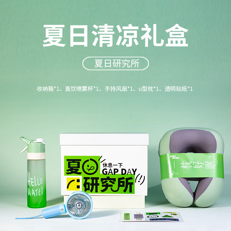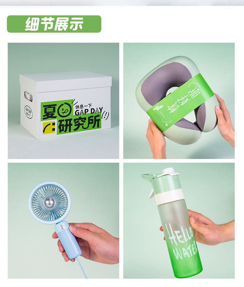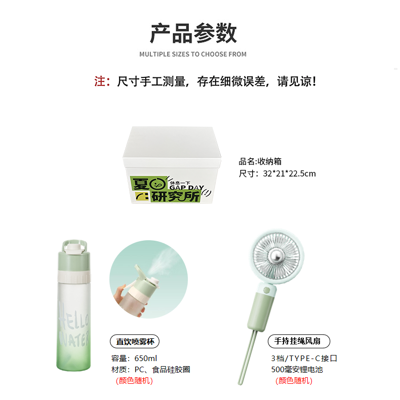 礼盒参数: 收纳盒尺寸:32*21*22.5cm 外箱尺寸:65*44*47cm 套装重量:1455g/套 详细介绍: 1.直饮喷雾杯 容量:650ml 材质:PC、食品硅胶圈 (颜色随机) 2.手持挂绳风扇 3档/TYPE-C接口 500毫安锂电池 (颜色随机) 3.双峰U型枕 尺寸:26*28*12cm 面料:牛奶丝 内芯:太空记忆棉 4.趣味贴纸