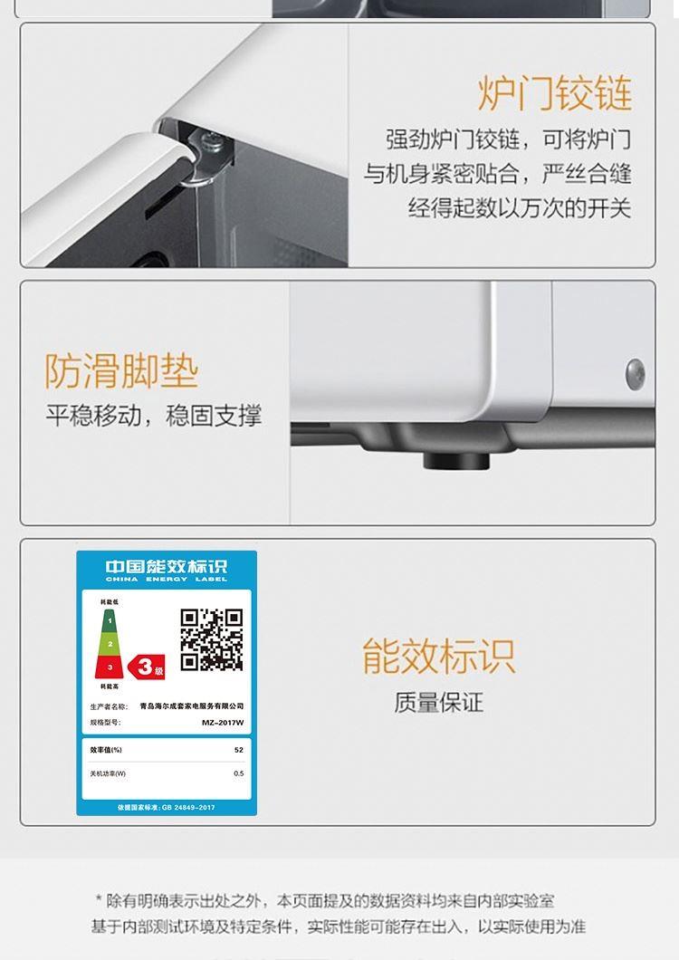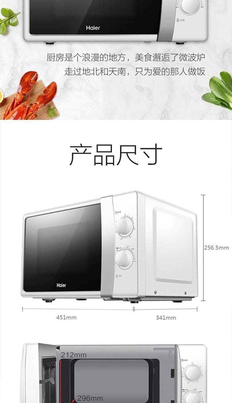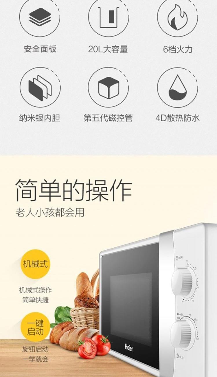 容积:20L 加热方式:转盘 开门方式:侧拉门 控制方式:机械式 操作方式:机械旋钮 微波功率:700W 能效等级:3级 产品尺寸:451*327*257 产品净重10 重量(含包装)11.3 1. 旋钮操作,一键操作; 2. 20升大容量空间; 3. 易清洗内胆