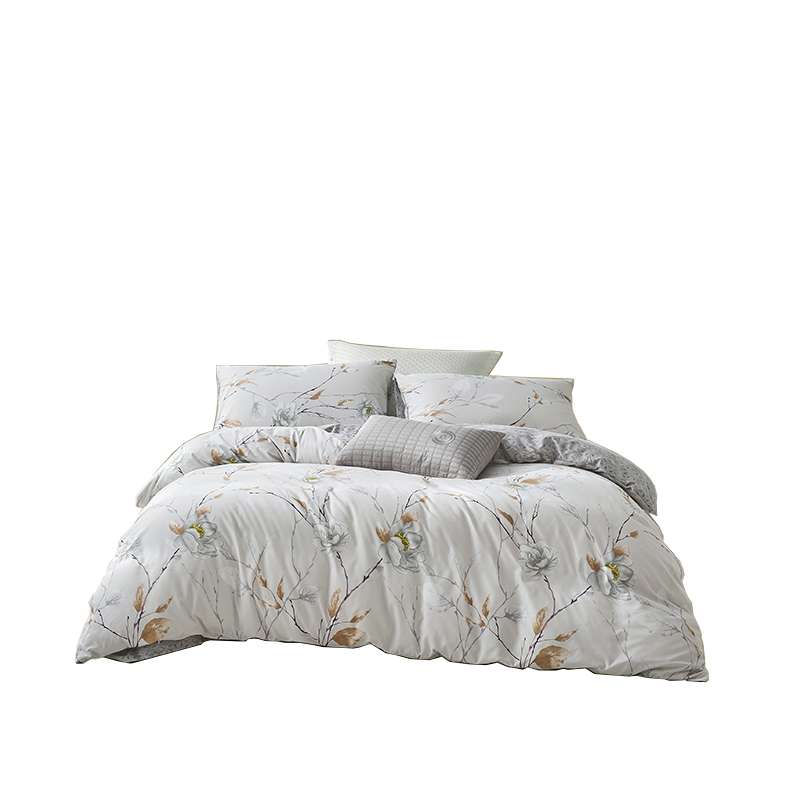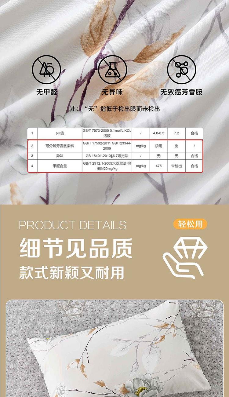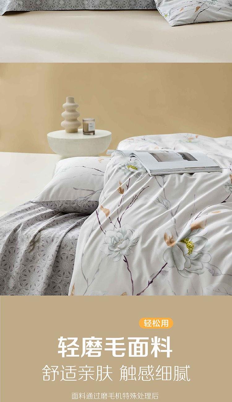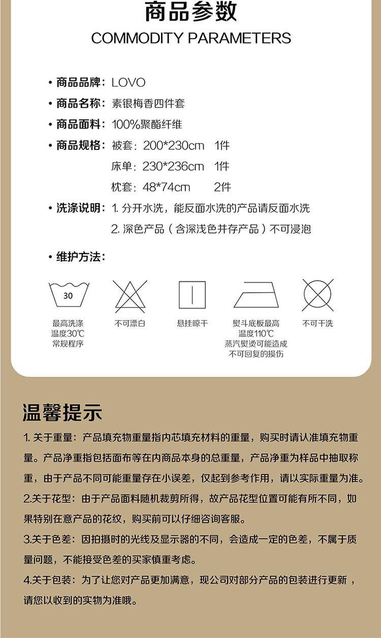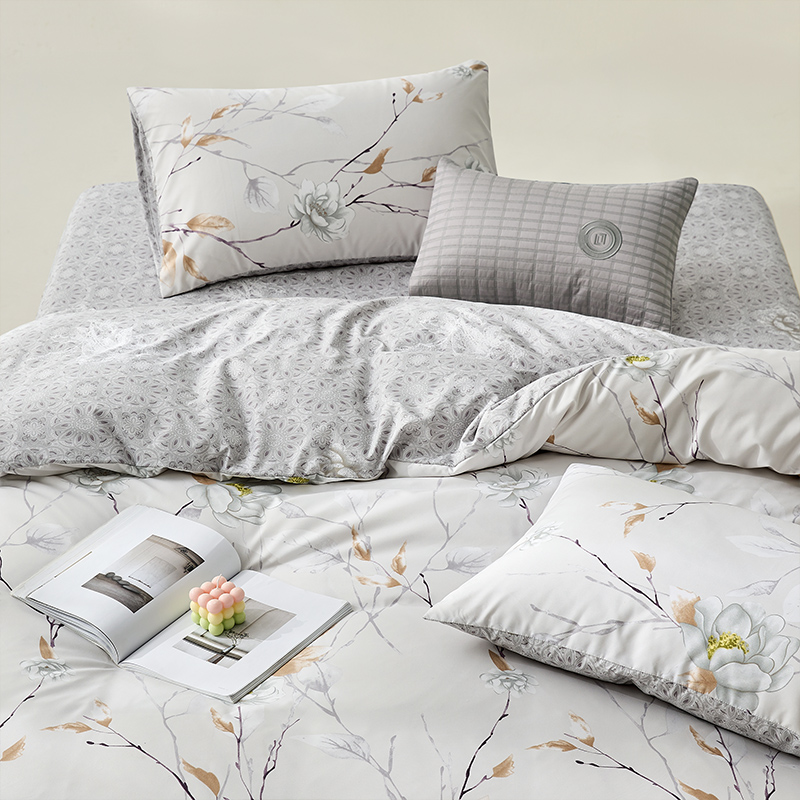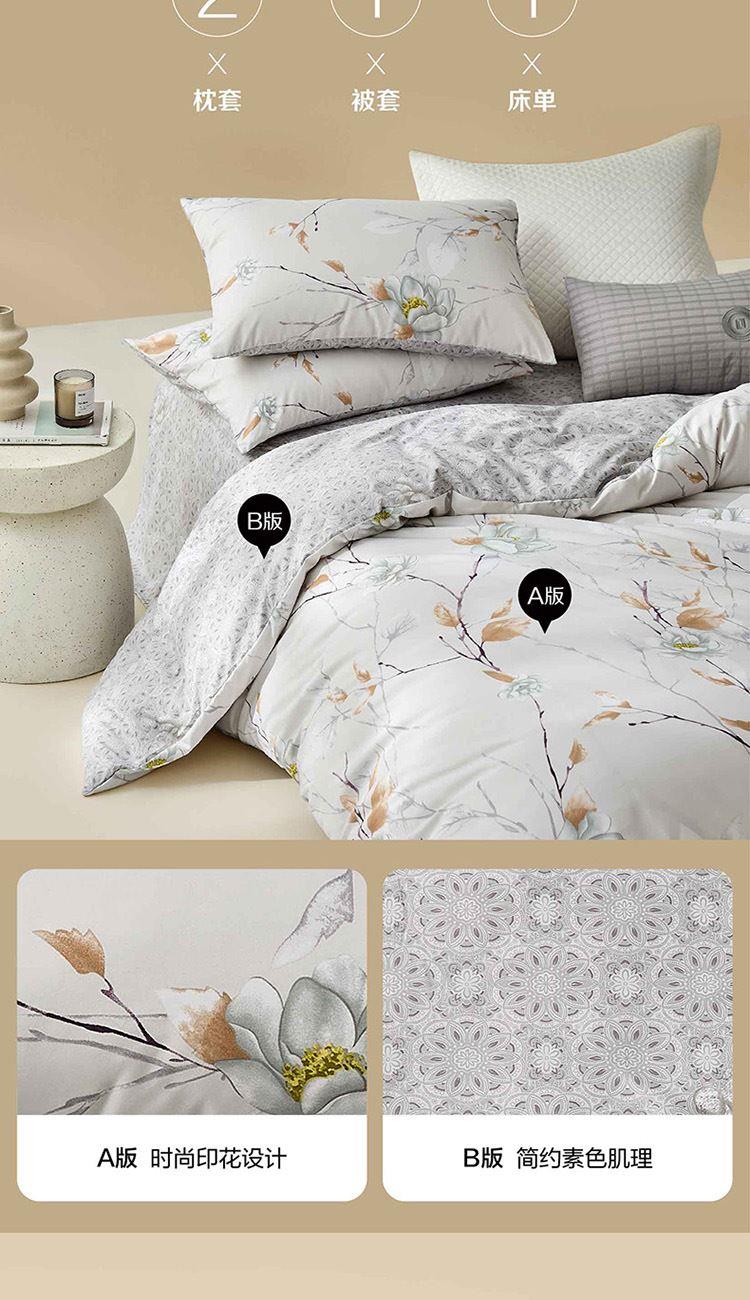 规 格 :200*230cm 被 套 :200*230(cm)*1 被 单 :230*241(cm)*1 枕 套 :48*74(cm)*2 面 料 :磨毛印花(聚酯纤维) 包 装 :礼盒包装 银灰色底纹配合写意花卉,给人清新淡雅的感觉。同时梅花的写意花设计给人梅花香自苦寒来的励志意境。寓意奋发向上,登高枝的人生境界