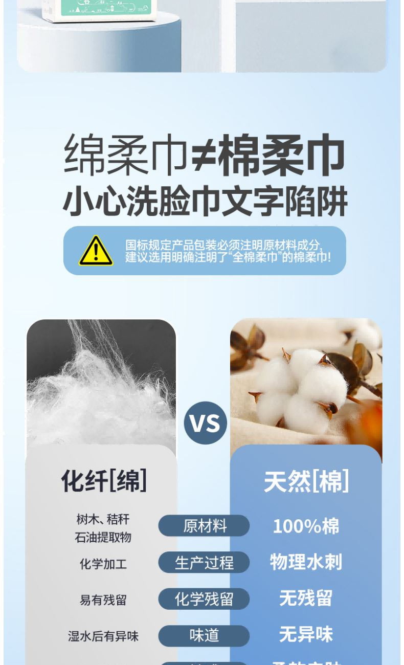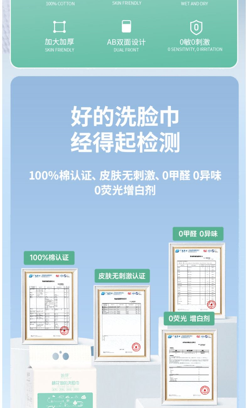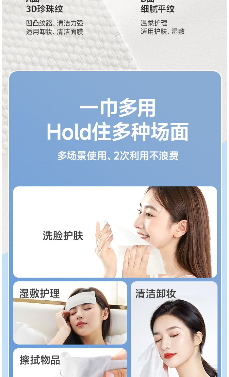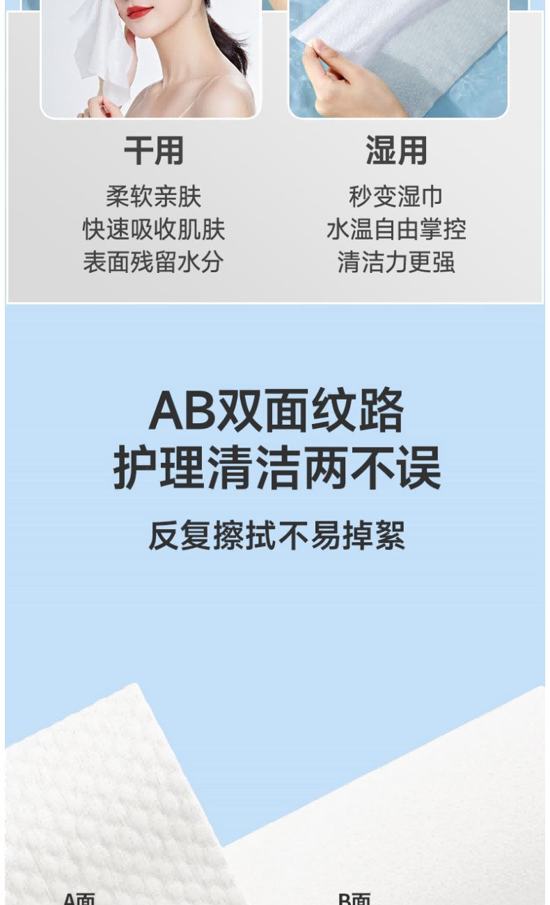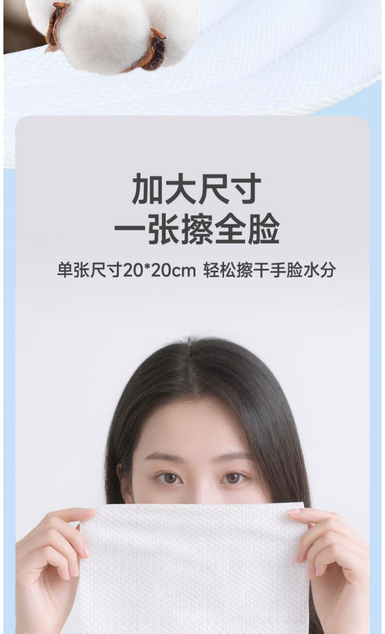 材 质:纯棉 尺 寸:20X20cm 净 含 量:108抽/提*1提 克 重:70g 核心利益点: 1、纯棉,无添加,不易掉毛,不易掉絮。 2、加大加厚(对比市场纯棉珍珠纹款)。 产品区隔点 : 双面纹理,悬挂式省空间家庭装。