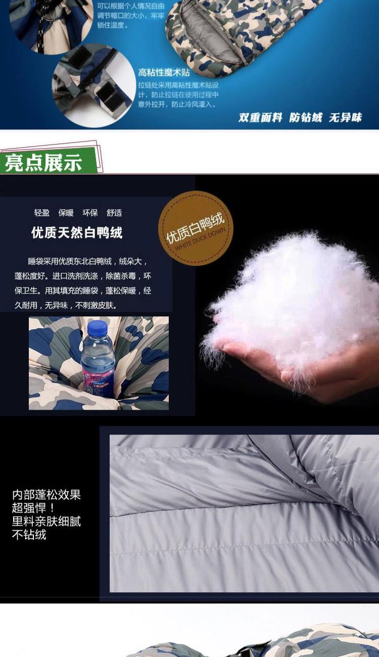 材质:320T抗撕裂尼龙格子布 填充:800克羽绒 颜色:迷彩 规格:210*80cm 重量:1.6kg/条