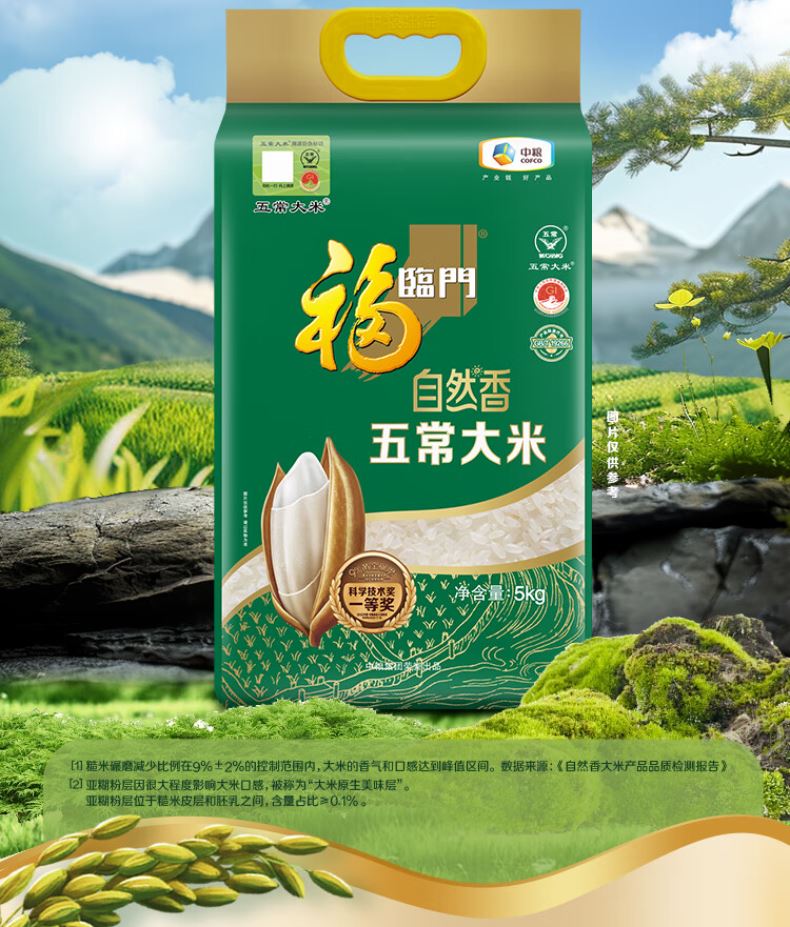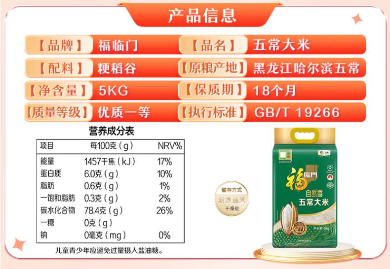 净含量:5kg 条形码:6944910318005 开票税率:9% 产品卖点: 中粮福临门出品,26道工序精控,一级米质,专属检测加持,核心产区种植,颗粒饱满均匀,熟饭米香浓郁,软韧弹牙,煮粥煮饭皆佳。