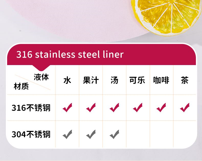 容量:500ml 尺寸:8*8*18.5CM 材质:PP、硅橡胶、内胆:316材质 外壳:304材质 卖点: ①一盖双饮,吸管&直饮不设限 ②密封锁扣,防止误触 ③6层锁温,12小时长效护航 ④316不锈钢入口倍感安心,优选食物接触用不锈钢材质 ⑤便携提手精美背带,可拆卸、一握即轻,便携由心 ⑥密封不漏水360°任意倒置,内置密封防漏圈,有效防漏,安心使用 ⑦圆润杯口、防滑杯垫、背带设计