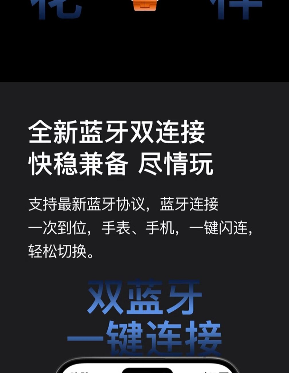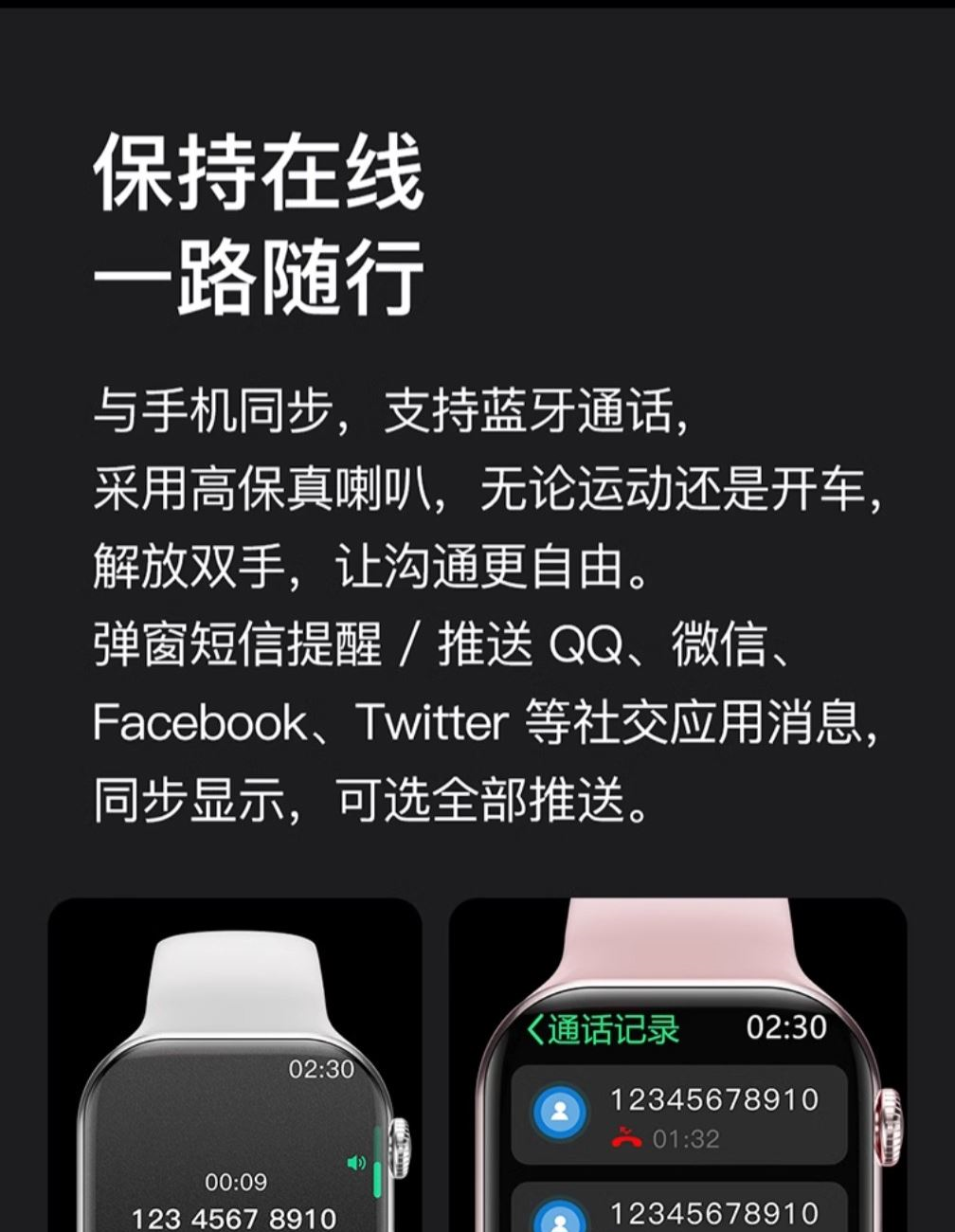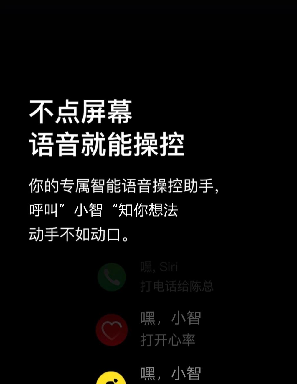 1.更大更薄功耗更低,屏显区域升级,全新一代全面屏4面窄边设计,突破厚重边框带来; 2.防尘防水,抗摔耐刮,超抗摔, 3.不点屏幕语音就能操控,智能语音操控助手,”小智“知你想法动手不如动口。 4.手机同步,支持蓝牙通话,采用高保真喇叭,无论运动还是开车解放双手,让沟通更自由。弹窗短信提醒/推送 QQ、微信、Facebook、Twitter 等社交应用消息同步显示,可选全部推送. 5.全新蓝牙双连接快稳兼备 ,蓝牙连接一次到位,手表、手机,一键闪连,轻松切换。 6.NFC门禁一表搞定,双支付全新开启,智能相机控制。
