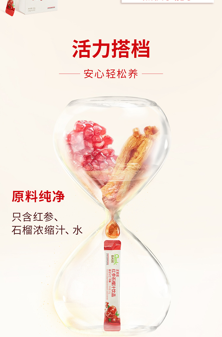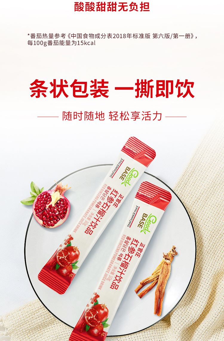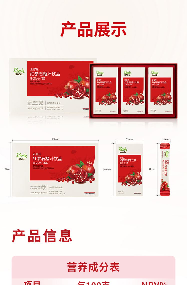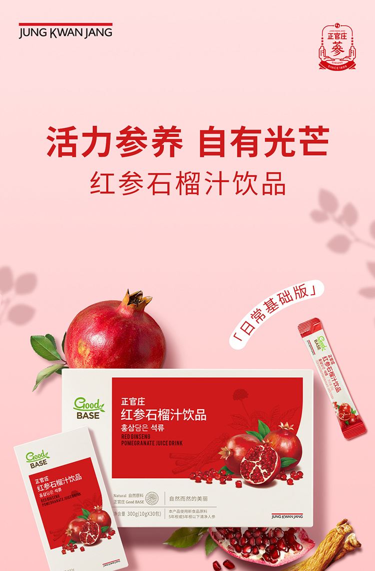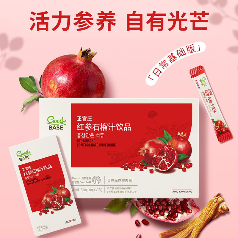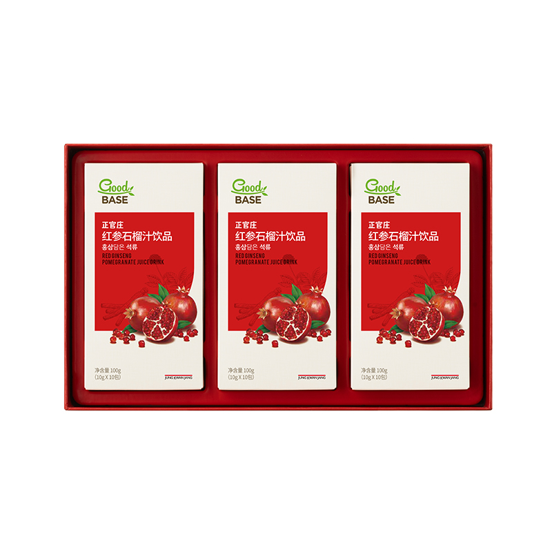 【规格】:300g/盒(10g*30包) 【保质期】:24个月 【食用方法】:每日1次,每次1包。 清净红参遇上进口石榴,沿用正官庄一百二十余年 的红参研发制造技术。每包产品含约有石榴四分之一个, 可轻松简便地享受石榴中的营养成分。