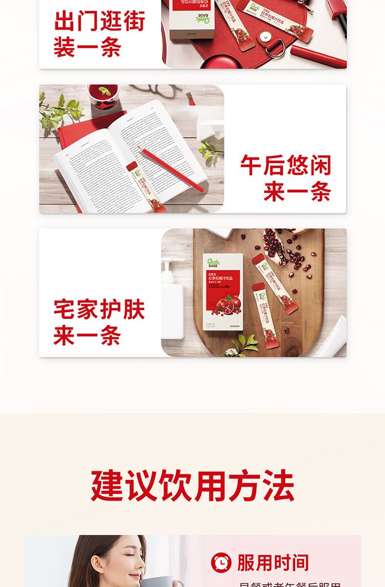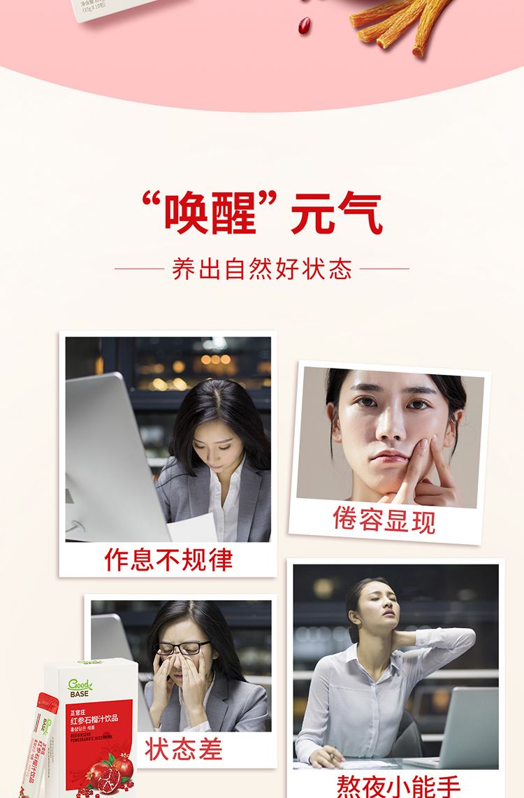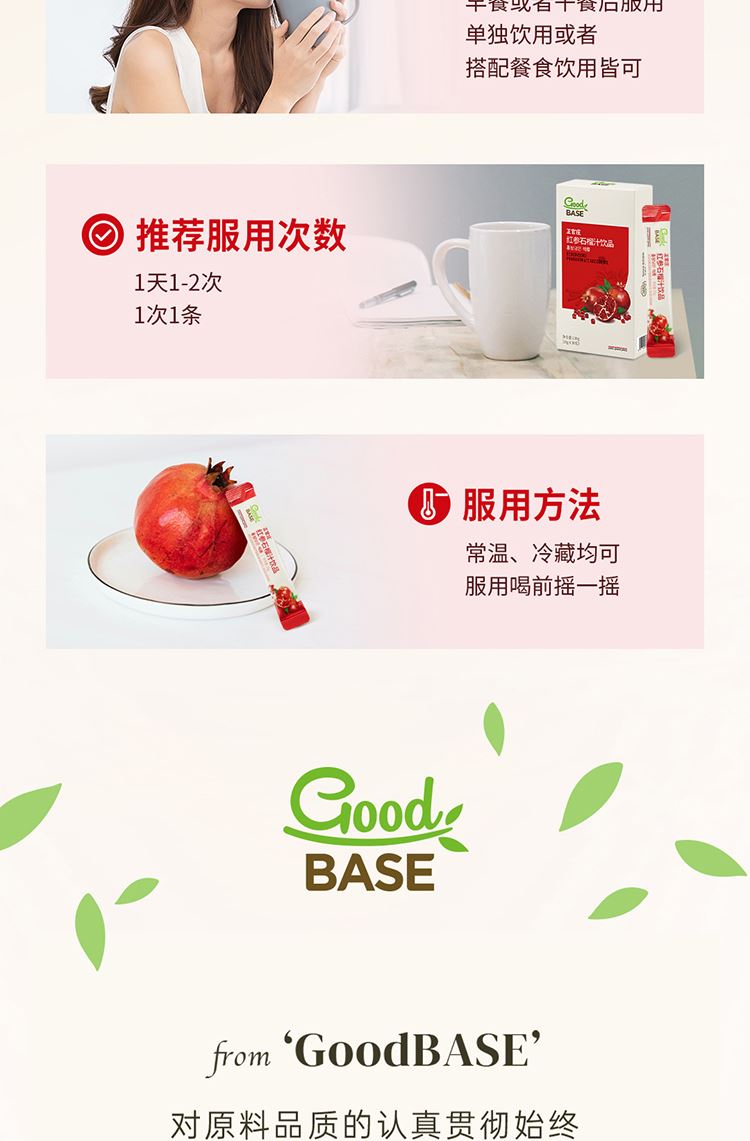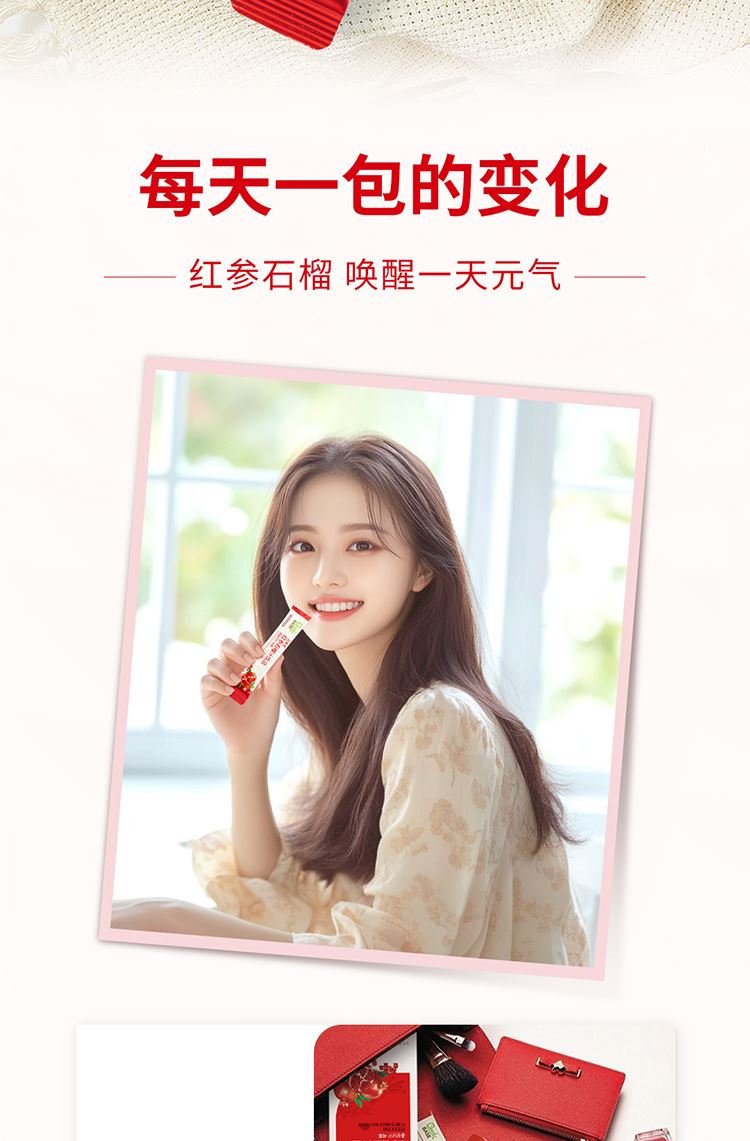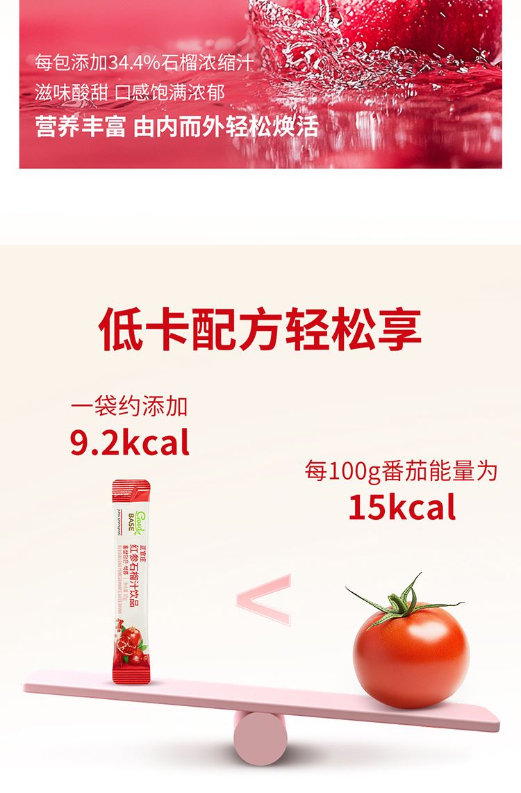 【规格】:300g/盒(10g*30包) 【保质期】:24个月 【食用方法】:每日1次,每次1包。 清净红参遇上进口石榴,沿用正官庄一百二十余年 的红参研发制造技术。每包产品含约有石榴四分之一个, 可轻松简便地享受石榴中的营养成分。