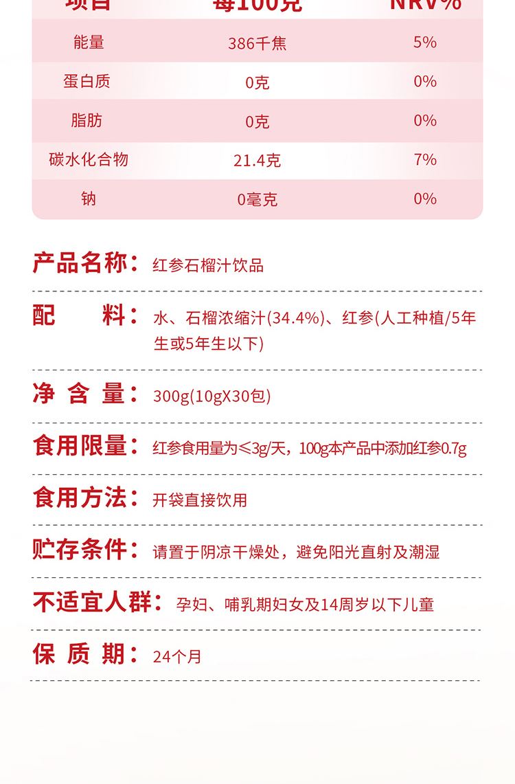 正官庄人参红参石榴液饮300g(10g*30包)杨紫同款