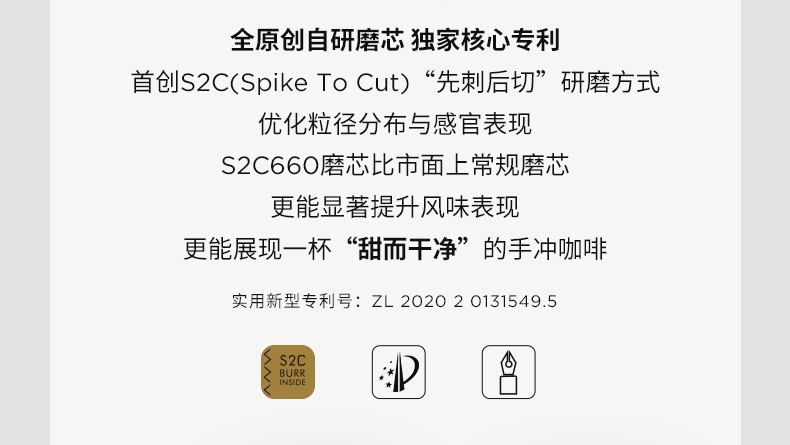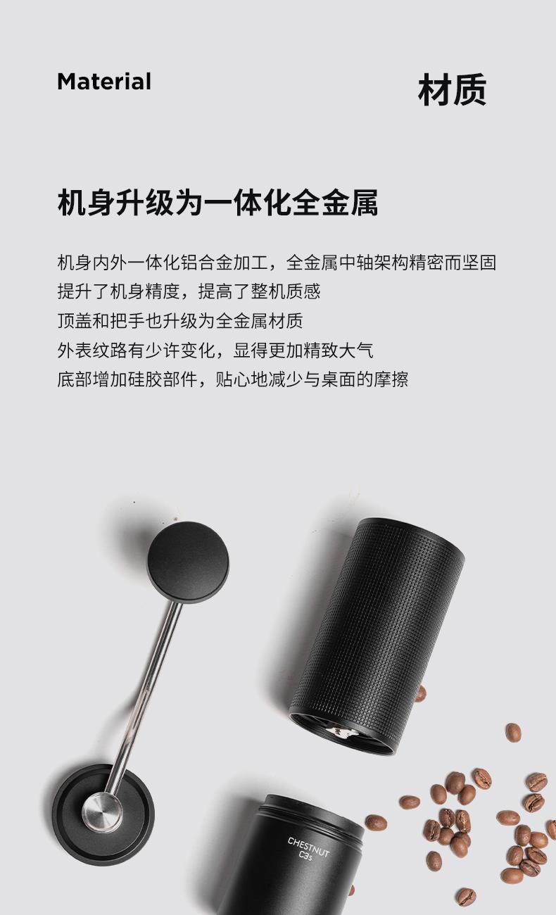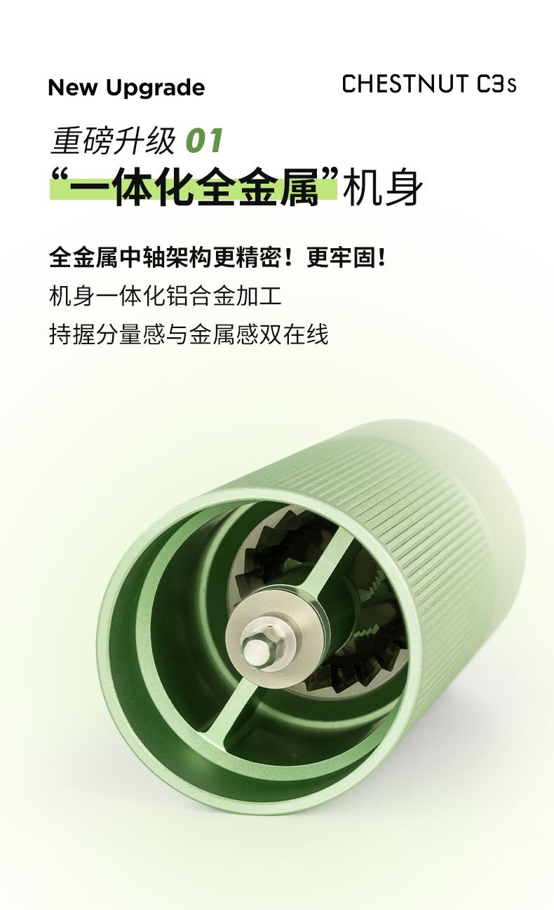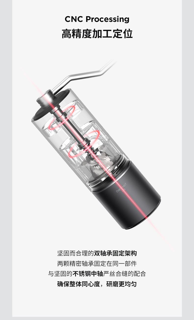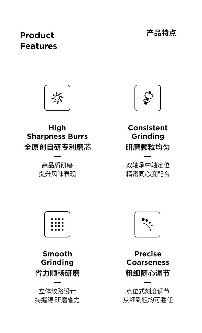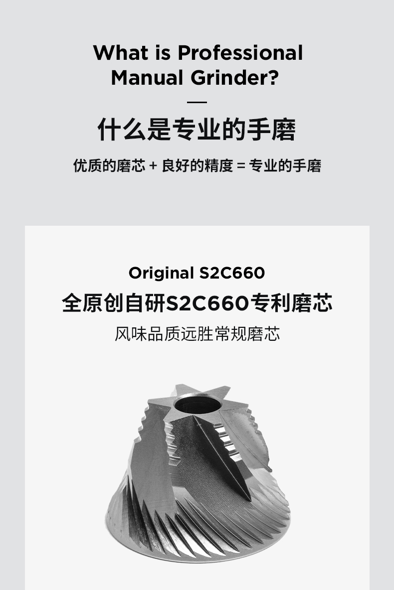 容量:约 25g咖啡豆 重量:约 430g 产品材质:铝合金+不锈钢+PC 产品尺寸:机身147mmx52mm 手柄159mm 研磨均匀度大幅提升风味品质远胜常规磨芯 原创S2C660磨芯,均匀萃取,甜而干净 点位式粗细度调节器,可量化的调节粗细度、可满足意式、摩卡、手冲、虹吸、法压等各种器具所需粗细度研磨