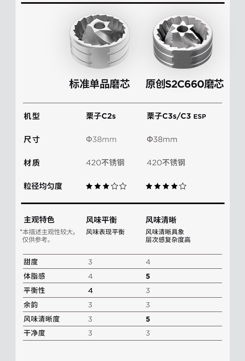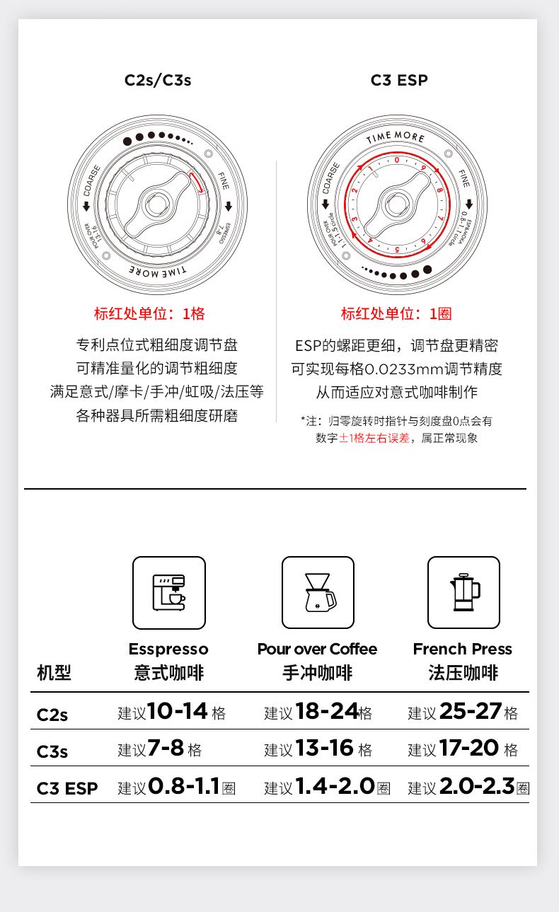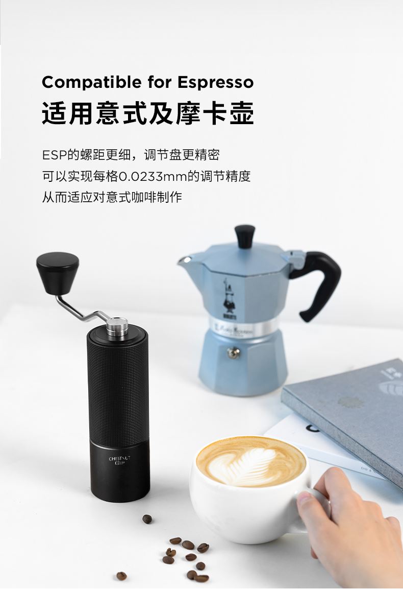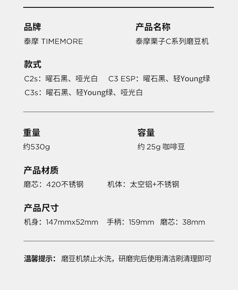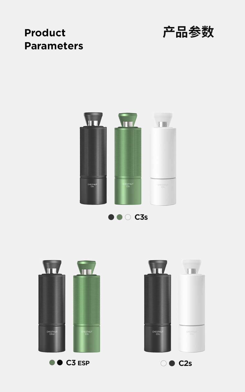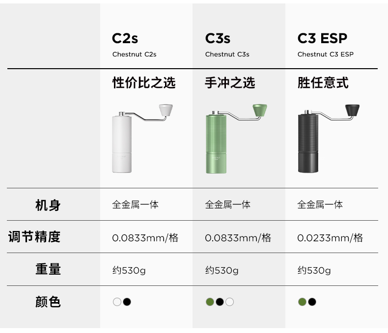 容量:约 25g咖啡豆 重量:约 430g 产品材质:铝合金+不锈钢+PC 产品尺寸:机身147mmx52mm 手柄159mm 研磨均匀度大幅提升风味品质远胜常规磨芯 原创S2C660磨芯,均匀萃取,甜而干净 点位式粗细度调节器,可量化的调节粗细度、可满足意式、摩卡、手冲、虹吸、法压等各种器具所需粗细度研磨