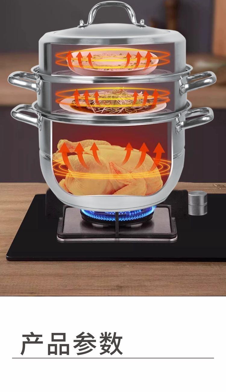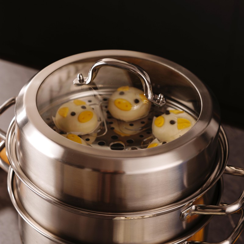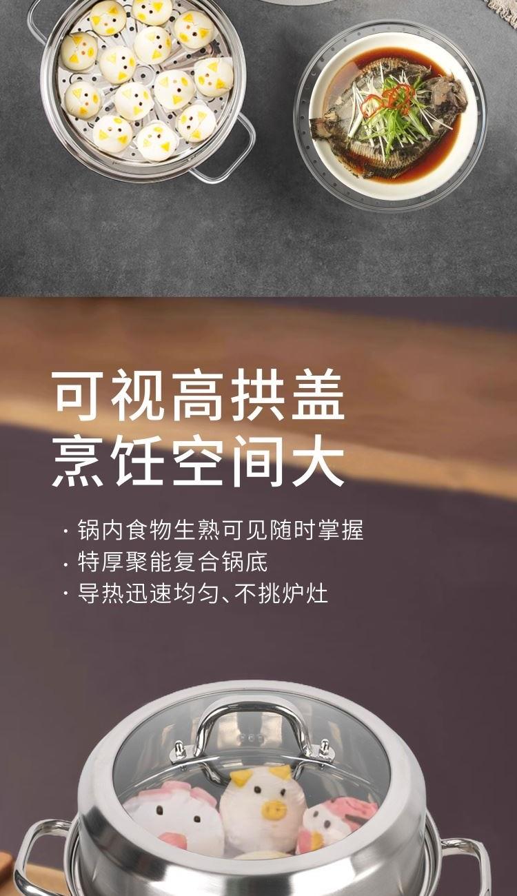 口径:30cm 产品净重:2.1kg 产品毛重:2.9kg 整箱毛重:22.5kg 产品尺寸:385 ⅹ 305 ⅹ 378mm 彩盒尺寸:339 ⅹ 188 ⅹ 309mm 外箱尺寸:710 ⅹ 420 ⅹ 650mm 条形码:6978519510058 材质:304不锈钢、钢化钢化玻璃 1、大视窗玻璃高拱锅盖,空间大,锅内食物生熟可见方便掌握; 2、特厚蒸片,导流不积水; 3、特厚聚能复合锅底,导热迅速均匀不挑炉灶,受热均匀,防止局部过热不糊底,长期使用不易发黄发黑; 4、食品级304不锈钢材质,防锈耐腐蚀; 5、整锅加高,空间大蒸更多,聚能立体循环加热,蒸煮同步更省时; 6、加厚全钢手柄,全钢一体成型锻造,手柄中空设计,高效隔热防烫,提拿舒适稳固。