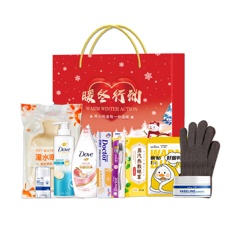 礼盒尺寸:32*8.5*24.5cm 包装尺寸:66*46.5*51CM 产品配置:(香型随机) 多芬洗发水(400ml) 多芬沐浴露(300ml) 海氏海诺凡士林防裂棒(40ml) 海氏海诺凡士林润护膏(100ml) 牙博士牙膏(105g) 牙博士牙刷 海氏海诺好暖鸭暖贴(1片装/袋)*5袋 暖水袋(500ml) 保暖手套(五指触屏) 李时珍蒸汽眼罩(5片/盒) 精美礼盒