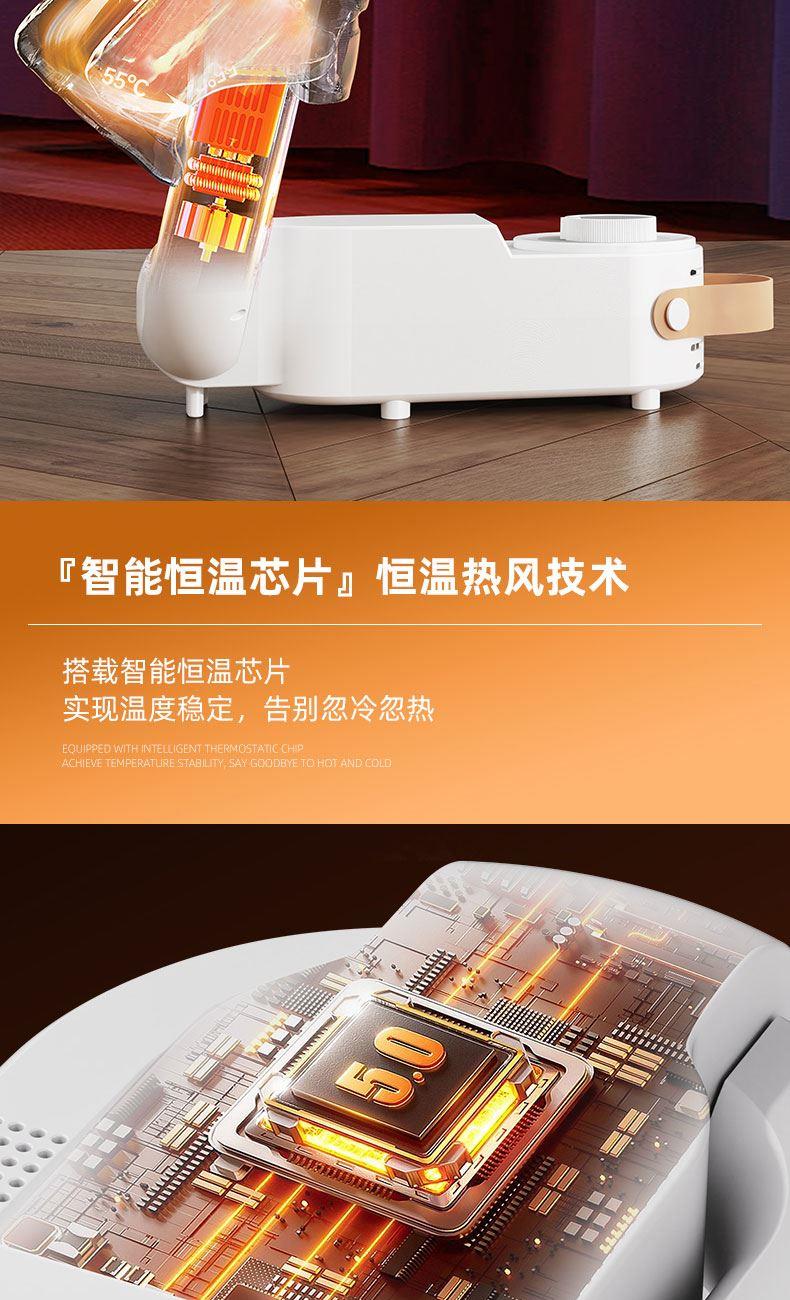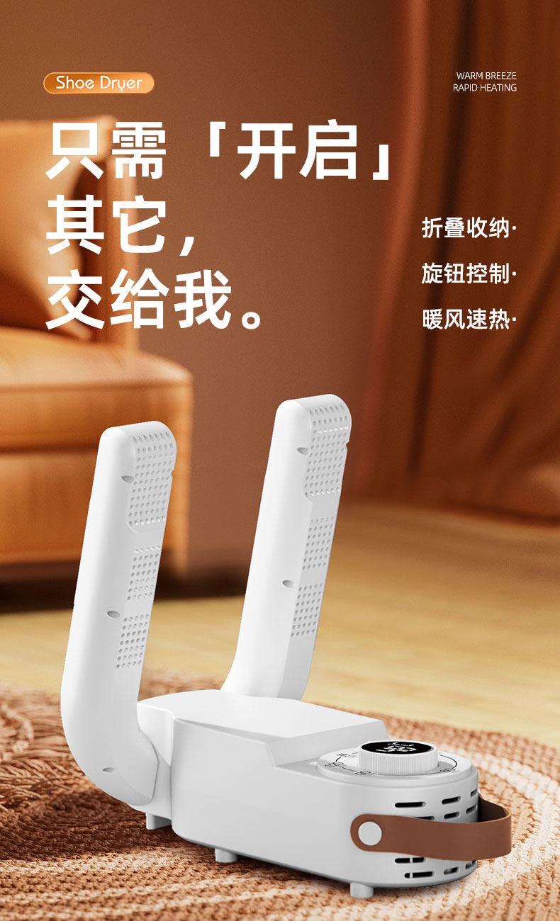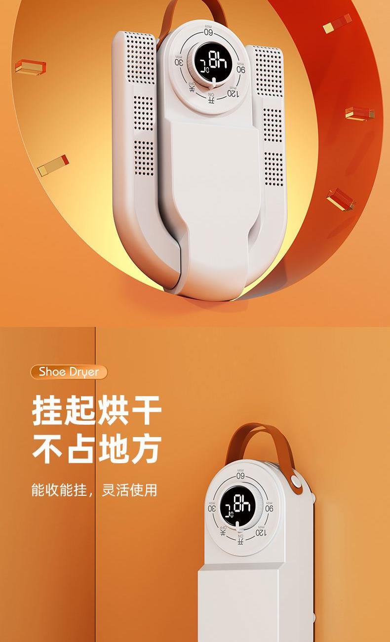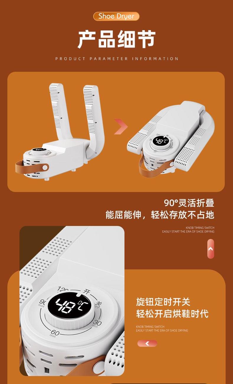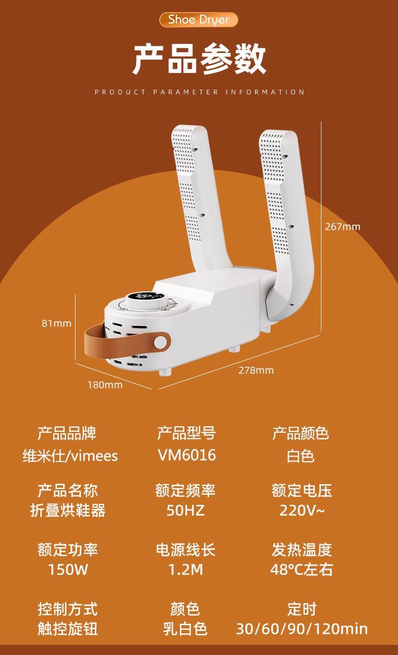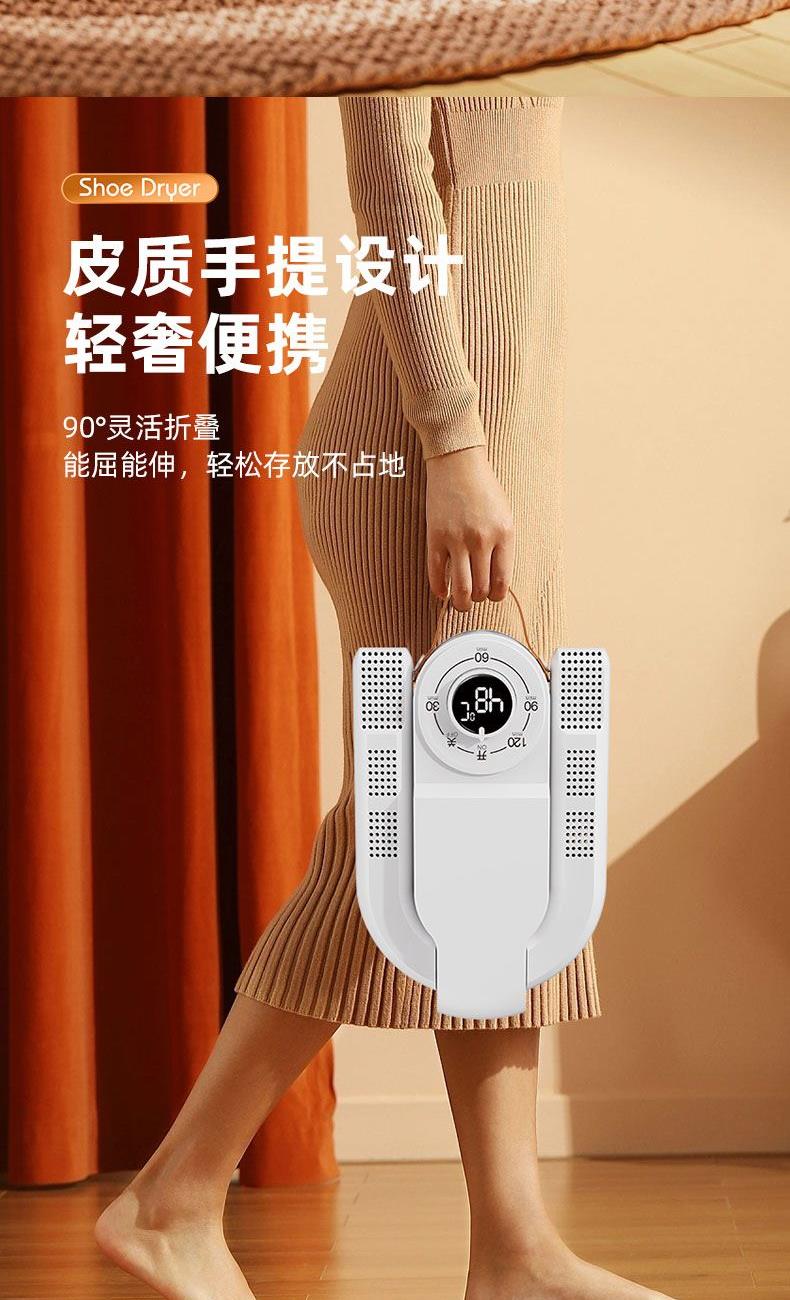 产品:折叠烘鞋器 额定功率:150W 控制方式:触控旋钮 额定频率:50HZ 电源线长:1.2M 颜色:乳白色 额定电压:220V~ 发热温度:48°C左右 定时:30/60/90/120min 产品尺寸:81*180*278mm 1、90度折叠,能屈能伸轻松存放不占地 2、低噪哄鞋不打扰,运行不扰觉 3、360度无死角烘干,均匀制暖,暖意层层包裹 4、旋钮定时控制,安眠一整晚