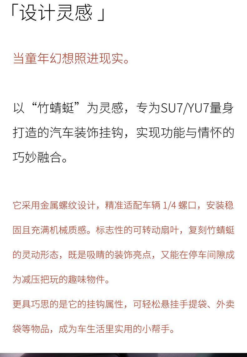 产品尺寸:63*42*24MM 产品重量:9 G 包装尺寸:90*70*50MM 产品材质:铝合金 产品颜色:橙色、银色、黑色、钛灰 产品特点:即是挂钩 也是装饰、小米su7专用挂钩