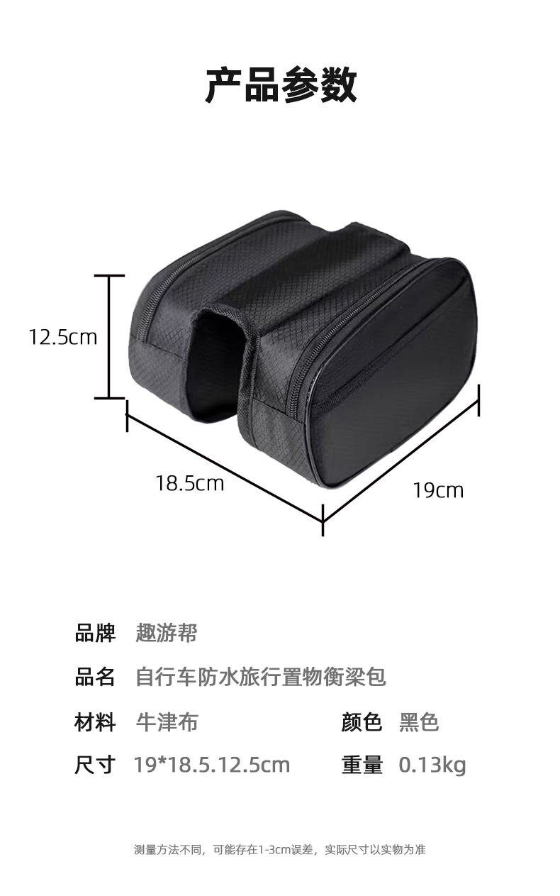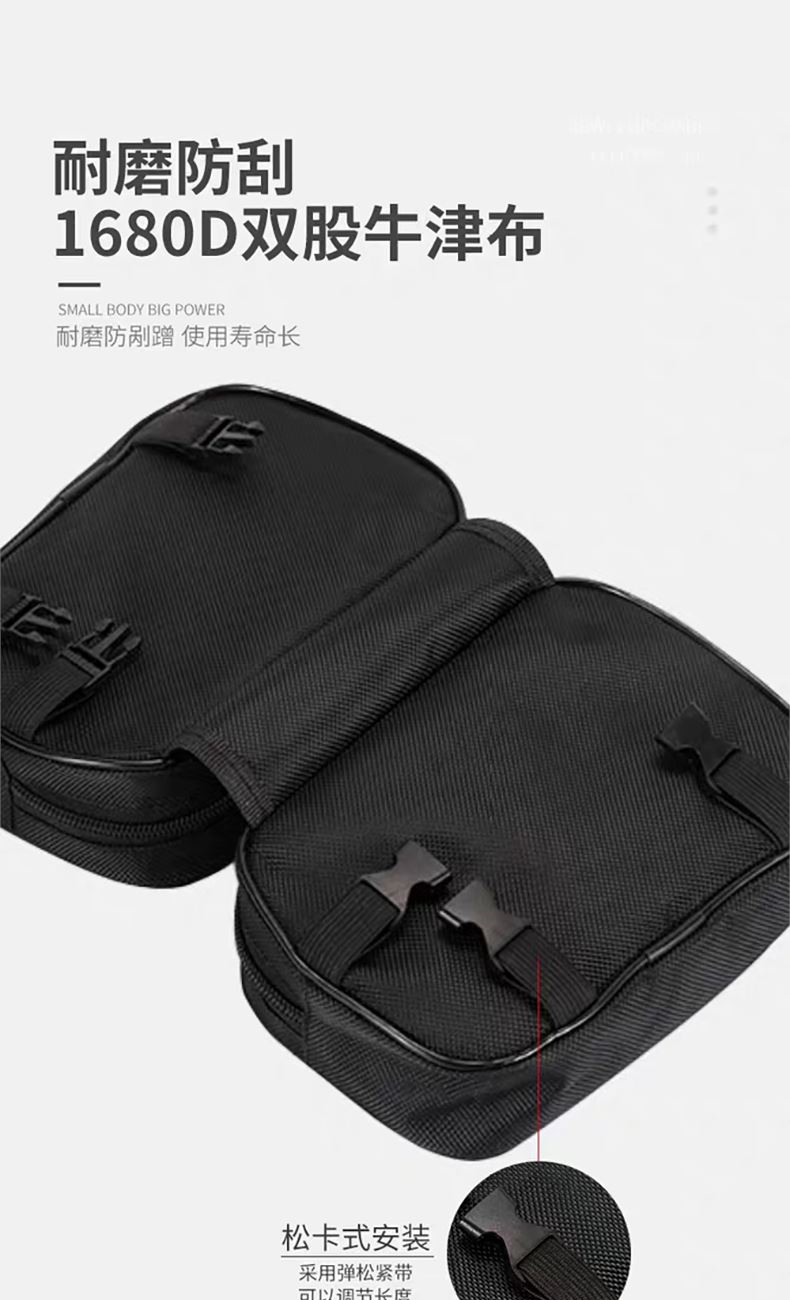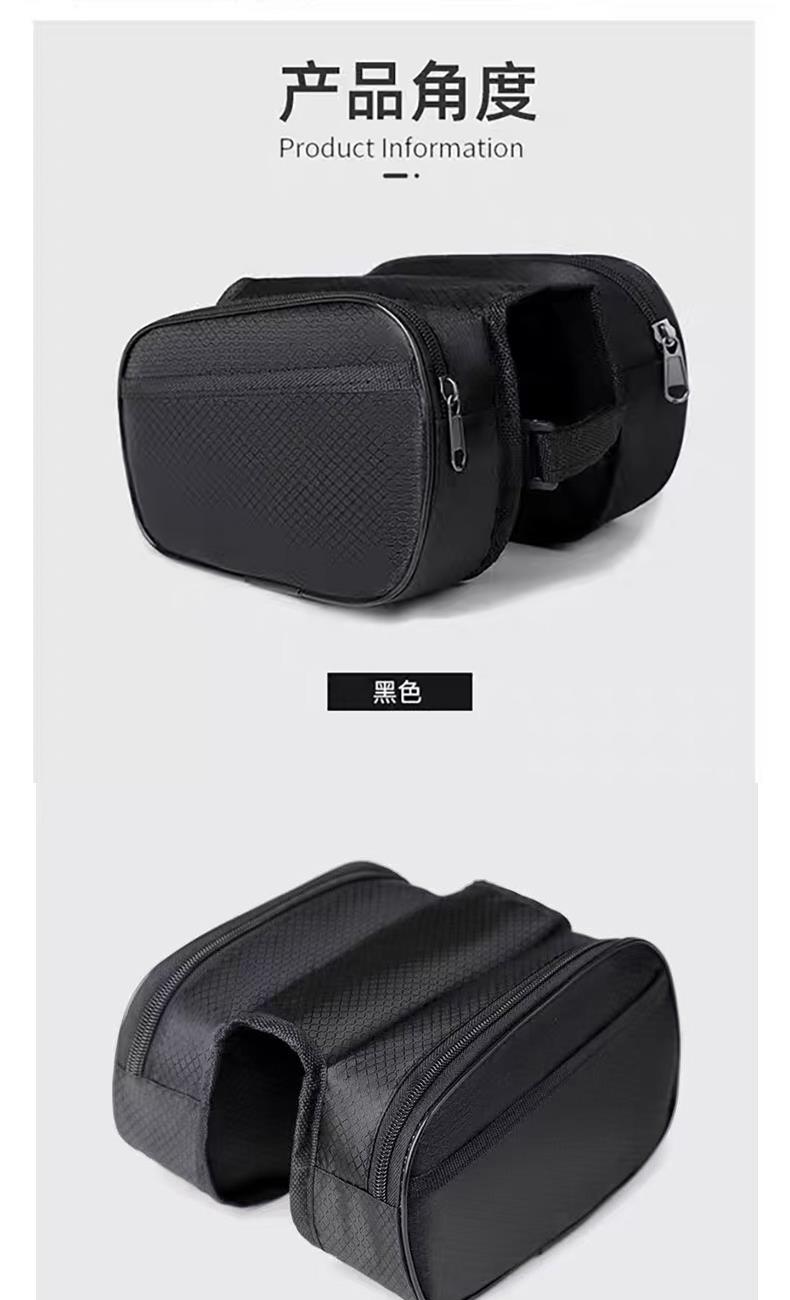 材质 牛津布 颜色 黑色 尺寸 19*18.5.12.5cm (测量方法不同,可能存在1-3cm误差,实际尺寸以实物为准) 重量 0.13kg 左右双仓+中央连接,强力稳固贴合横梁,骑行颠簸不晃动 左右独立双仓设计,轻松分类收纳,存取物品更便捷 高密度牛津布材质,无惧风雨,时刻守护包内物品干爽 抗撕裂耐刮蹭,轻松应对户外骑行挑战 厚实牛津布提供缓冲,骑行颠簸中保护包内易损物品