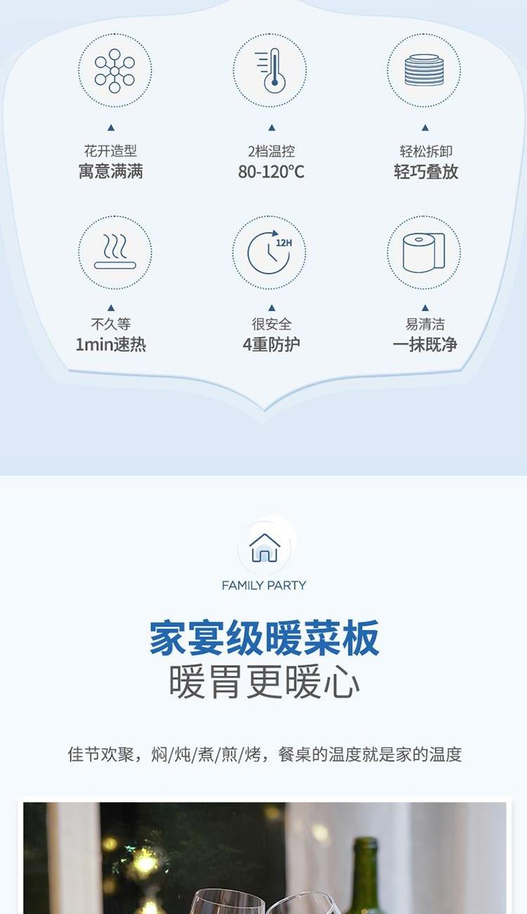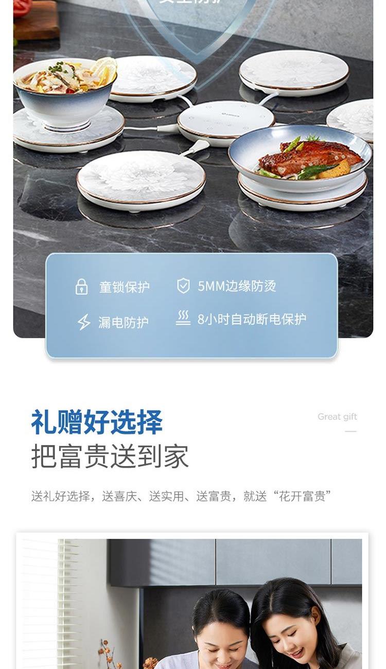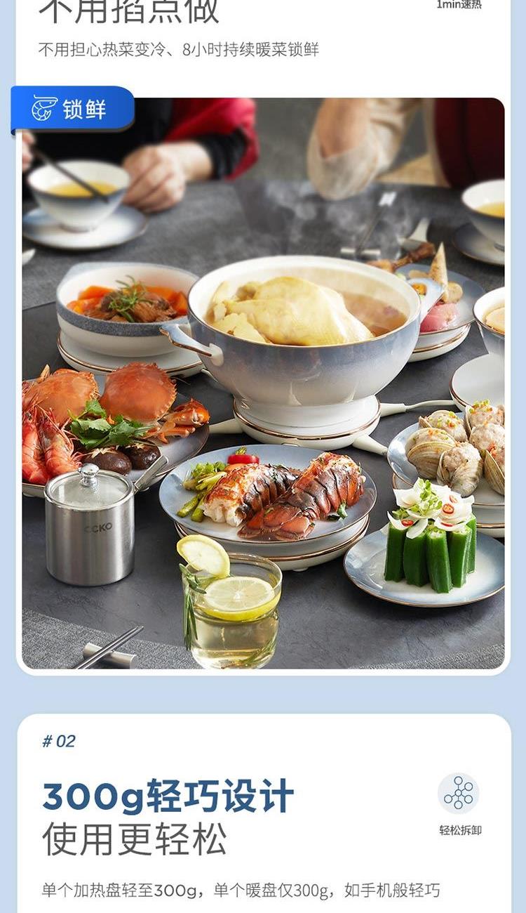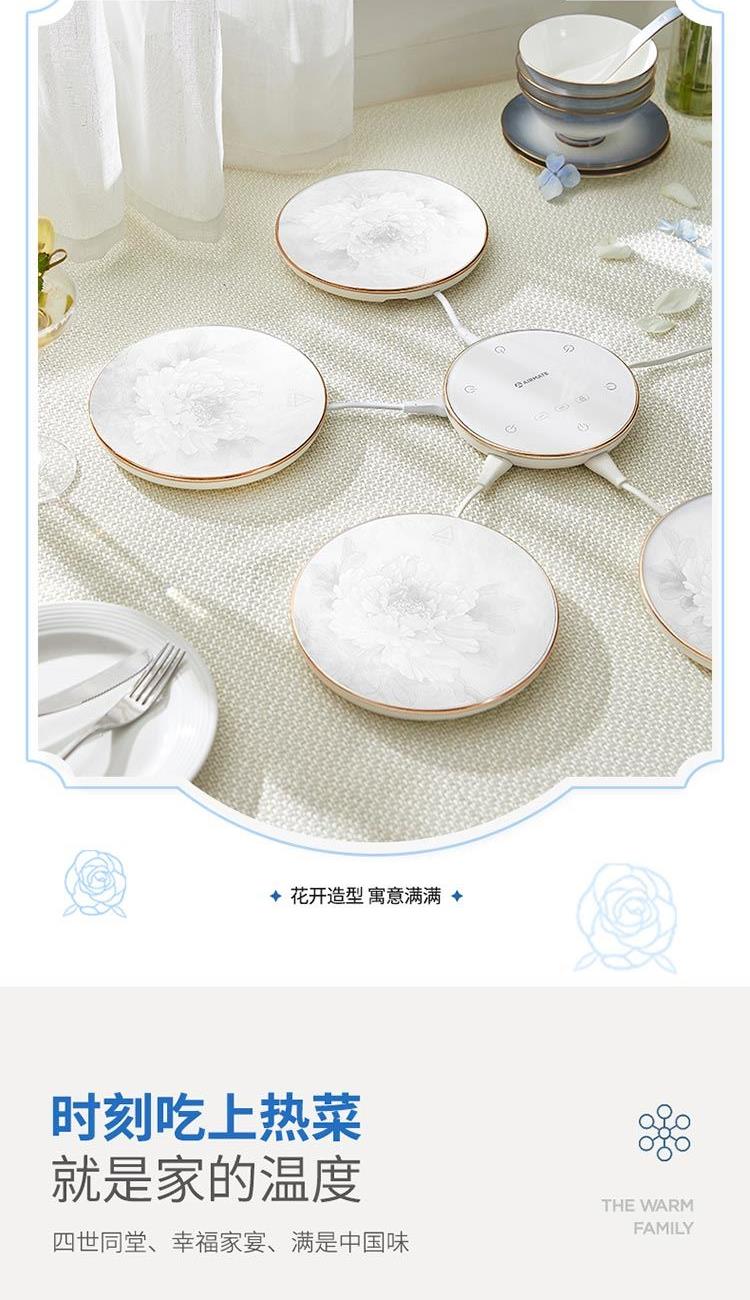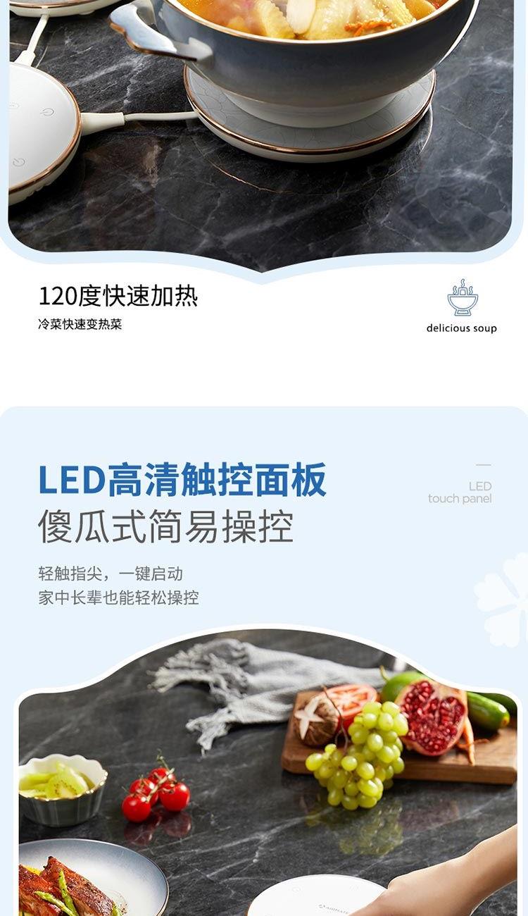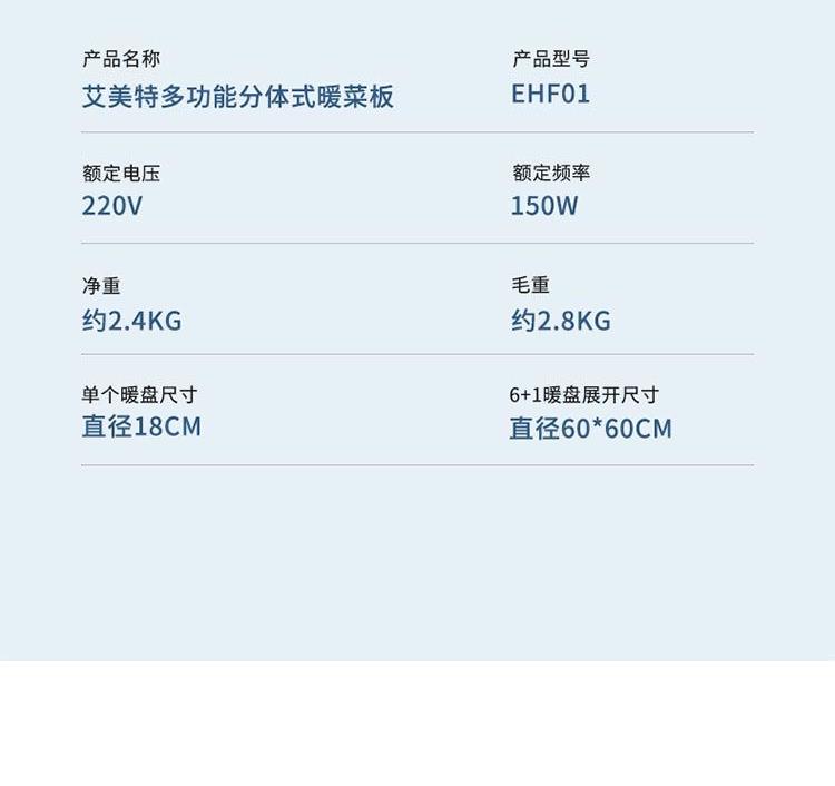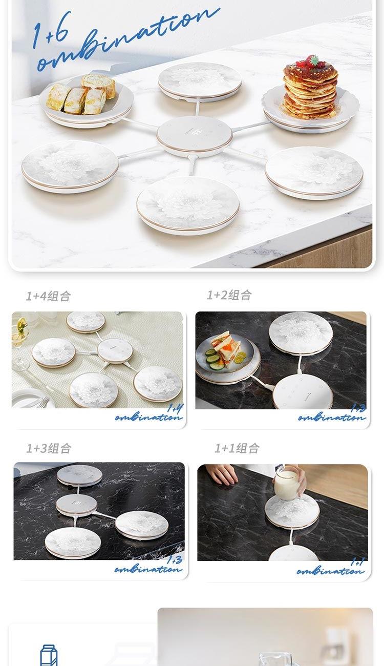 额定电压:220V 额定功率:150W 额定频率:50HZ 控制方式:触屏 单个尺寸:直径18cm 6+1展开尺寸:直径60*60cm 净重/毛重:2.40kg/2.80kg 1、【 独立控制】首创分体式设计,6个加热盘独立控制,灵活拼接使用 2、【两档温度】灵巧拼接智能保温,80度-120度温控,随心调节 3、【可拆卸】轻松拆卸 叠放收纳,不占宝贵的厨房空间 4、【多场景使用】暖菜/暖酒/暖奶/暖茶/解冻等多功能多场景使用 5、【便捷操控】LED高清一键触摸式操控 6、【安全防护】 贴心童锁(防止误触) 7、【自动OFF】连续工作8小时自动关机