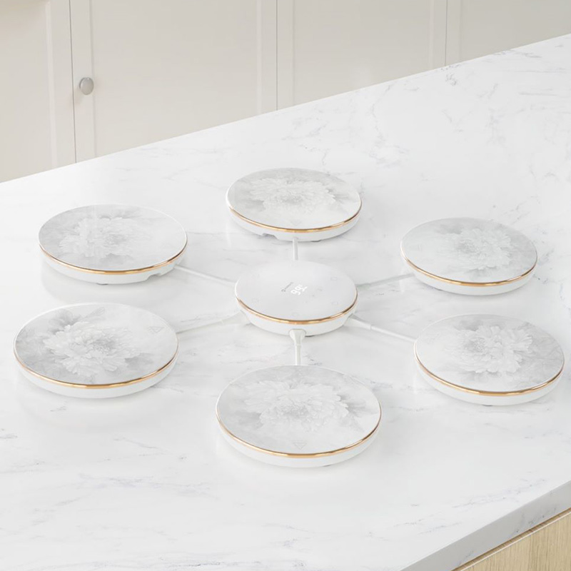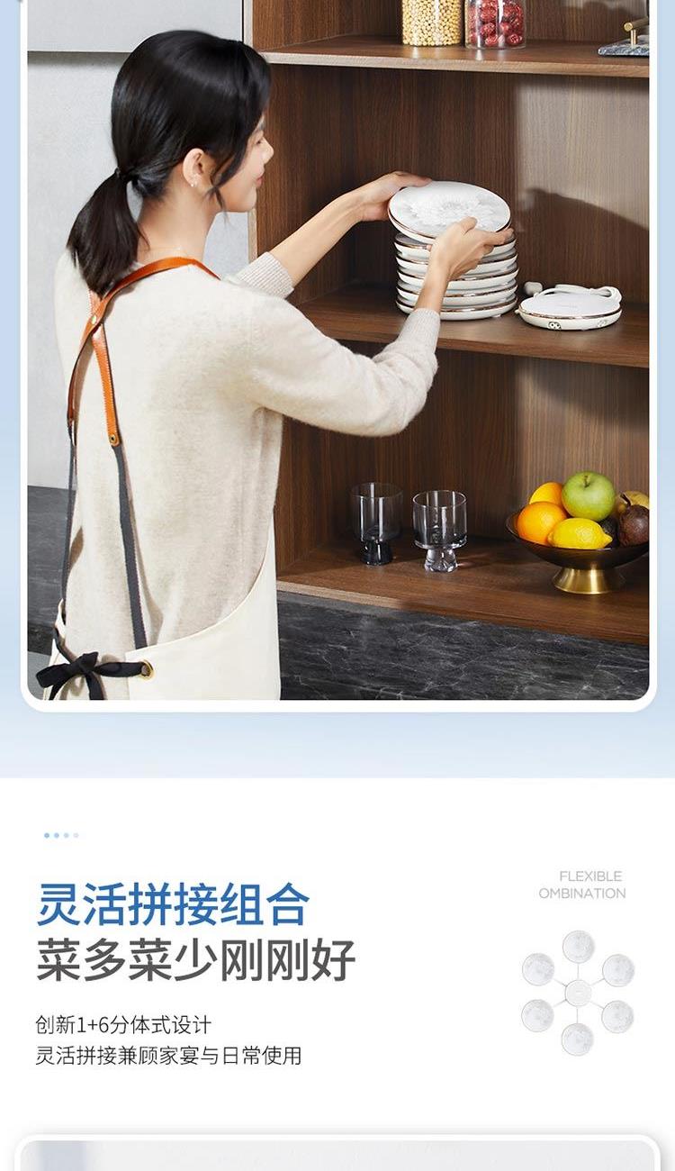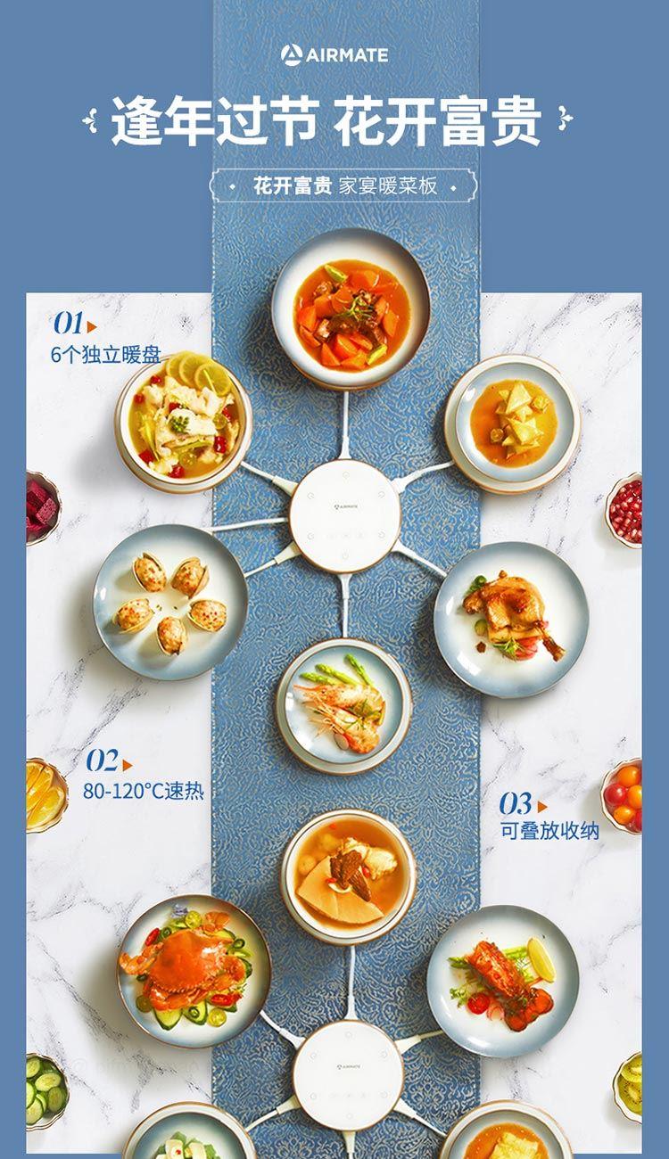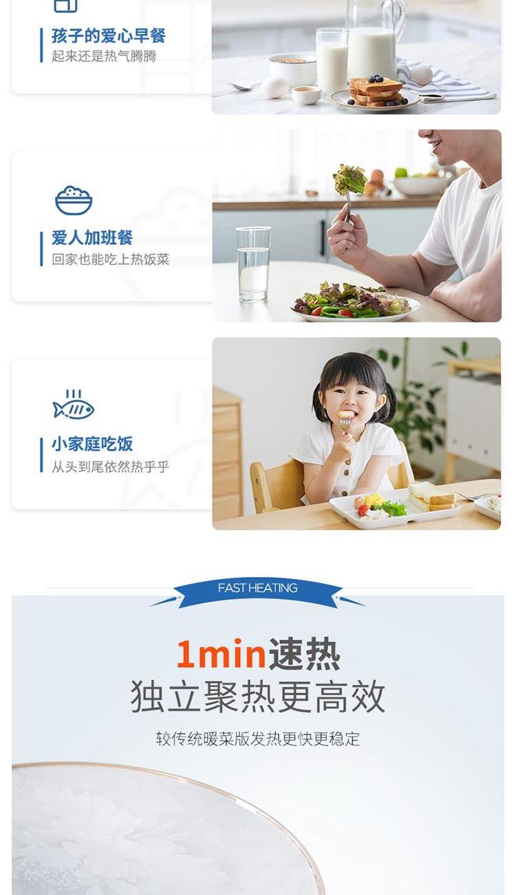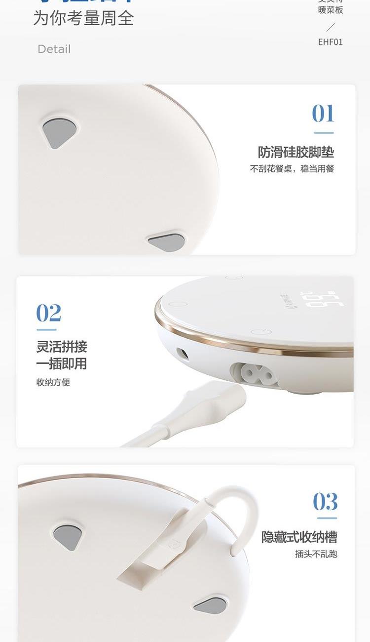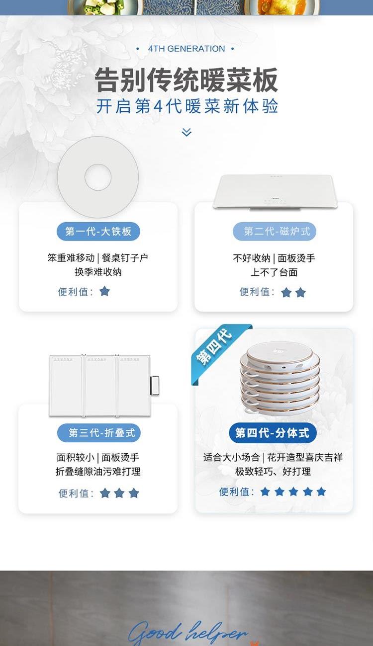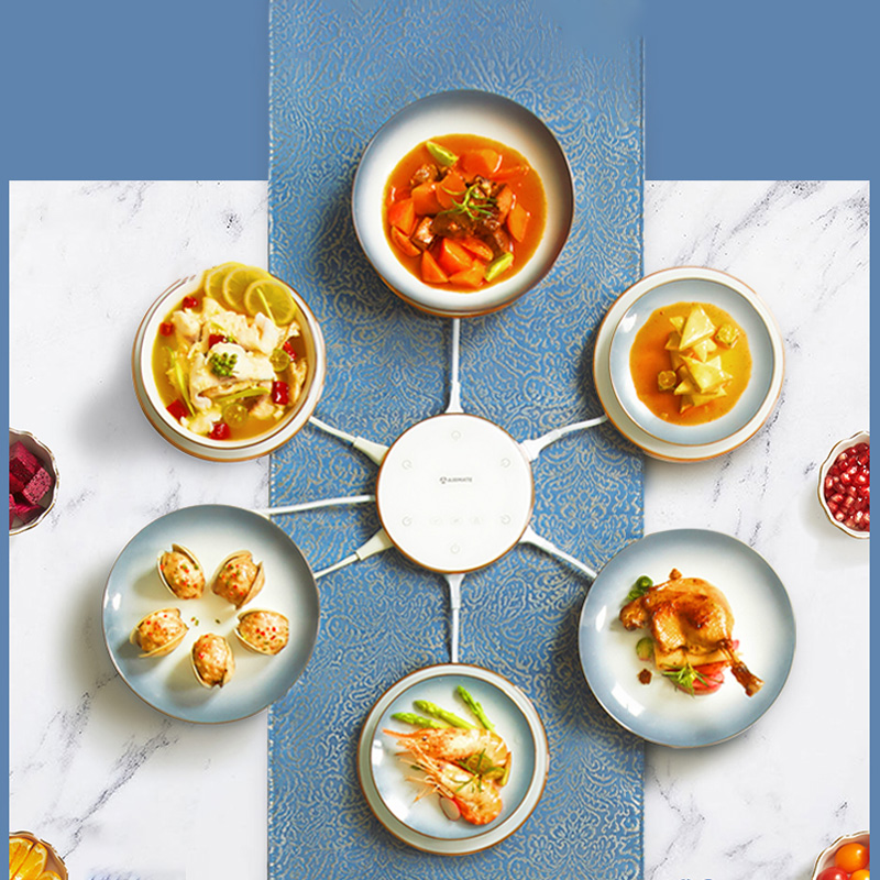 额定电压:220V 额定功率:150W 额定频率:50HZ 控制方式:触屏 单个尺寸:直径18cm 6+1展开尺寸:直径60*60cm 净重/毛重:2.40kg/2.80kg 1、【 独立控制】首创分体式设计,6个加热盘独立控制,灵活拼接使用 2、【两档温度】灵巧拼接智能保温,80度-120度温控,随心调节 3、【可拆卸】轻松拆卸 叠放收纳,不占宝贵的厨房空间 4、【多场景使用】暖菜/暖酒/暖奶/暖茶/解冻等多功能多场景使用 5、【便捷操控】LED高清一键触摸式操控 6、【安全防护】 贴心童锁(防止误触) 7、【自动OFF】连续工作8小时自动关机