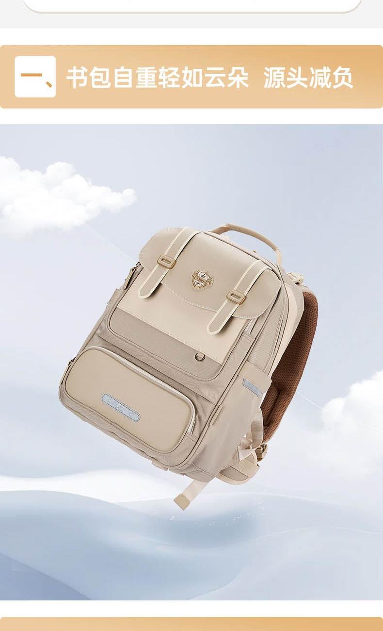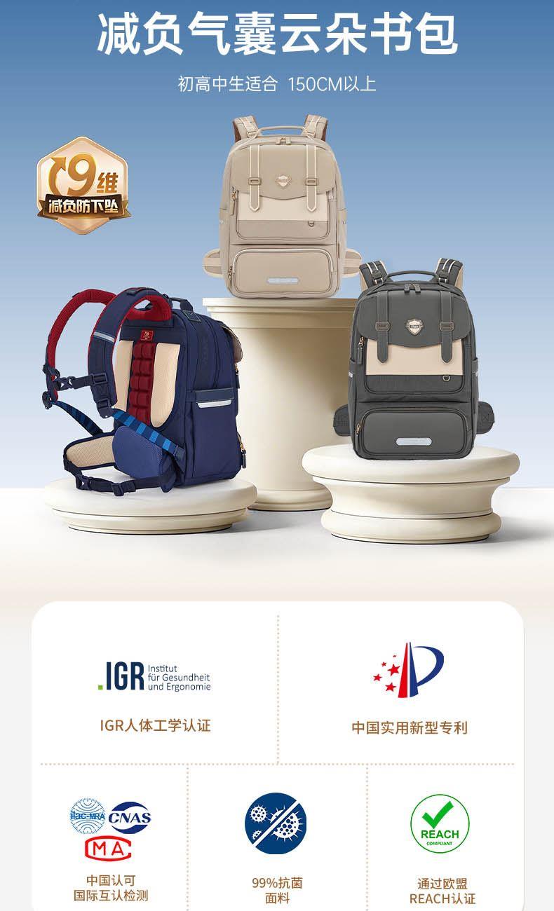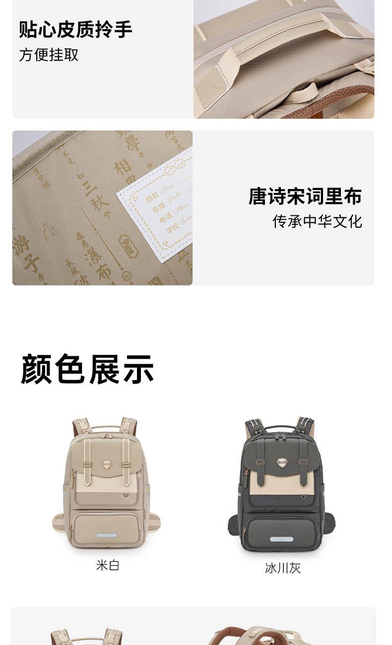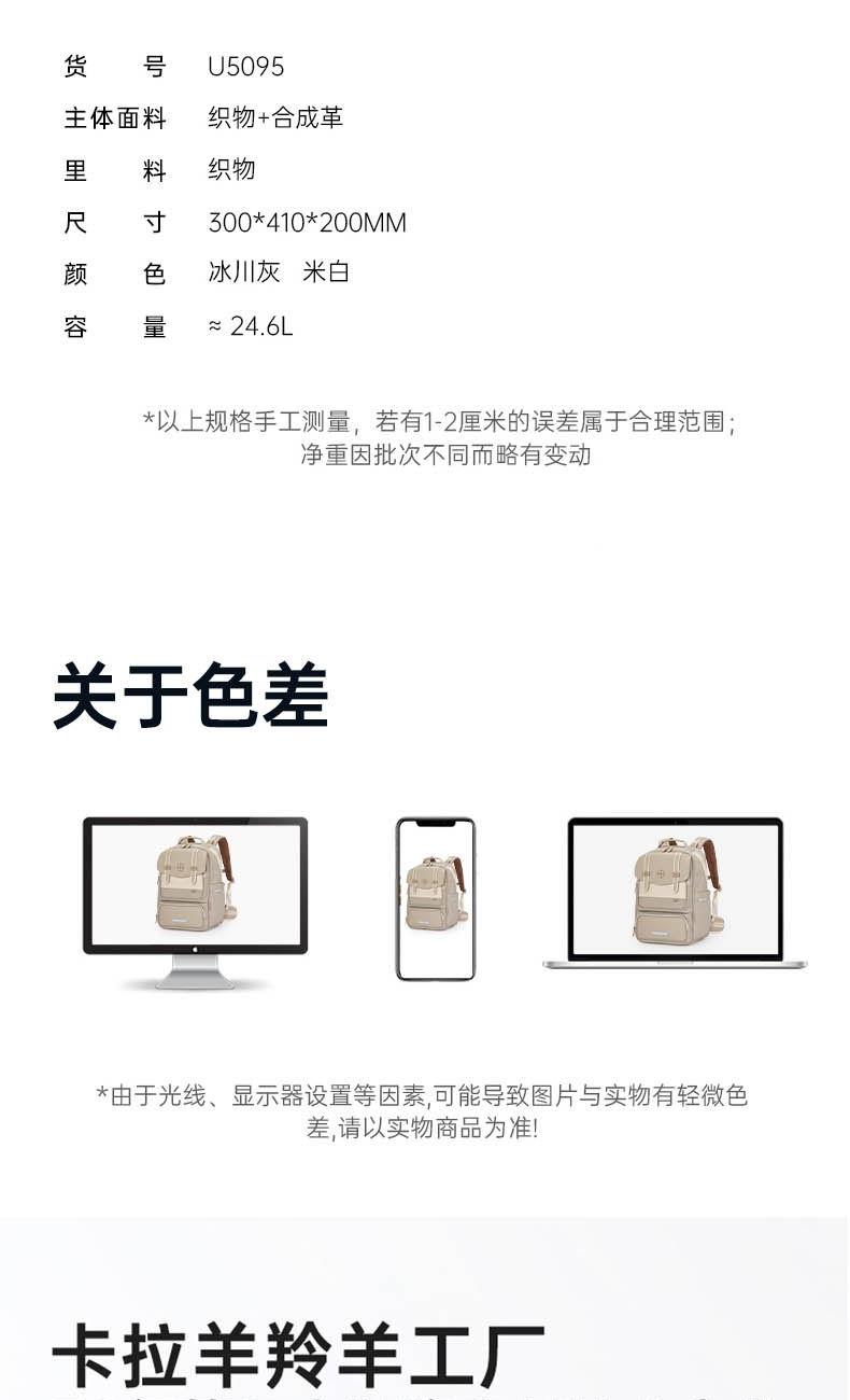 货号:U5095 主体面料:织物+合成革 里料:织物 颜色:米白 冰川灰 定位: 150-175CM以上/初高中功能书包 净重:0.95kg 24.6L
