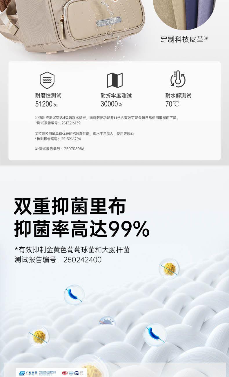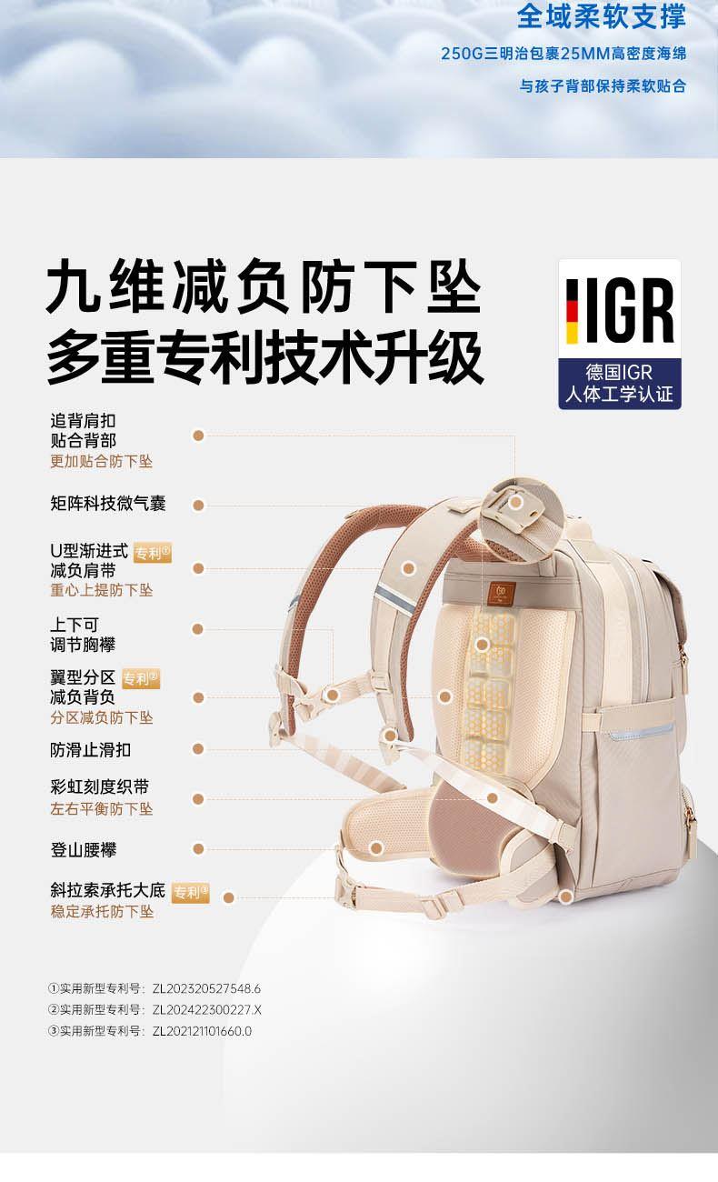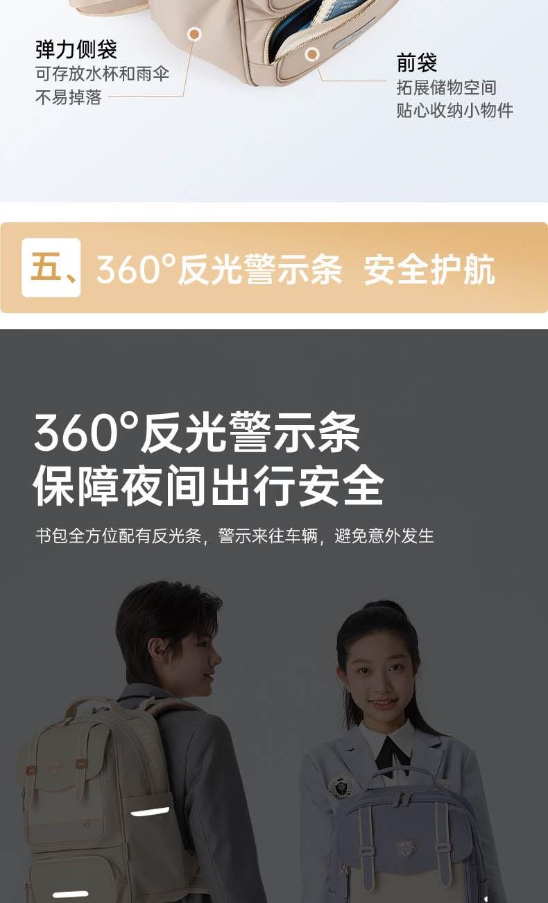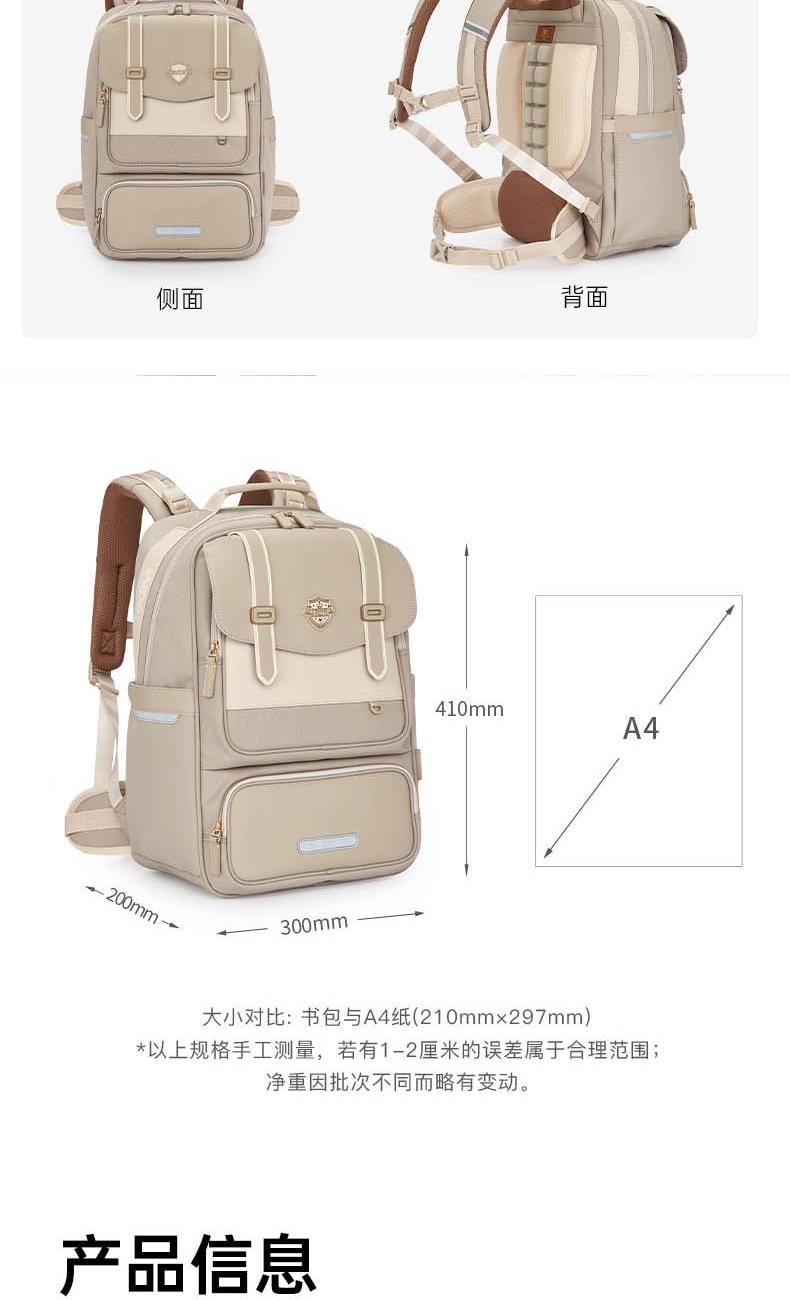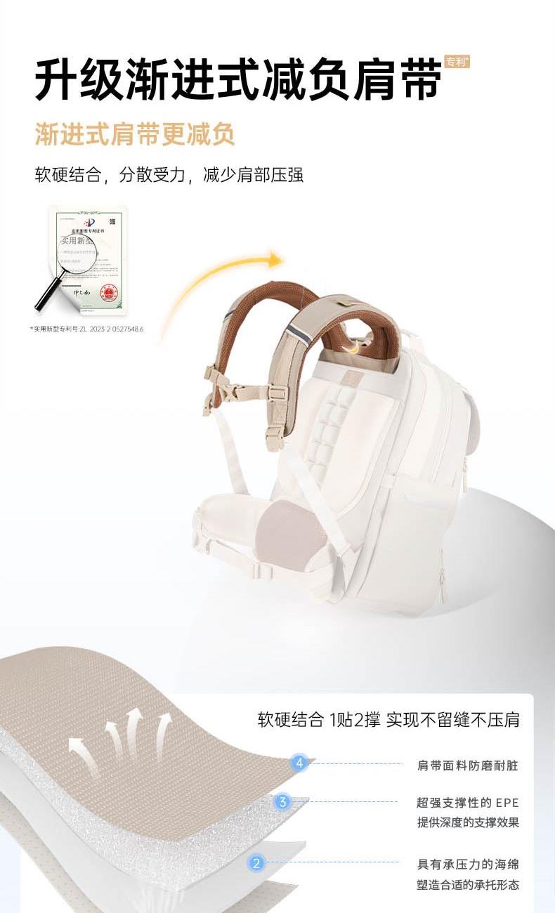 货号:U5095 主体面料:织物+合成革 里料:织物 颜色:米白 冰川灰 定位: 150-175CM以上/初高中功能书包 净重:0.95kg 24.6L