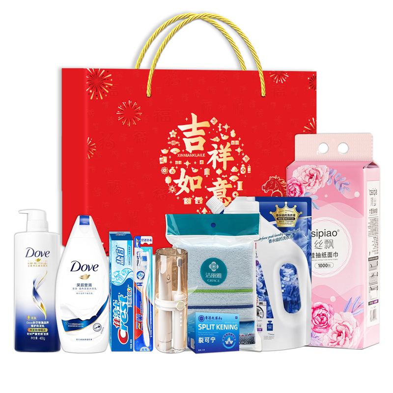 礼盒尺寸:34*8.5*27cm 包装尺寸:69*37.5*56.5CM 产品配置:(香型随机) 多芬洗发水400ml 多芬沐浴露550ml 佳洁士牙膏90g 三笑牙刷 透明便携洗漱杯 纯棉毛巾(73*33cm) 蔬果园洗衣液500g 香港大药房裂可宁35g 丝飘挂抽式纸巾(1000张) 精美礼盒