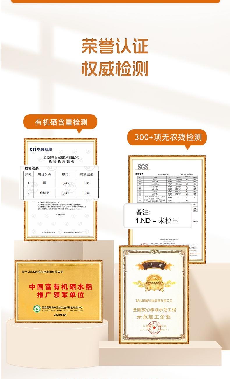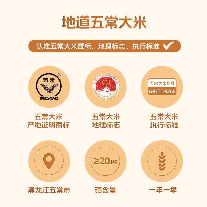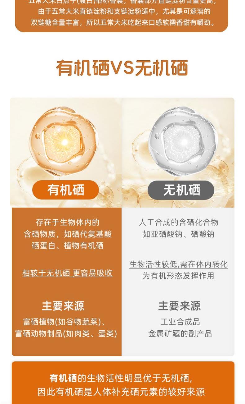 产品特点1、正宗五常大米,稻花香二号。2、高于普通大米执行标准,执行GB/T 19266标准 优质一等。3、软糯香甜,米质细腻,软糯适口,油光发亮,清新悠然,绵糯润口。4、国硒中心认证有机硒,90%有机硒,每100g平均硒含量≥20μg