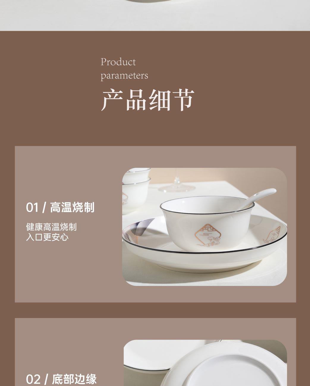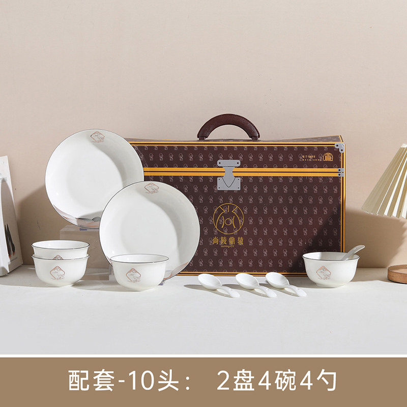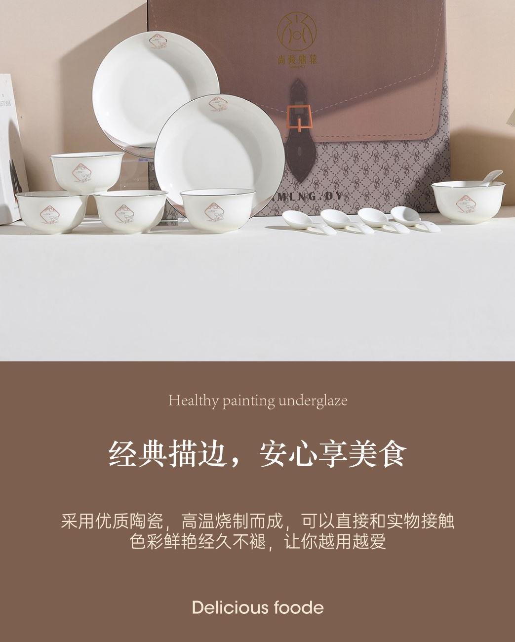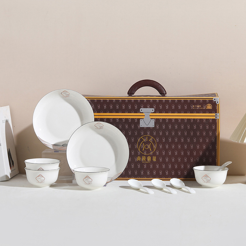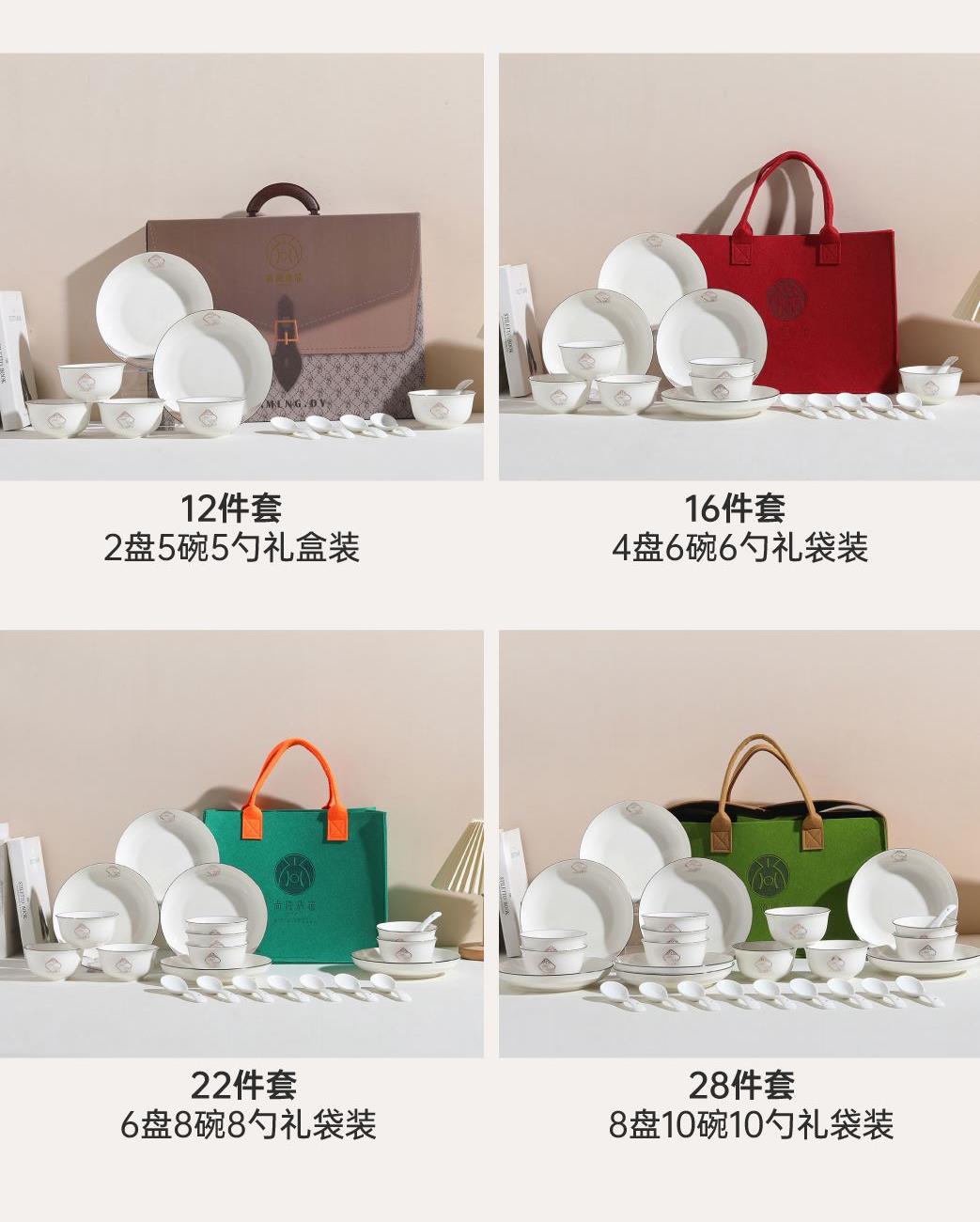 产品组成:4碗+2盘+4勺+礼盒 产品材质:高温瓷 产品工艺:印花+素烧+釉下彩 产品规格:4.5英寸碗,8英寸盘,三弯小勺 包装尺寸:48*8*28cm 外箱尺寸:53.5*49*60cm 产品特点:斯人若祥云,遇上方知有。花纸高温烧制,沿用包装设计,镀金压纹包 包造型,咖啡色与金色搭配,更有创意。瓷器采用上等瓷泥料高温烧制而成。真金花纸,有颜值有档次而不失实用性,是送礼的优佳选择。