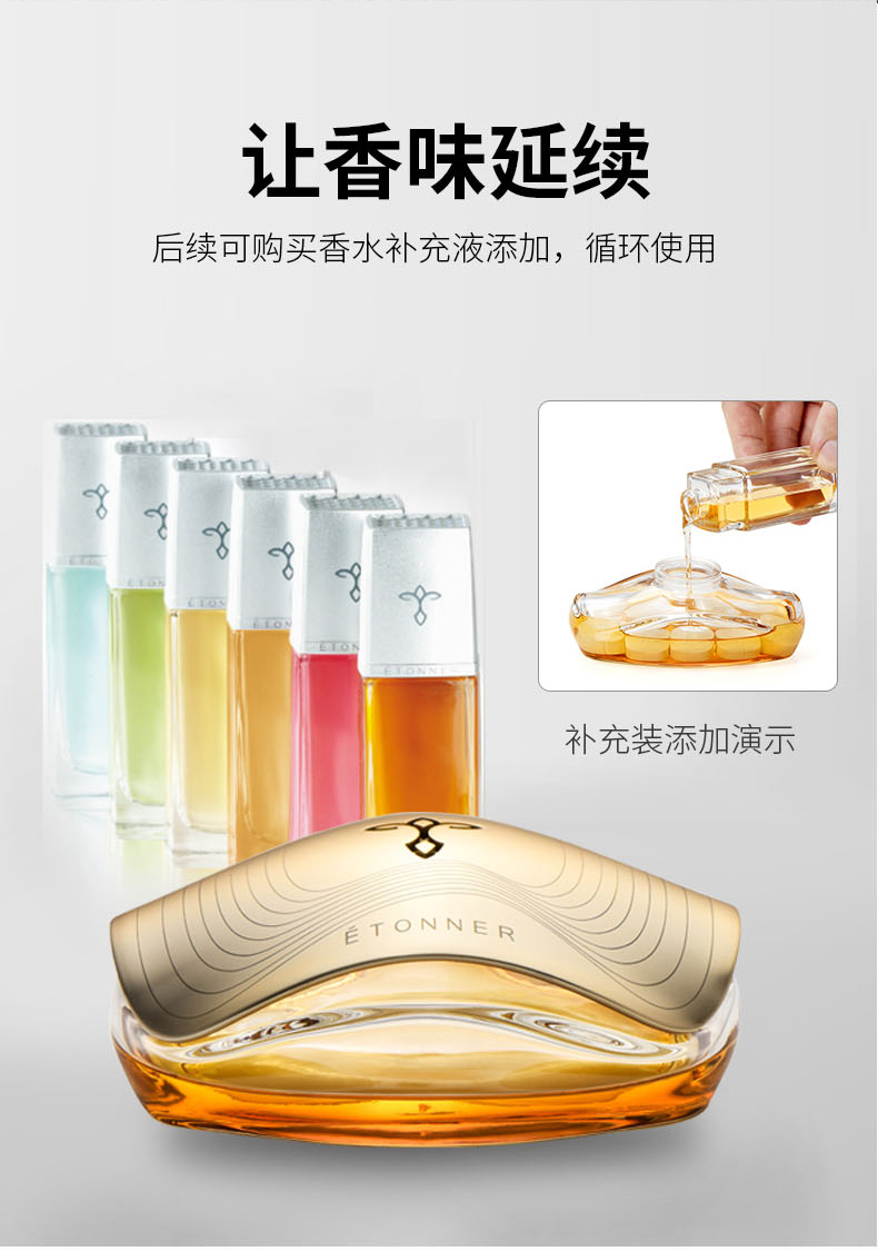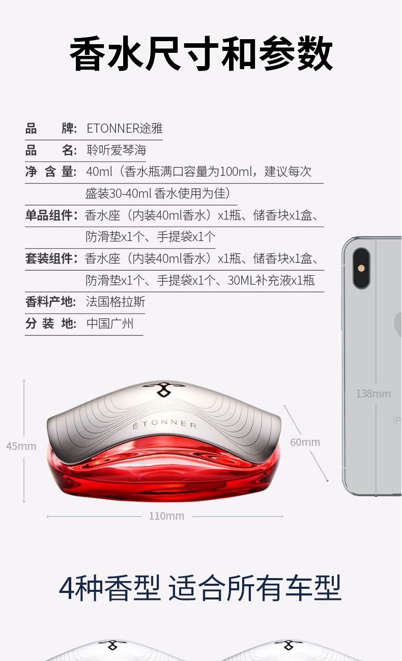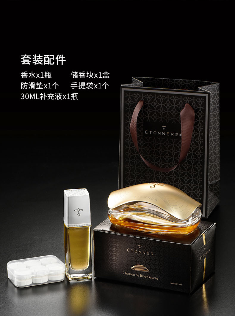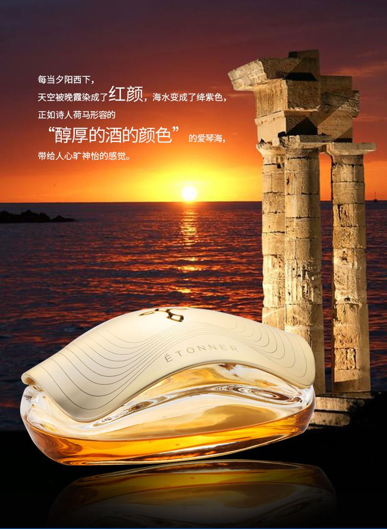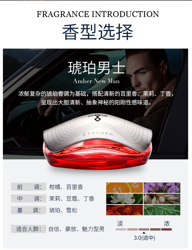 湛蓝的海水轻轻的荡漾着,起了一层又一层的涟漪,靠近日落的海面,晶莹剔透,清澈中泛着灿灿的金光,令人心神随之荡漾。远处的船只正在缓缓的回港,守候这场日月交替的盛典……、 设计:法国设计师曾获红点设计大奖设计师设计 香料:法国格拉斯PE集团直供优质香料 工艺:珠宝级锻造工艺 标配: 瓶内40ML香水+储香块12粒+30ML补充液+防滑垫、喷式试用装1支(5ML)、礼品盒手袋 5种香型 琥珀男士A、 古龙C、 海洋O、 真我D、 自由之翼F