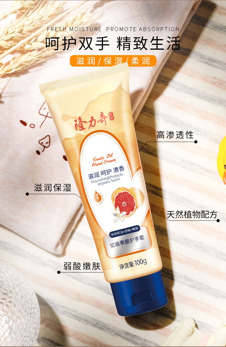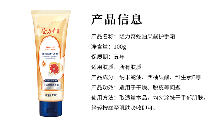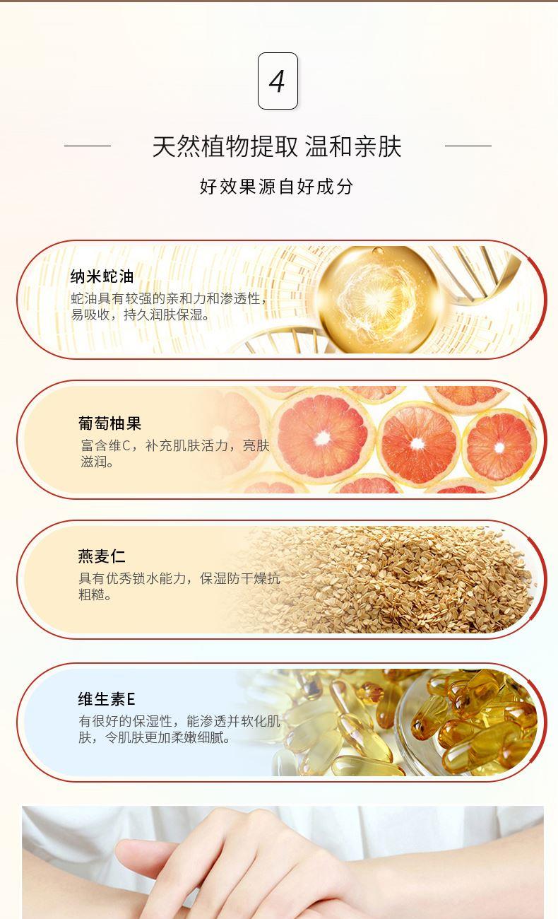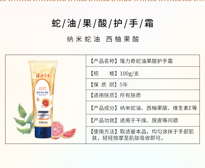 货号:LLQ-202502016 保 质 期:5年 适用人群:婴幼儿及儿童 主要成分:蛇油、甘油、马脂、燕麦仁提取物、葡萄柚果等 功效:锁住水分,呵护肌肤 含量:100g/瓶 产品卖点: 1.蛇油深层滋养,缓解干燥皲裂 2.果酸温和焕肤,细腻嫩滑双手 3.长效锁水保湿,清爽不黏腻