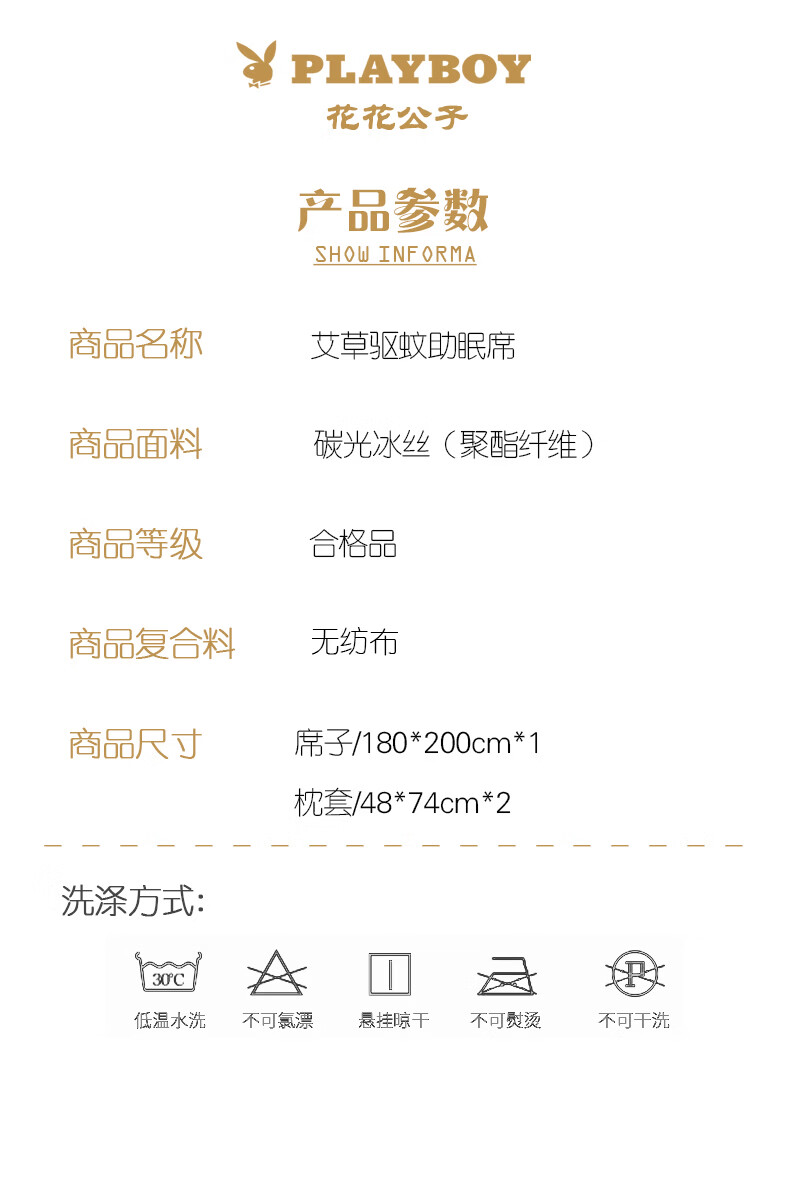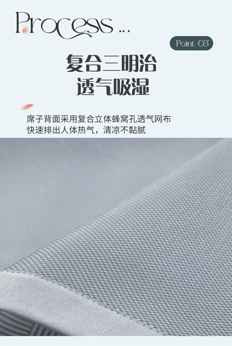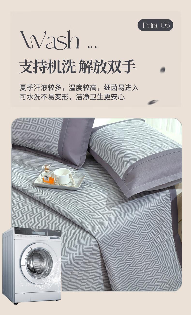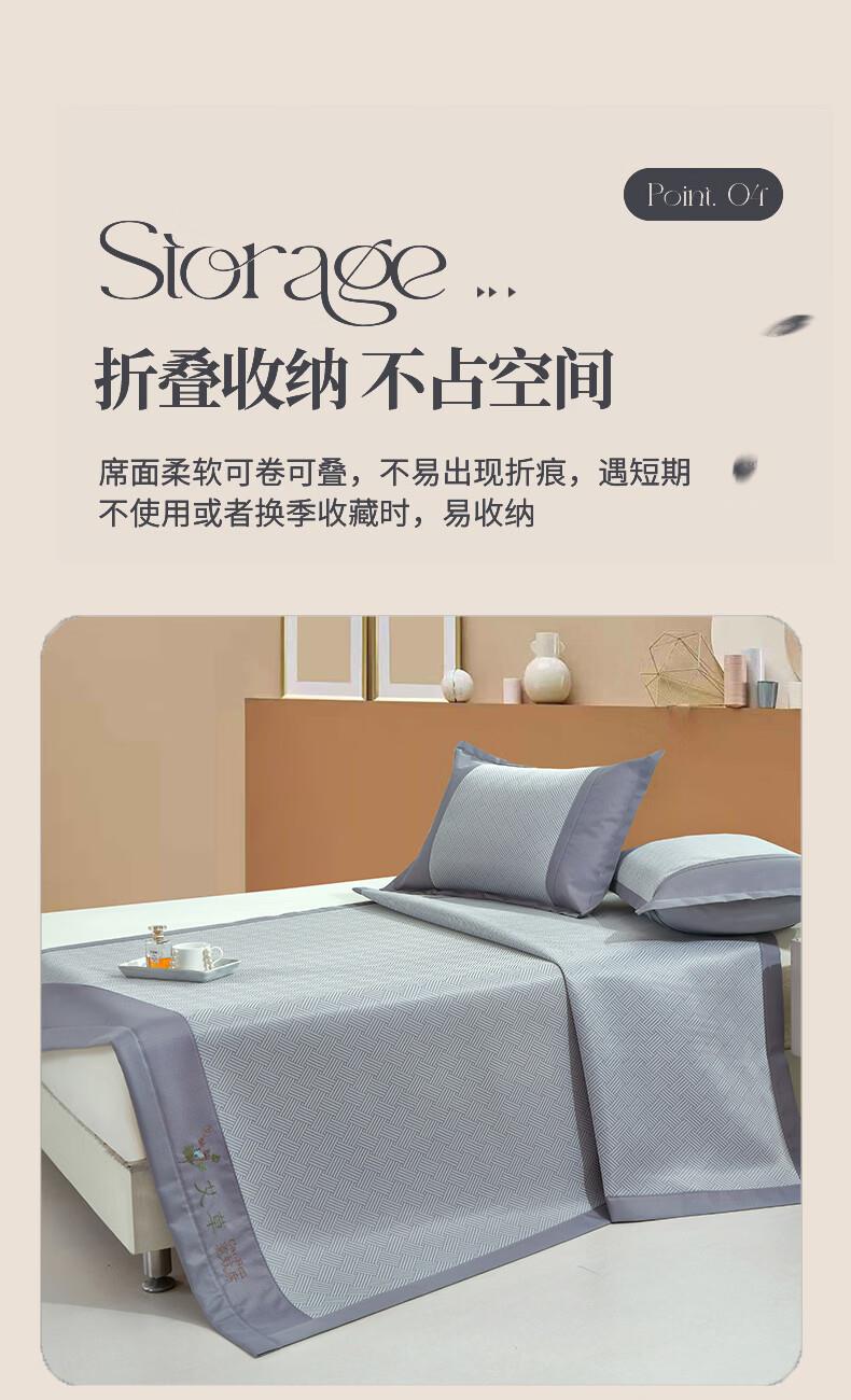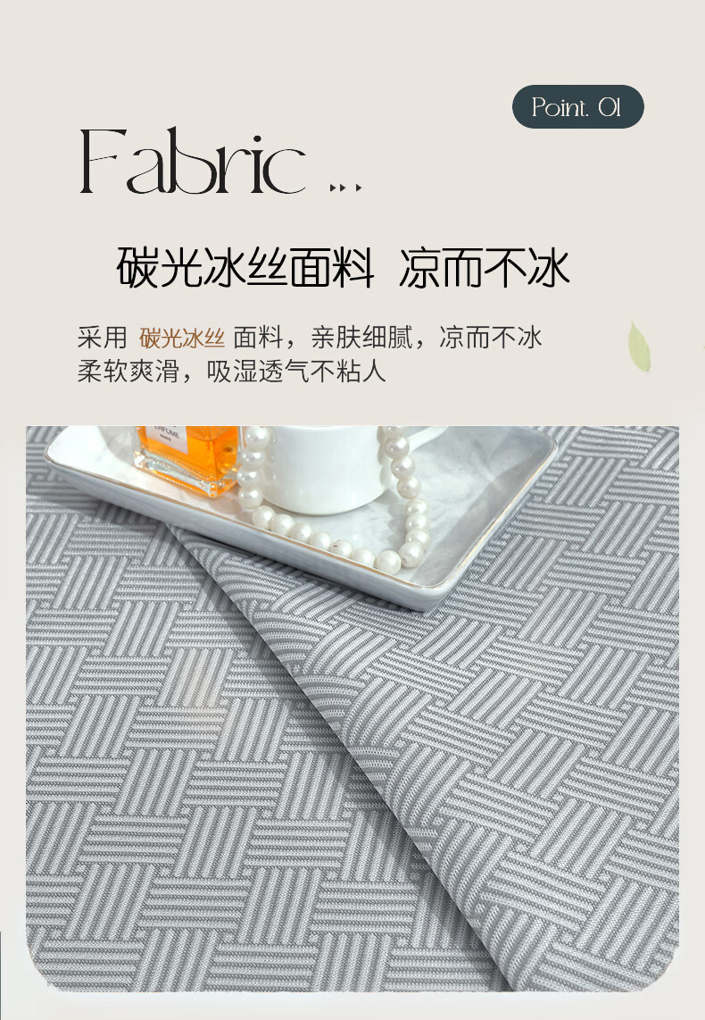规格:180*200cm 枕套:48*74cm*2 面料:碳光冰丝 复合料:三明治 执行标准:Q/TDY 01-2016 安全类别:GB18401-2010 B类 1.高密碳光冰丝席,自然清凉,凉而不冰,久睡不粘。 2.碳光凉感冰丝纤维织物本身经过处理,可以破坏细菌的寄生环境,有效防止细菌滋生进入,切断它们的食物链,洁净卫生,适合裸睡。