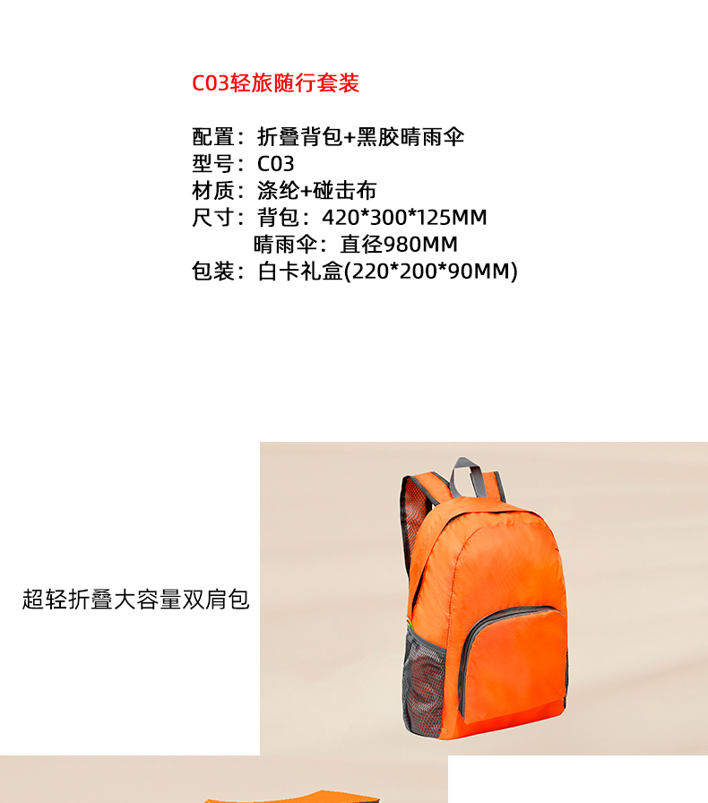 配置:折叠背包+黑胶晴雨伞 型号:C03 材质:涤纶+碰击布 尺寸:背包:420*300*125mm 晴雨伞:直径980mm 包装:白卡礼盒(220*200*90mm)