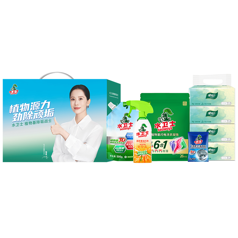 水卫士植物基闪电(三腔闪电)洗衣凝珠8g*26颗 水卫士3D深层洁净洗衣液500g 水卫士厨房重油污净500g(带喷头) 水卫士洗衣机槽清洁剂125g 心相印云麓系列三层100抽塑装纸面巾4包单提 思珀莱源力礼盒(净含量1833g 小号)