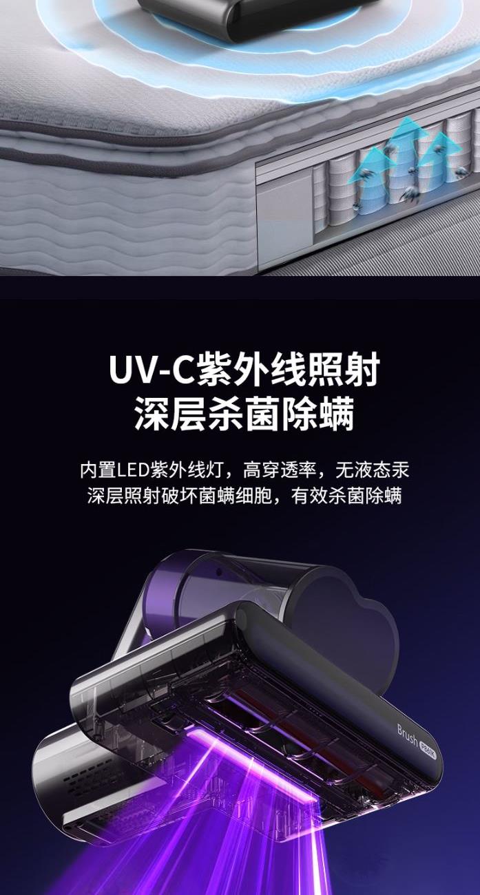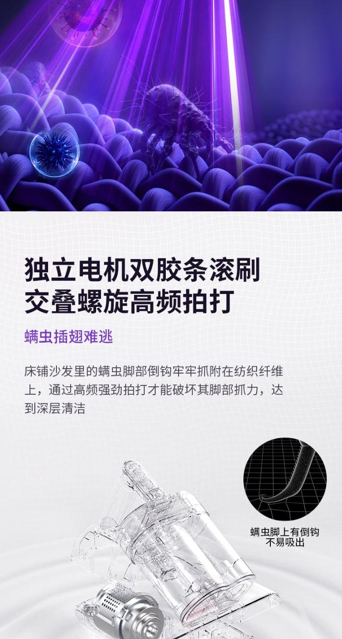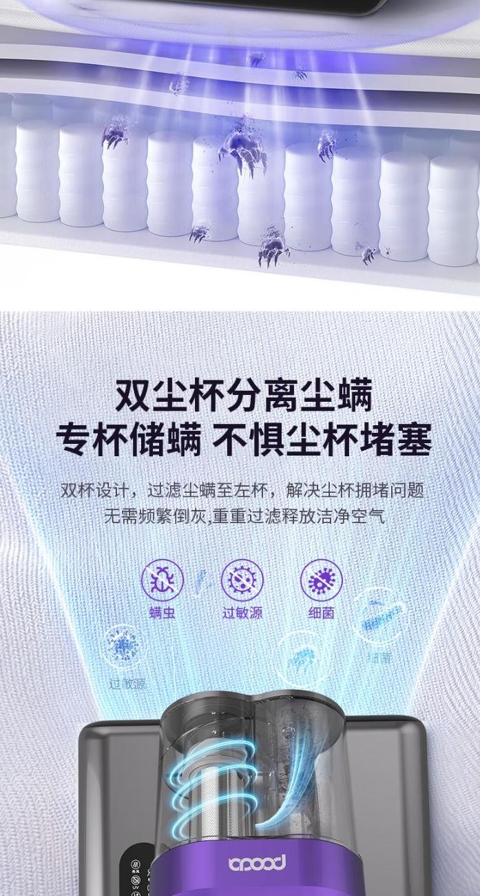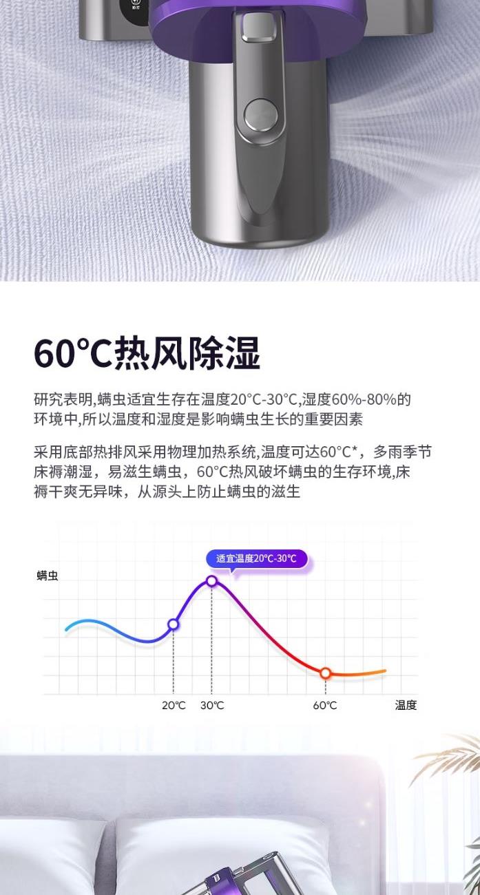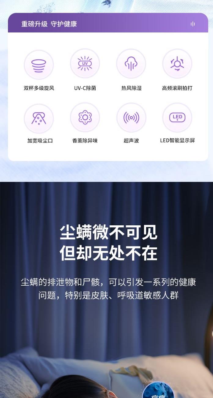 功 率:400W 噪 音:≤78dB 吸 力:≥15Kpa 集 尘 容 量:0.5L 电 源 线 长:约4m 超声波除螨 LED紫外线灯 双重深层穿透 抑制螨虫 可视化过滤储尘分离双尘杯 干净不堵塞 可增加香薰除异味 在清洁家居的过程中 享受浪漫的氛围和清新怡人的气味。 多刷条复合滚刷 高效拍打 无死角除螨 LED显示屏 工作状态一目了然 热风除湿更健康