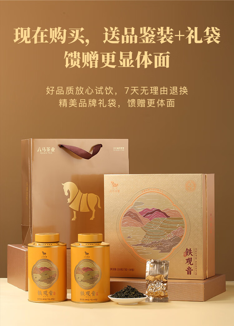 【编码】AA1376 【包装尺寸】24.8*24.8*10.2cm 【净 含 量】7克*30包 【保 质 期】18个月 【包装】精装礼盒装 【储藏条件】防潮湿,防异味,避光直射 推荐理由: 安溪核心产区:正宗高山原料,自带天然兰香,砂绿紧结、白毫显。 非遗轻发酵:八马非遗工艺,低焙火锁鲜,兰香清雅、鲜爽回甘、无涩感。 独立小泡 + 礼盒:30 包 ×7g,一次一泡;红色烫金礼盒,自饮 / 送礼体面。 保障:八马百年制茶,全链路品控,安全检测,喝得放心。