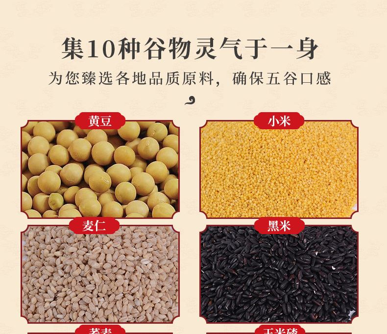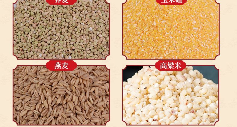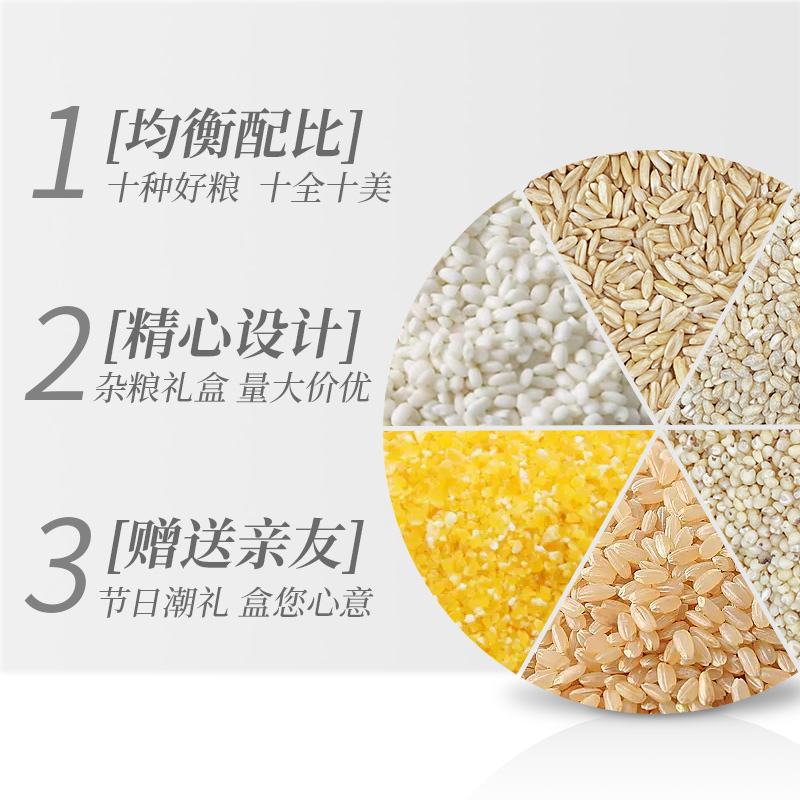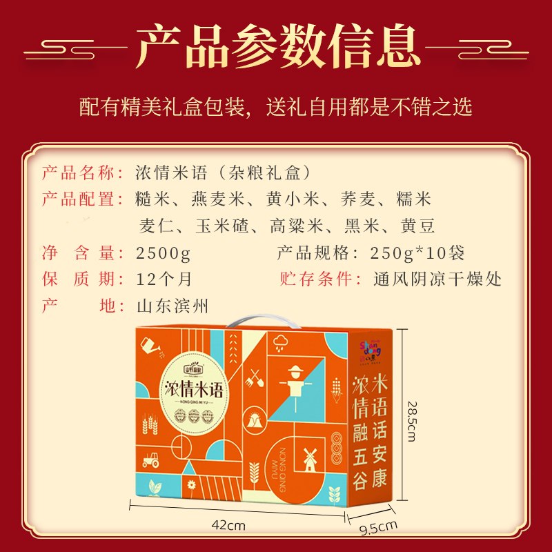 产品规格配置:糙米、燕麦、小米、荞麦、糯米麦仁、玉米碴、高粱米、黑米黄豆(250g*10袋) 盒尺寸:42*28.5*9.5cm 箱体积:0.077方 箱尺寸:59.5*43*30 箱重量:18.2kg