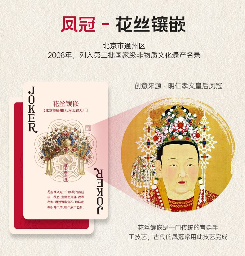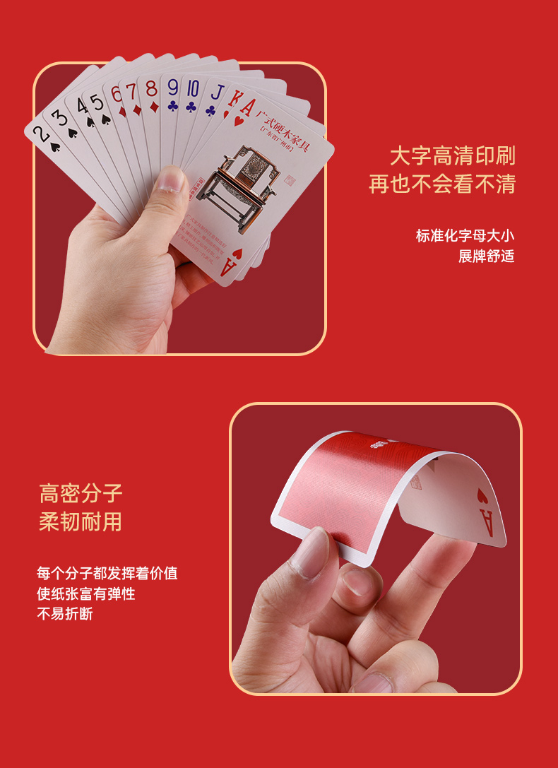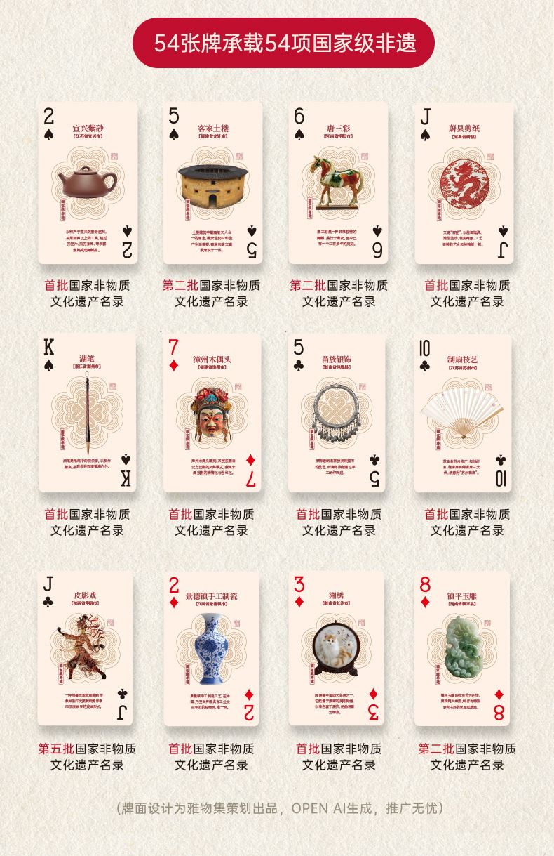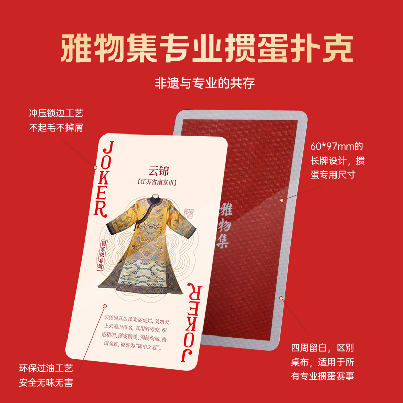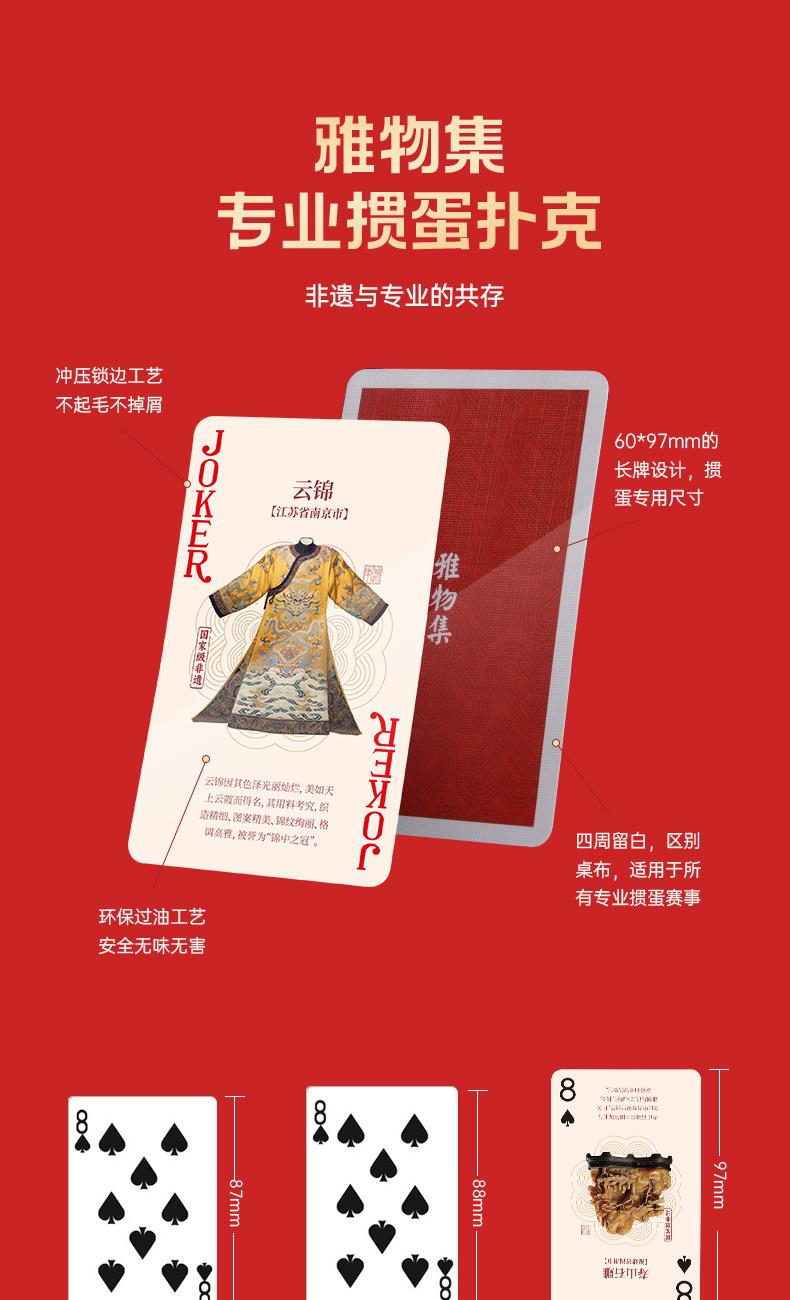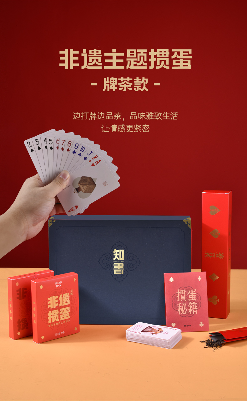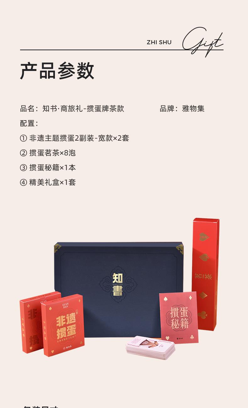 配置 · ① 非遗主题掼蛋2副装-宽款×2套 ② 掼蛋茗茶×8泡 ③ 掼蛋秘籍×1本 ④ 精美礼盒×1套 尺寸 · 310×230×40mm(盒)丨330×260×110mm(袋)