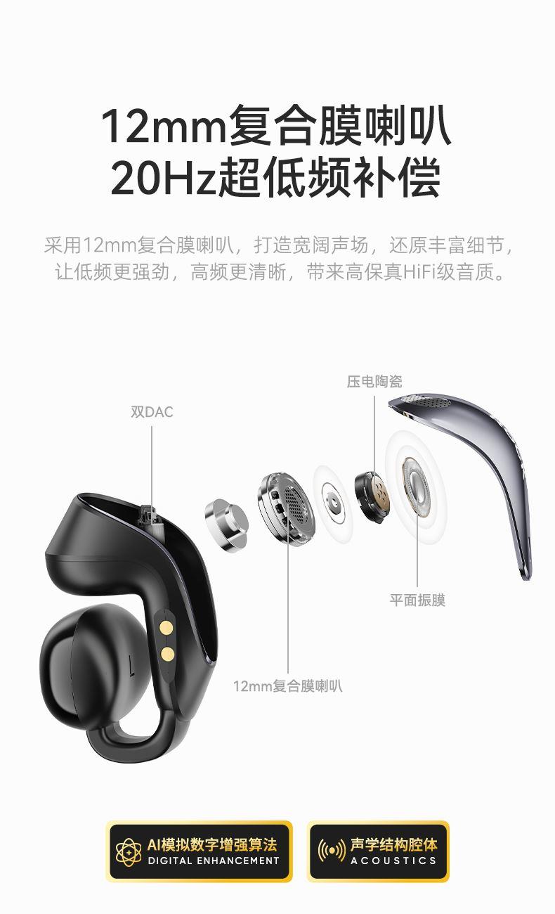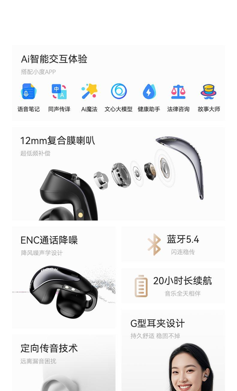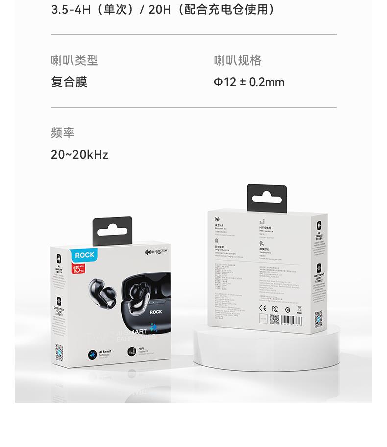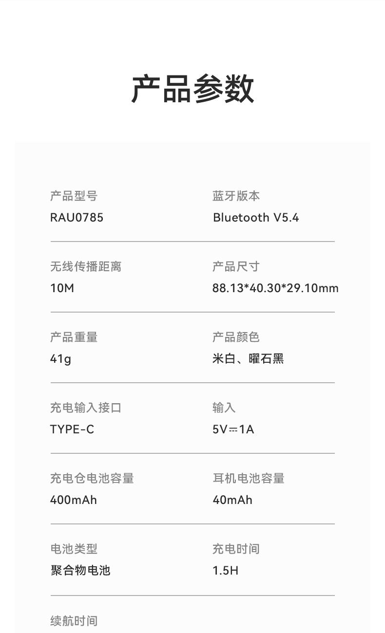 1.产品型号:RAU0785 2.蓝牙版本:蓝牙5.4 3.产品尺寸:88.13*40.30*29.10mm 4.产品重量:41g 5.充电输入接口: TYPE-C 6.输入:5V 1A 7.电池容量:聚合物电池 8.充电仓电池容量:400mAh 9.耳机电池容量:40mAh 10.充电时间:1.5H 11.续航时间:3.5-4H(单次) 20H(配合充电仓使用) 12.喇叭类型 :复合膜 13.喇叭规格: 12±0.2mm 14.频率 20~20kHz 翻译小天才,行走的百科全书,智能办公,健康助手 12mm复合膜喇叭 + 20Hz超低频补偿 ENC通话降噪,AI智能降噪算法加持