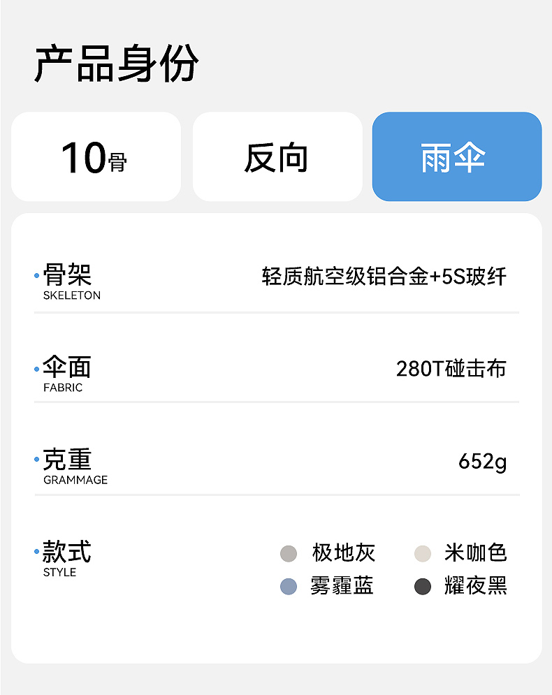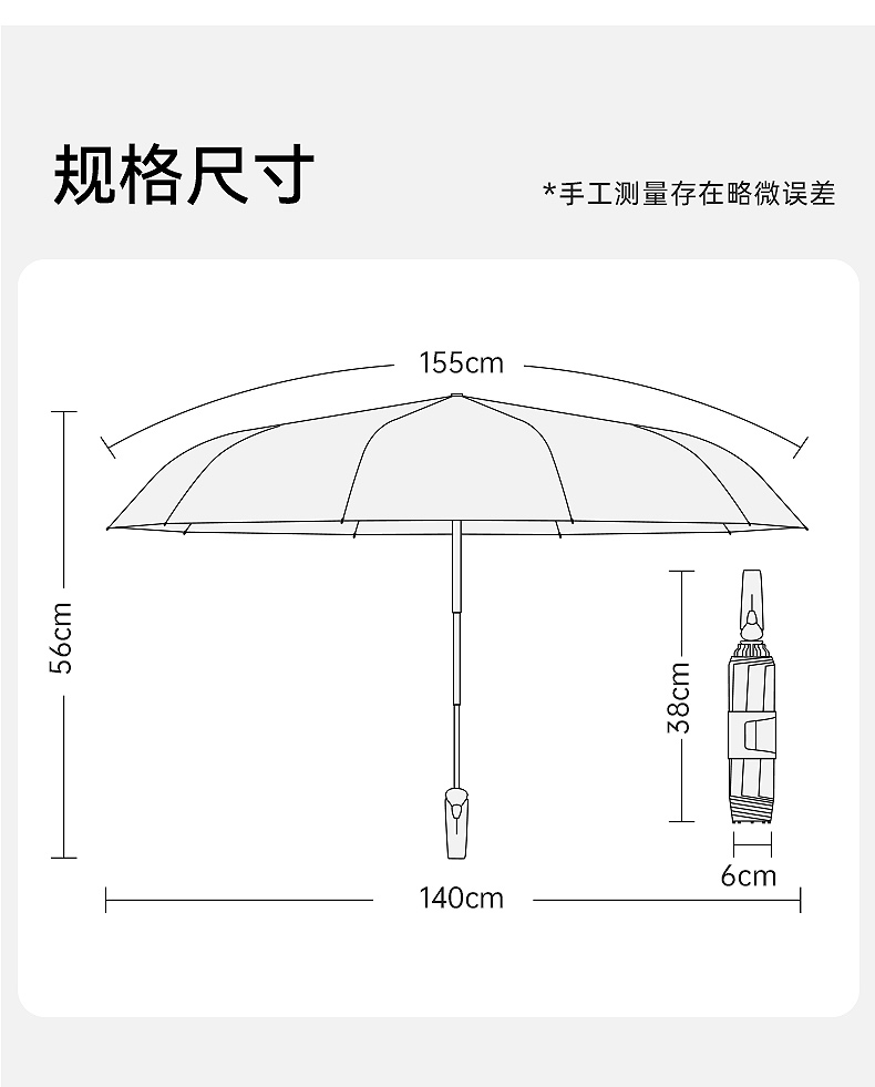 商品货号: ZD2577 伞架材质:铝合金,玻纤 伞面材质:300t疏水布 款式:自动三折雨伞 商品参数:伞下直径:140cm 高度:82cm 收拢直径:6.5cm 收拢高度:38cm 商品毛重:630g 商品颜色:ZD2577-KJ1.4M-雾霾蓝 ZD2577-KJ1.4M-米咖色 ZD2577-KJ1.4M-迷雾灰 ZD2577-KJ1.4M-黑色