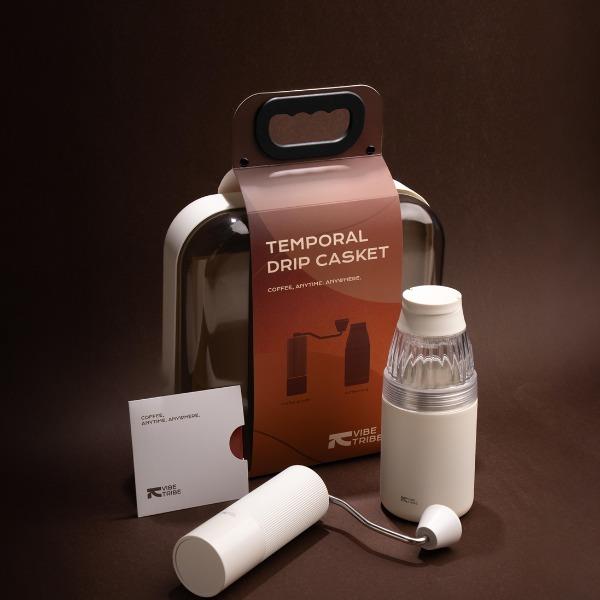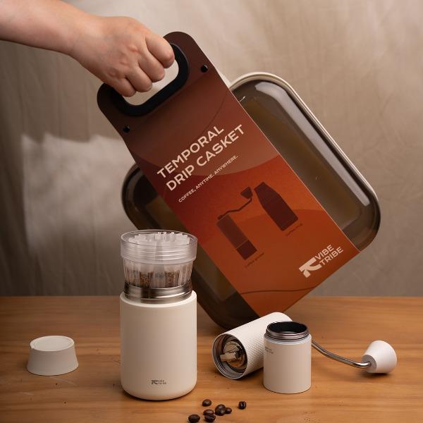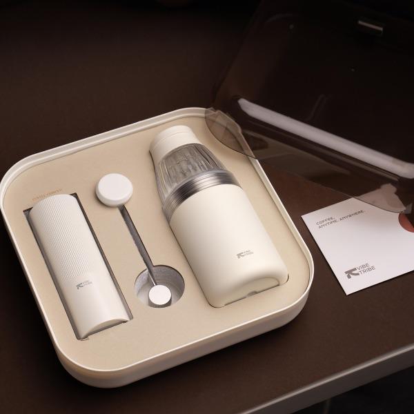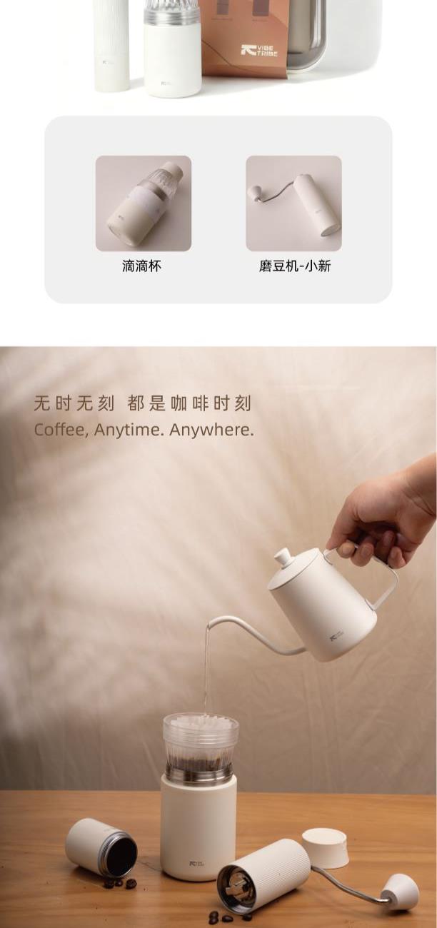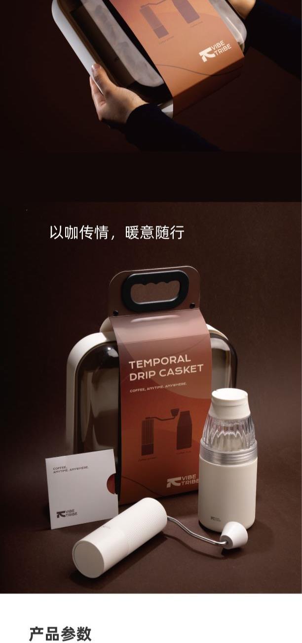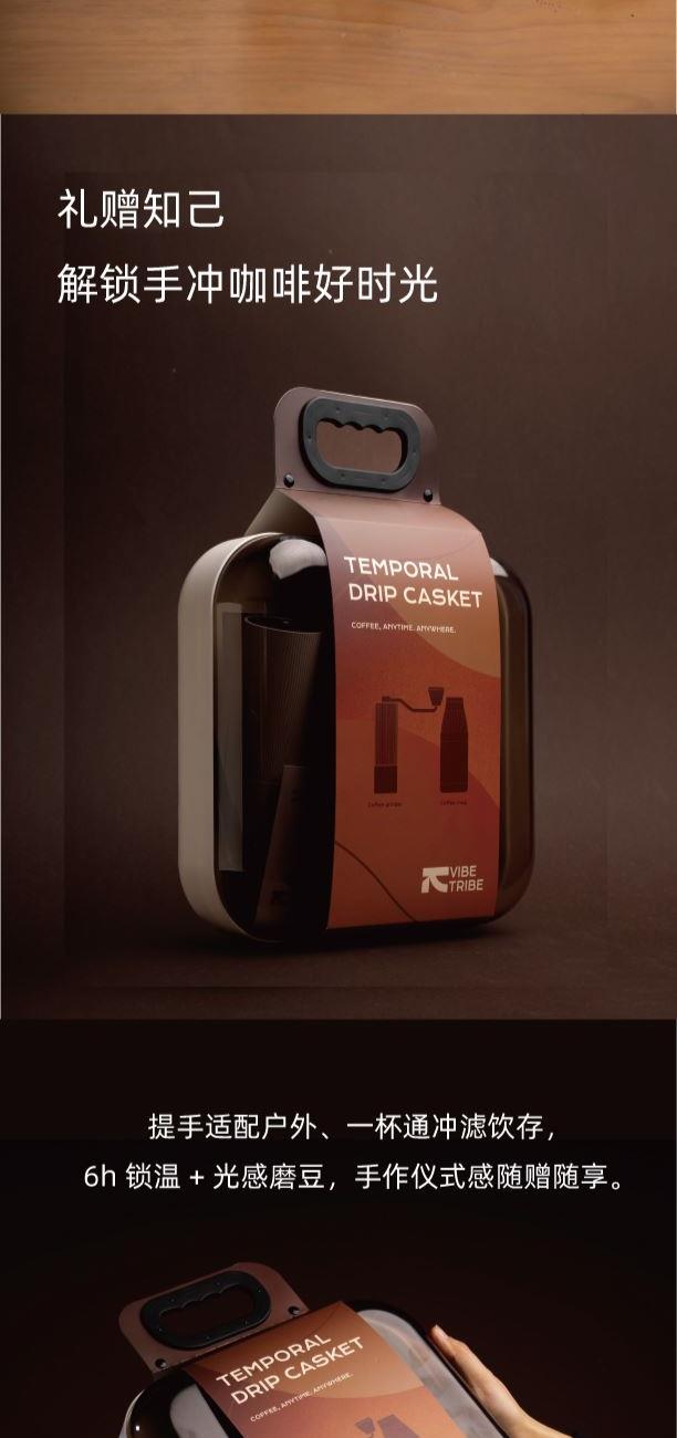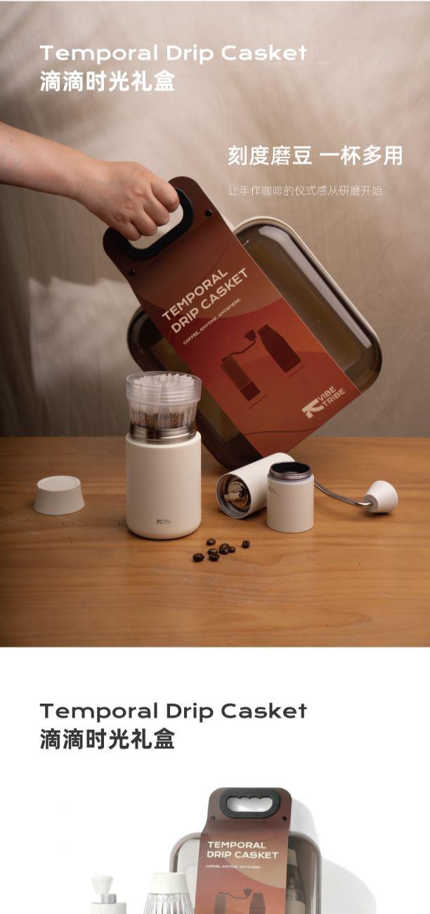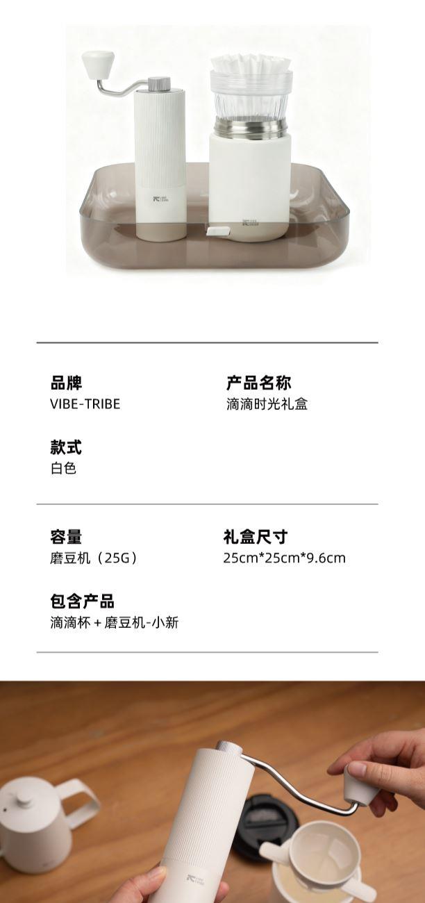 产品:VIBE-TRIBE滴滴时光礼盒 礼盒尺寸:250*250*96 产品材质:304 不锈钢 、420 不锈钢(磨芯)、PP、PC、食品级硬塑 包含产品:滴滴杯+磨豆机-小新 核心卖点: 1. 含滴滴多功能杯双层不锈钢保温保冷(6 小时锁温)、多功能都可使用:花茶咖啡滤杯、迷你保冷桶; 2. 延续光感条纹设计与精密刻度调节磨豆机,让手作咖啡的仪式感从研磨开始; 3.可循环使用礼盒,拒绝一次性包装,让每一份福利都既有体面,又有长久价值。