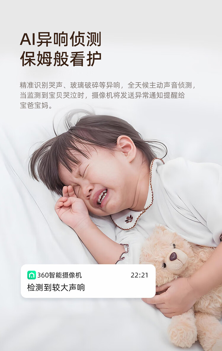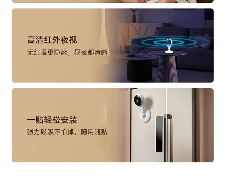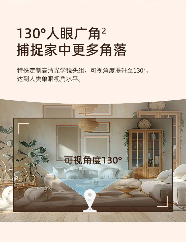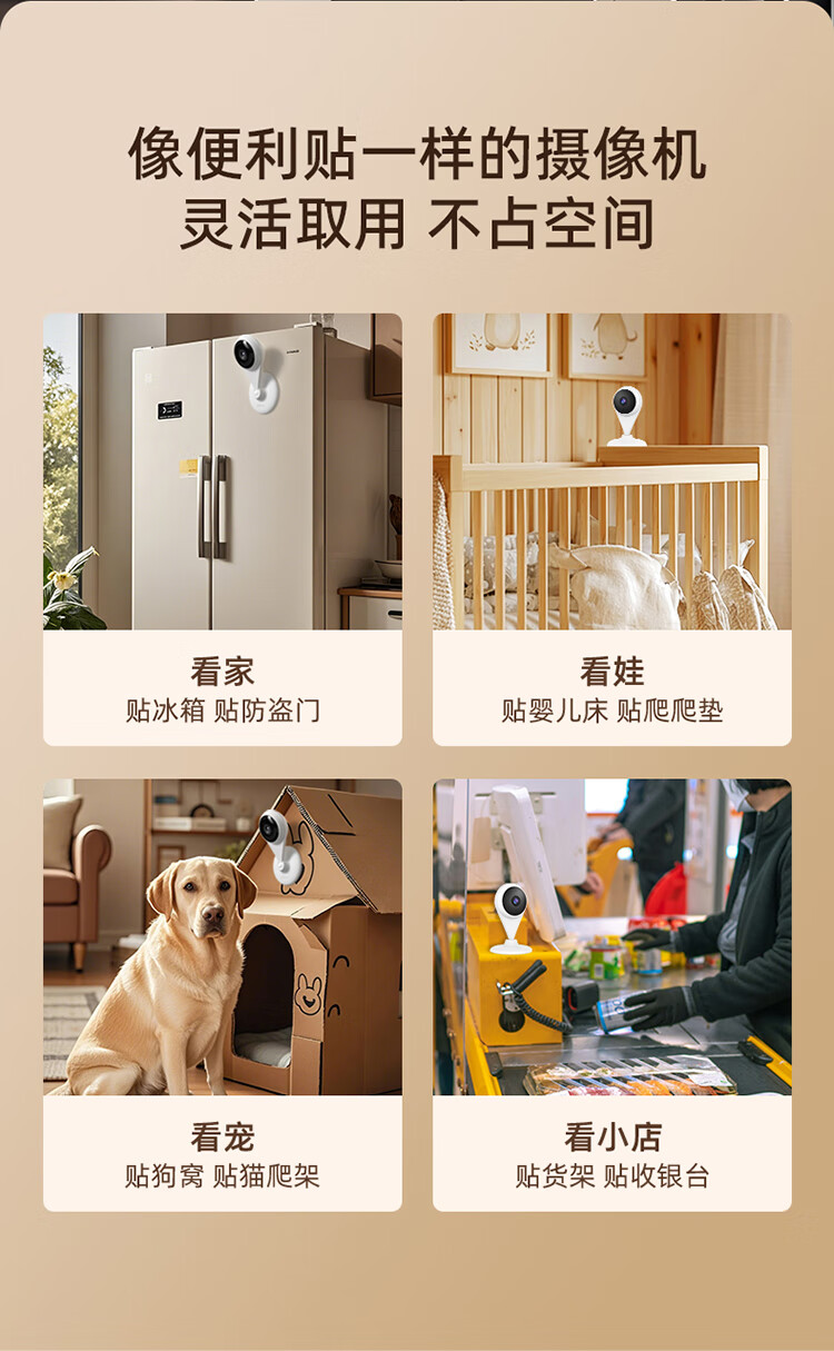 产品参数: 1、300W像素、130°广角、旋转角度:水平360度,垂直158度 2、重量:0.42kg、包装尺寸:95*90*160mm、 产品功能: 1、像便利贴一样的摄像机,灵活取用,不占空间。 2、看娃、看宠物、看老人、看门店多场景守护者 3、2K超清画质130°人眼广角、AI人形侦测、异响侦测 4、双向语音通话、高清红外夜视、一贴轻松安装、支持云录像和卡录像。 5、支持电脑、PC端、APP实时查看,满足不同场景使用:商超、仓库、餐饮等中小微企业客户,支持多人同时查看。(搭配360视觉云)