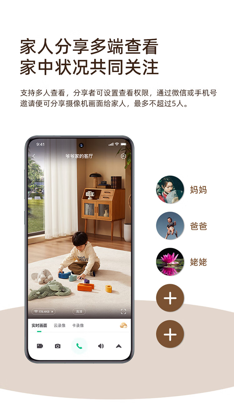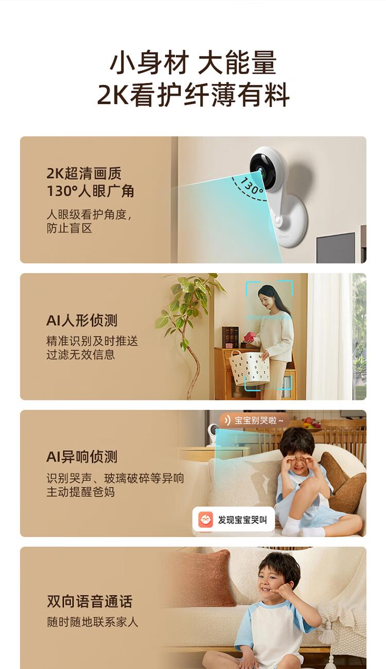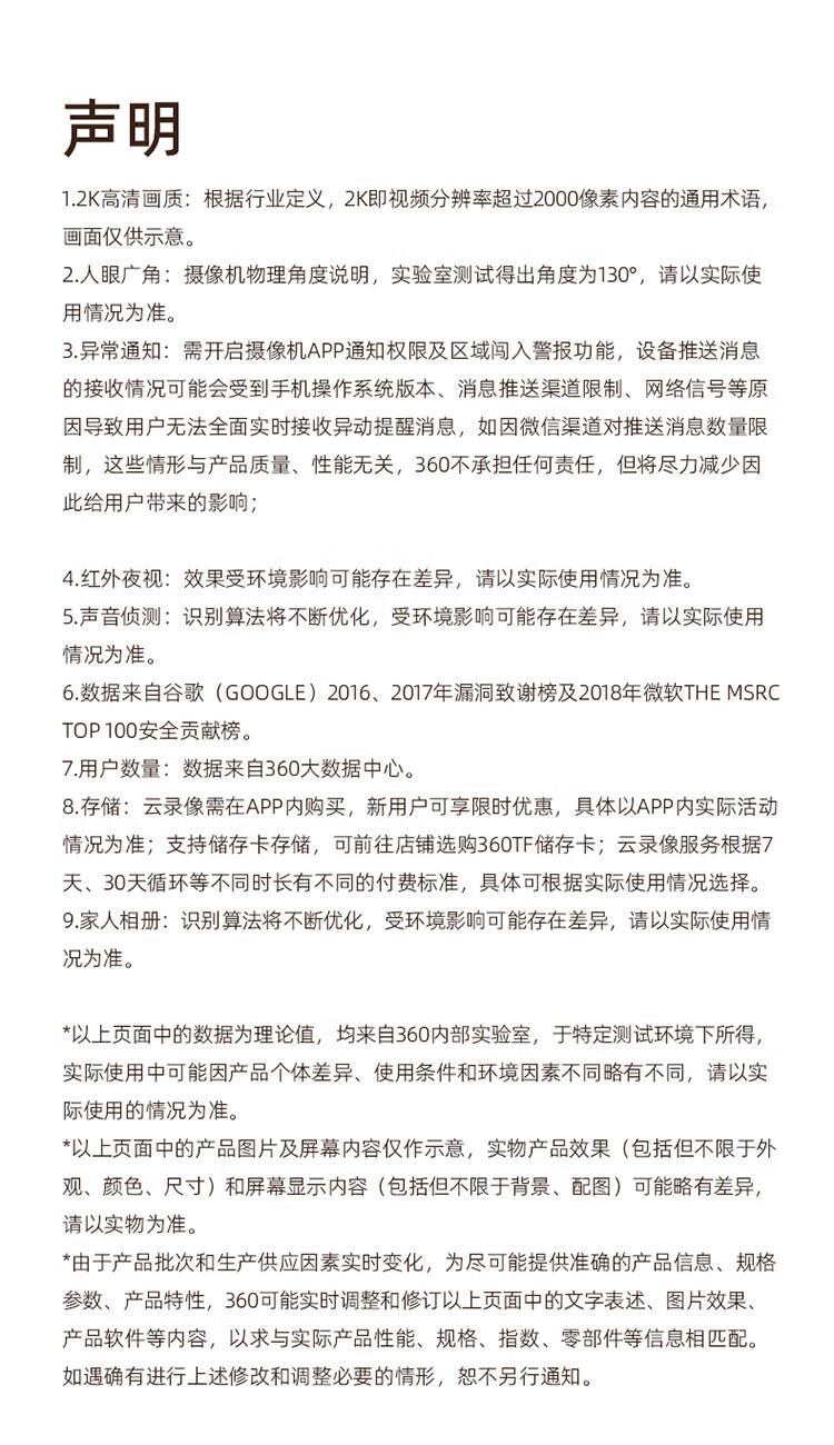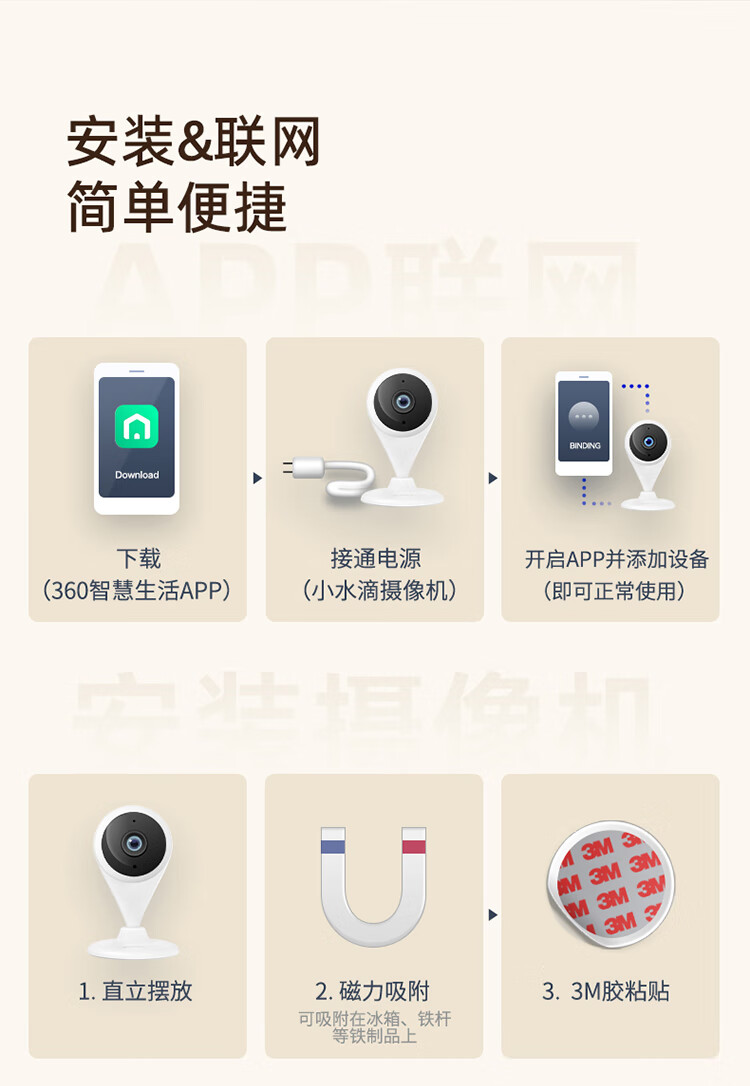 产品参数: 1、300W像素、130°广角、旋转角度:水平360度,垂直158度 2、重量:0.42kg、包装尺寸:95*90*160mm、 产品功能: 1、像便利贴一样的摄像机,灵活取用,不占空间。 2、看娃、看宠物、看老人、看门店多场景守护者 3、2K超清画质130°人眼广角、AI人形侦测、异响侦测 4、双向语音通话、高清红外夜视、一贴轻松安装、支持云录像和卡录像。 5、支持电脑、PC端、APP实时查看,满足不同场景使用:商超、仓库、餐饮等中小微企业客户,支持多人同时查看。(搭配360视觉云)