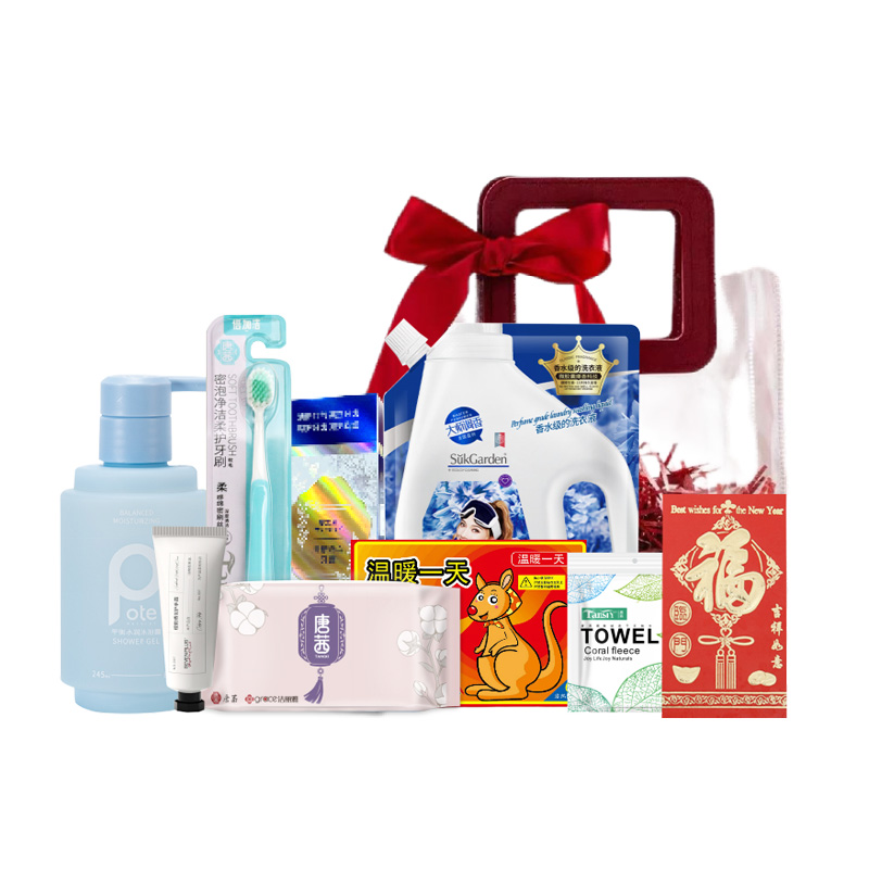 【套装配置】(香型随机/新老包装随机) 1.柏缇平衡水润沐浴露245ml*1 2.蔬果园蓝风铃深层洁净柔顺洗衣液500g*1 3.唐茜珊瑚绒速干手帕巾*1 4.SEVEN PLUS檀韵木质香氛护手霜50g*1 5.温暖一天防寒保暖发热贴五片装*1 6.唐茜密泡洁净柔护牙刷*1 7.日本樱之素清新净白牙膏120g*1 8.唐茜洁丽雅臻品长绒棉毛巾70g*1 9.PVC精美礼袋(新春特别版)*1 赠:新春红包*1