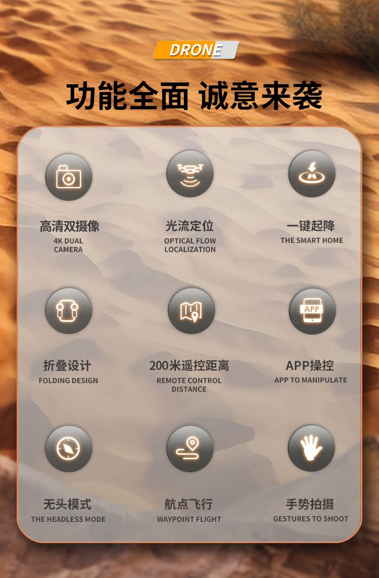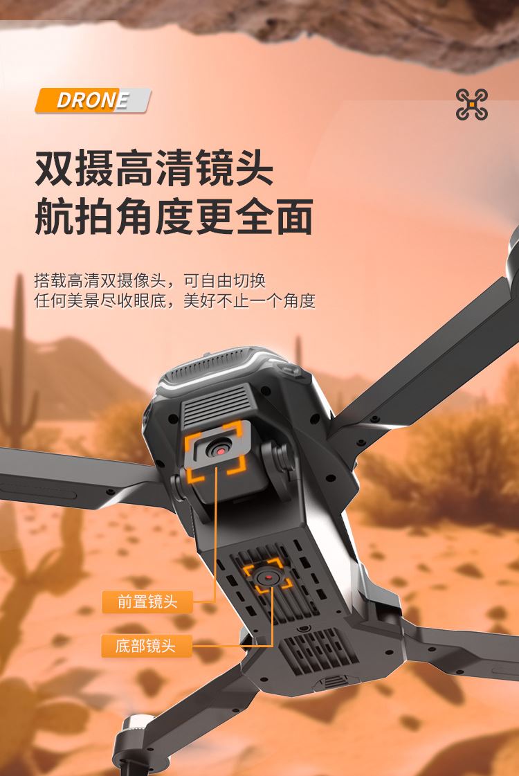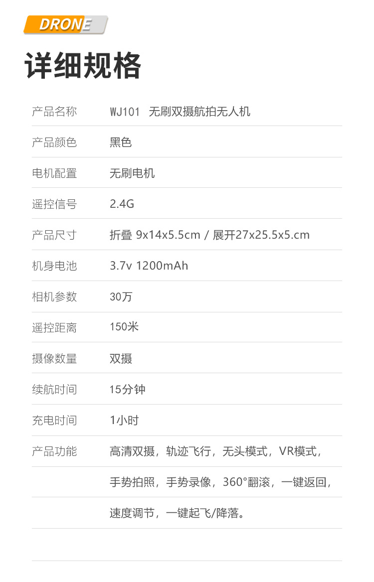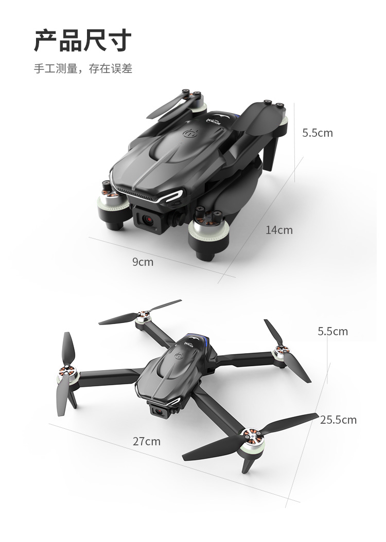颜 色 :黑色 摄像头:双摄像头 电机配置:无刷电机 信号:2.4G 机身电池:3.7V 1200mAh 像素: 30万 遥控距离:约150米 摄像头转动角度:0-90° 续航时间:约15分钟 避障:红外室内四面避障 展开尺寸:185*160*53mm 毛重:370g 折叠尺寸:127*72*53mm 包装尺寸:210*170*6mm 上升,下降,前进,后退,左转,右转,左侧飞,右侧飞,气压定高,无头模式,一键起飞,一键降落,急停,一键返航,陀螺仪校正,速档位切换,360度翻滚, 微调,拍照录像,舵机调节,可折叠机身,APP操控,WiFi实时画面传输。