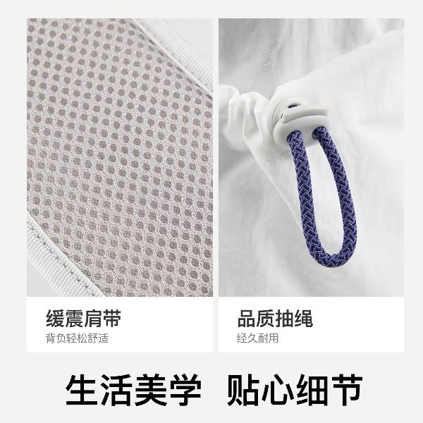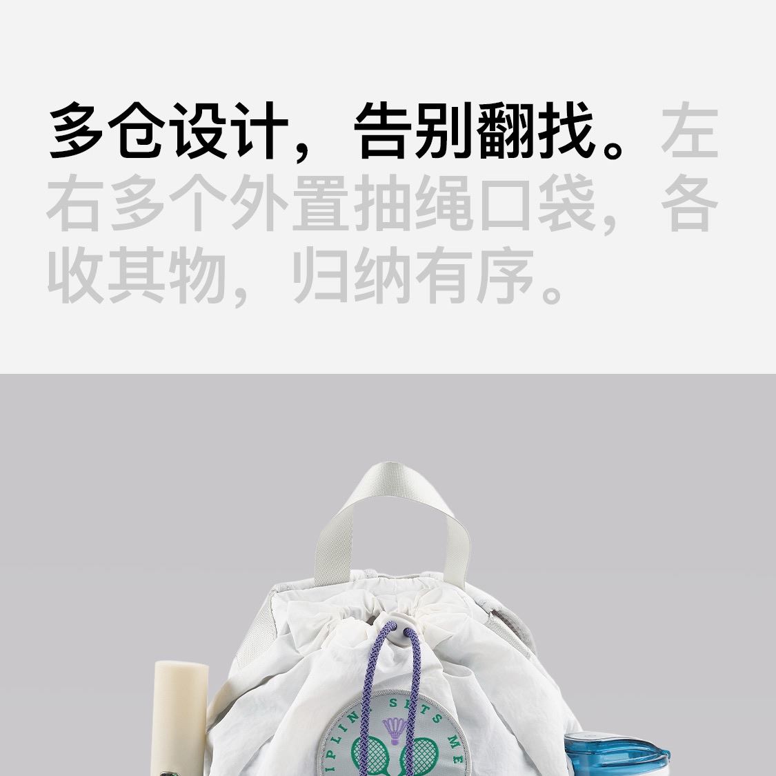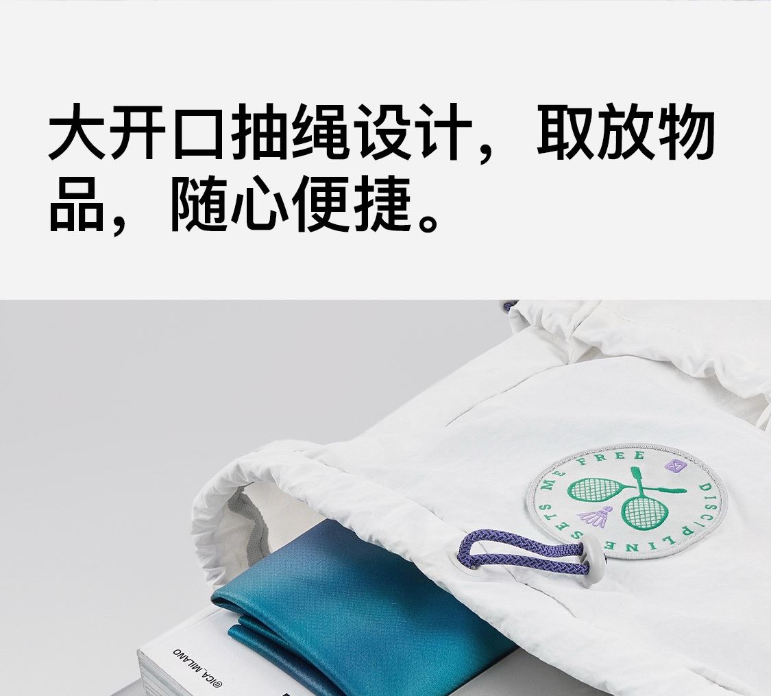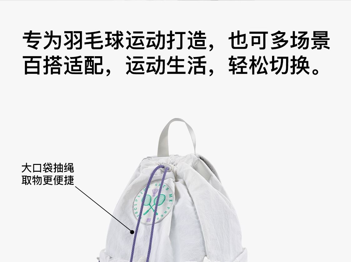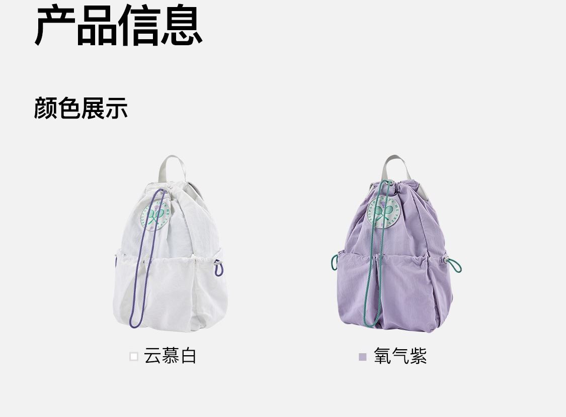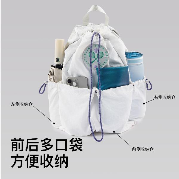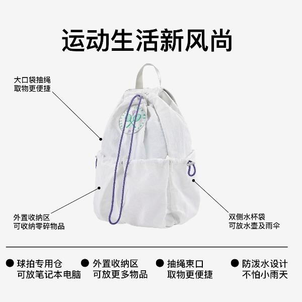 尺寸:均码(29X13X45.5cm) 重量:295g 容量:20L 材质:纺织物 专业收纳时尚多场景 球拍专用仓 可放笔记本电脑 多仓收纳 双侧水杯袋可放水壶及雨伞 抽绳束口 可放更多物品取物更便捷 大口袋抽绳取物更便捷 外置收纳区可收纳零碎物品 防泼水设计不怕小雨天