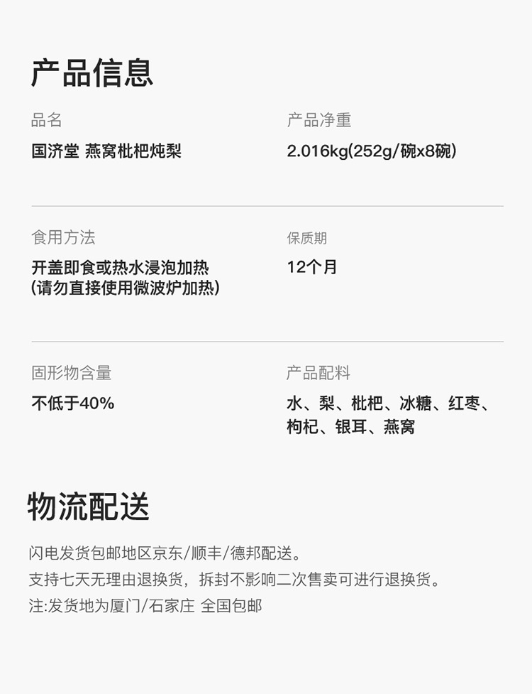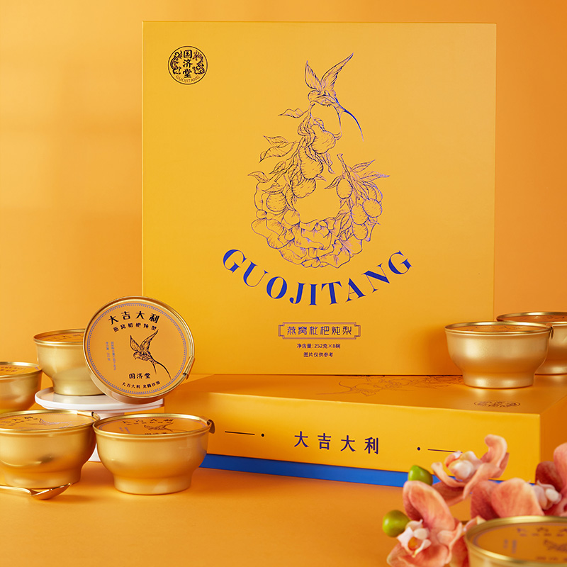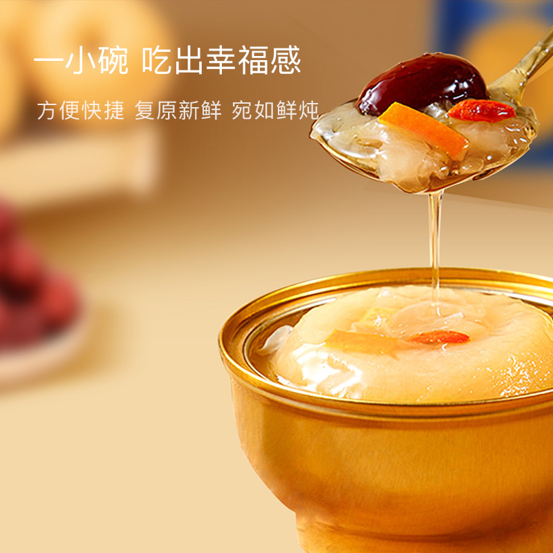 传统金黄色配色,对龙年的吉祥寓意; 炖梨甜水的新搭配, 加入燕窝、枇杷、银耳等滋补好物, 增强润燥; 口感清甜软糯,满满一碗补充能量。 一盒8碗, 配料纯净无添加,坚持纯粹品质。