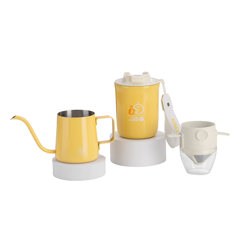 产品容量:咖啡杯380mL、手冲壶350mL 杯体材质:奥氏体型不锈钢06Cr19Ni10(食品接触用) 塑 料 件:pp(食品接触用) 密 封 圈:硅胶(食品接触用) 保温效果:35℃以上 6 小时(室温 20℃ ±5℃,95℃水满容量) 规格配置:咖啡杯*1、手冲壶*1、折叠过滤器*1、手提绳*1 咖啡杯内外壁采用304不锈钢,健康环保; 内壁表面采用电解研磨处理技术,不生锈不氧化,防止污垢产生,易清洗; 采用拉伸无缝内胆设计,美观大方,保温时效长; 杯底防滑硅胶设计,防止杯底接触玻璃或油腻的物体时滑倒; 手冲壶采用304不锈钢,垂直90°水流设计,萃取均匀; 可折叠便携式咖啡过滤器,均匀萃取,小身材,大功能; 时尚外观设计,搭配精美礼盒包装,高贵大方,手感细腻光滑,质感非凡。