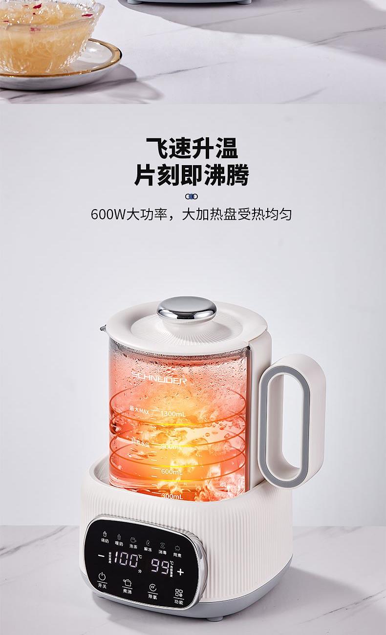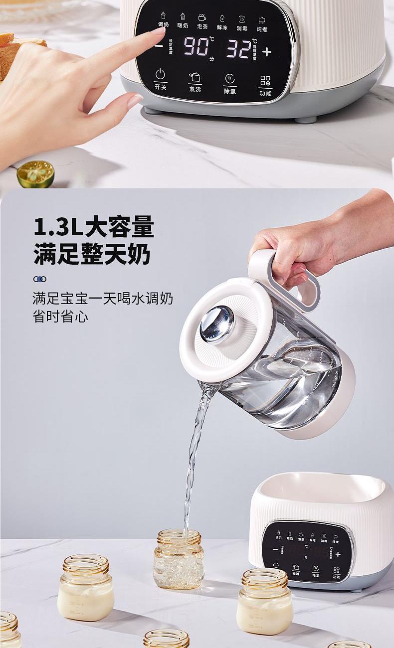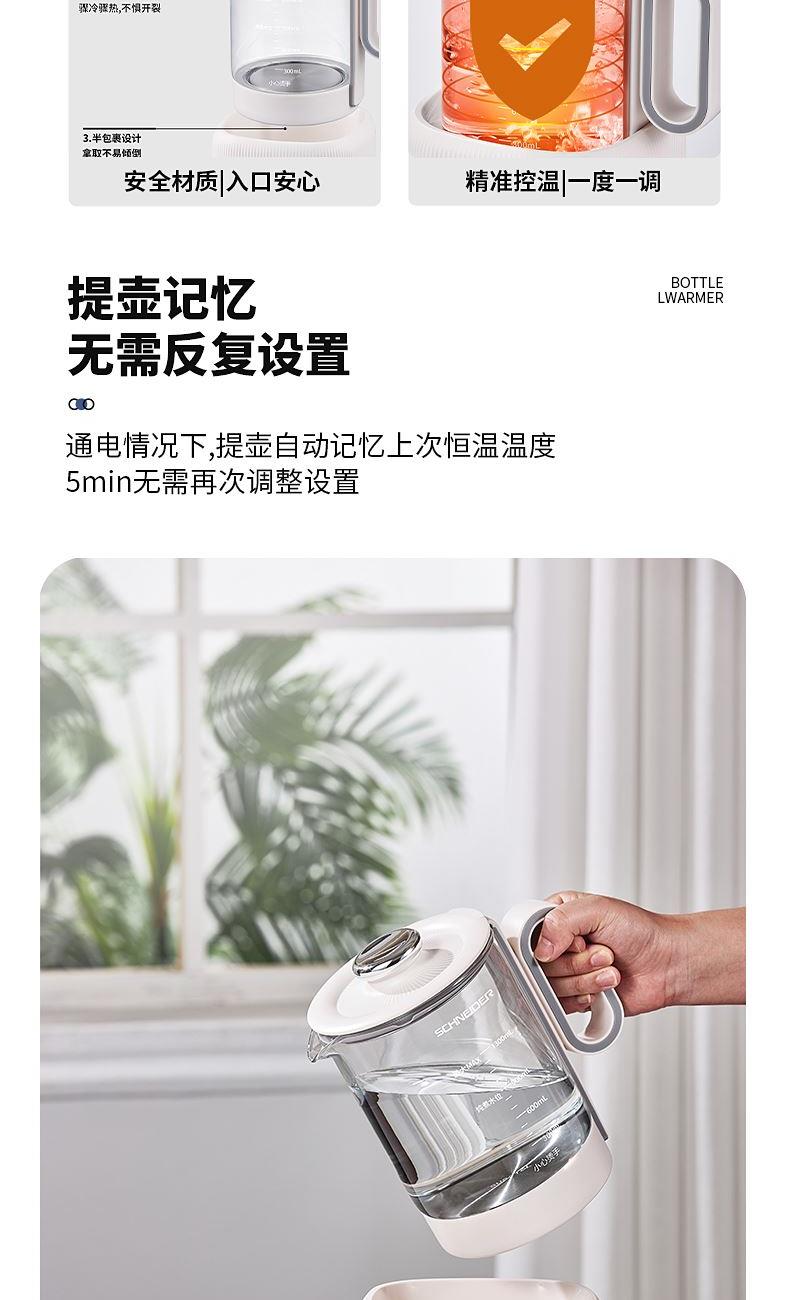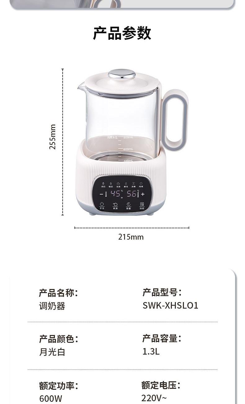 产品颜色:月光白 产品材质:pp+高硼硅玻璃 额定电压:220V~ 额定频率:50Hz 额定功率:600W 额定容量:1.3L 单台净重:1.15kg 单台毛重:1.25kg 产品尺寸:215*175*248mm 内箱尺寸:210*210*290mm 外箱尺寸:650*440*630mm 产品清单:主机*1/底座*1/说明书*1 316不锈钢发热盘 ,告别清洗烦恼 智能触控面板,温度实时显示 提壶记忆,防干烧断电保护 多功能多温度段调节 一键煮沸除氯 72小时恒温