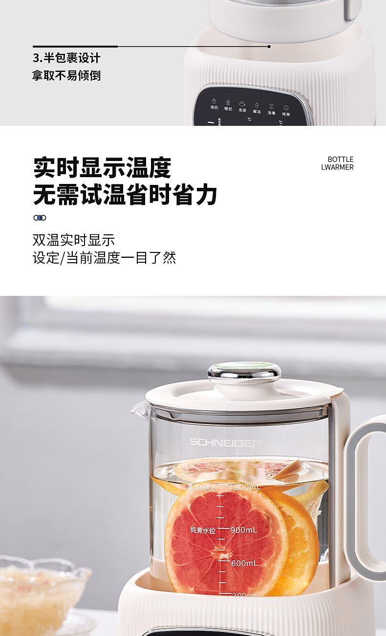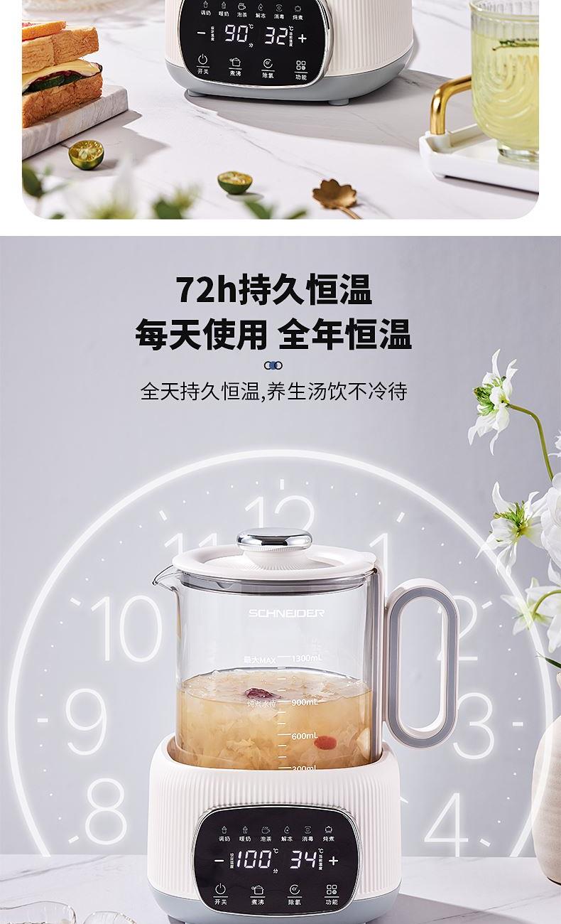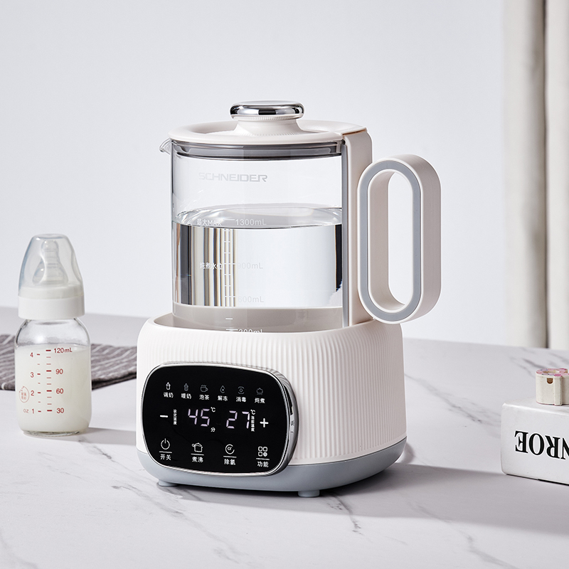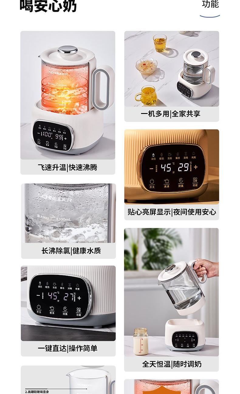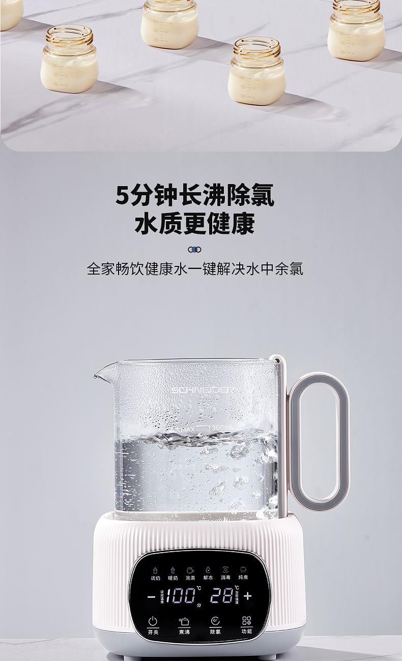 产品颜色:月光白 产品材质:pp+高硼硅玻璃 额定电压:220V~ 额定频率:50Hz 额定功率:600W 额定容量:1.3L 单台净重:1.15kg 单台毛重:1.25kg 产品尺寸:215*175*248mm 内箱尺寸:210*210*290mm 外箱尺寸:650*440*630mm 产品清单:主机*1/底座*1/说明书*1 316不锈钢发热盘 ,告别清洗烦恼 智能触控面板,温度实时显示 提壶记忆,防干烧断电保护 多功能多温度段调节 一键煮沸除氯 72小时恒温