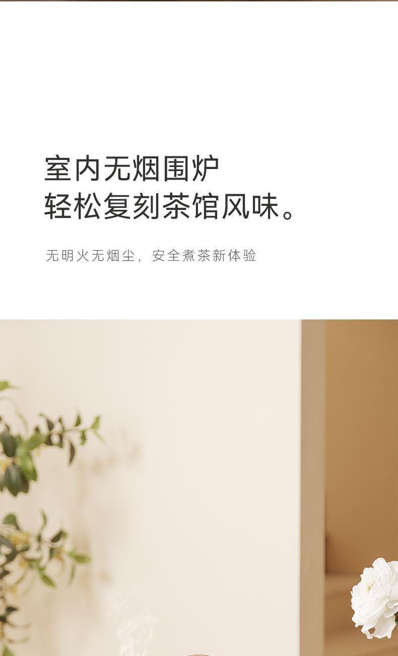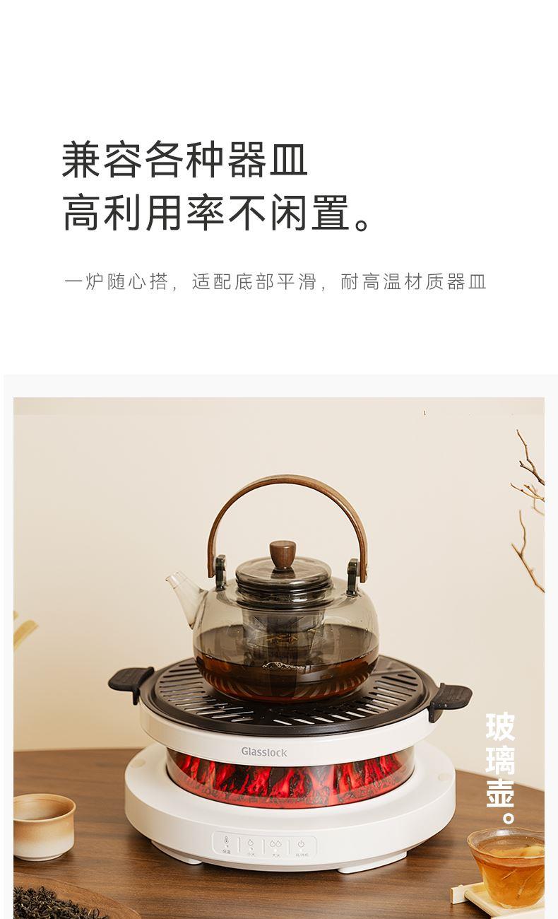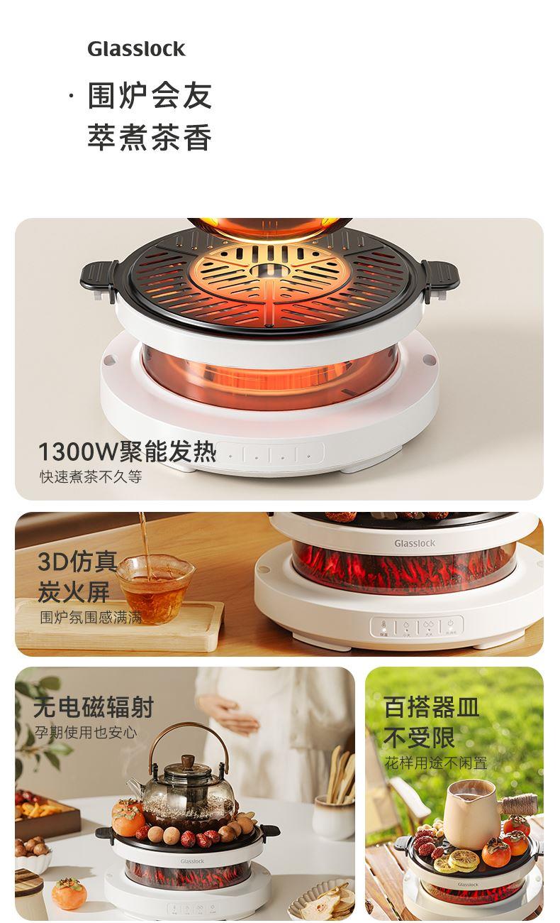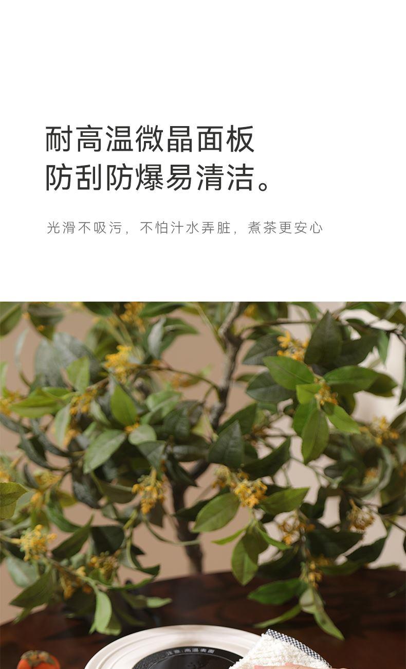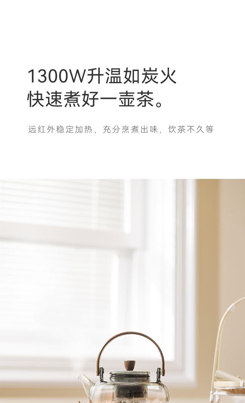 额定电压:220V~50Hz 额定功率:1300W 茶壶容量:800ml 茶壶材质:高硼硅玻璃 烤网材质:陶瓷油涂层 配件清单:主机、烤网、茶壶、茶漏、蒸茶器、壶盖 1300W快速升温,烧水只需8分钟; 3D仿碳氛围屏,让生活更有仪式感; 聚能发热技术,无碳0辐射更安全; 食品级烤网,经久耐用好清洗; 三档调温,火候一键掌控; 耐高温微晶面板,防爆易清洁; 智能超温保护,无忧煮茶怡然自得。