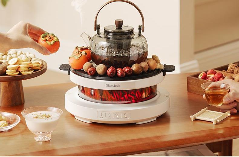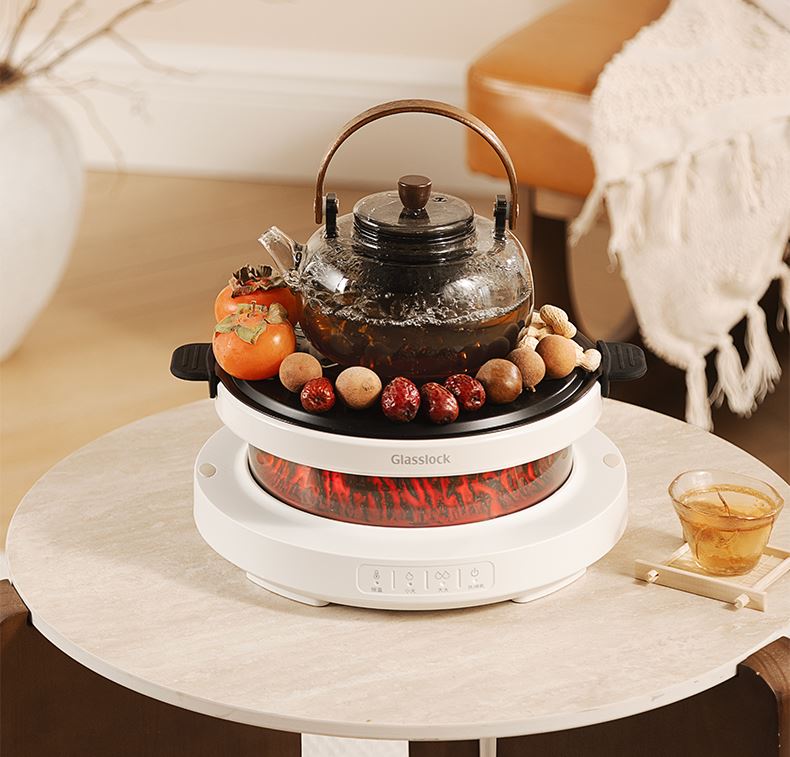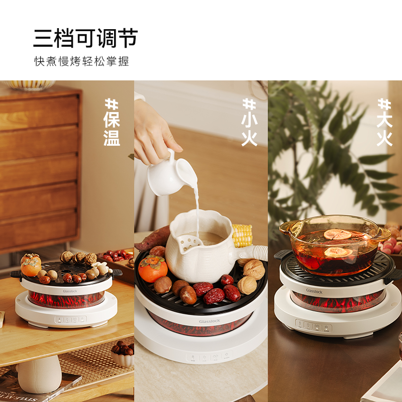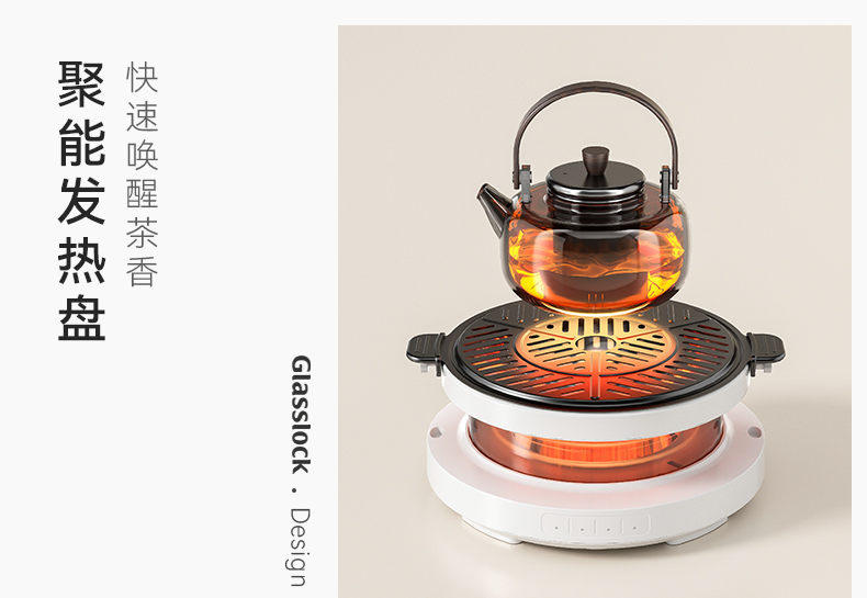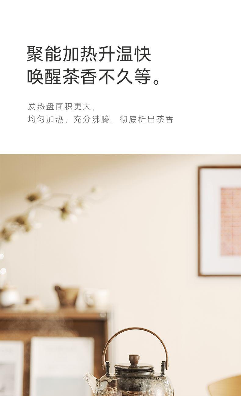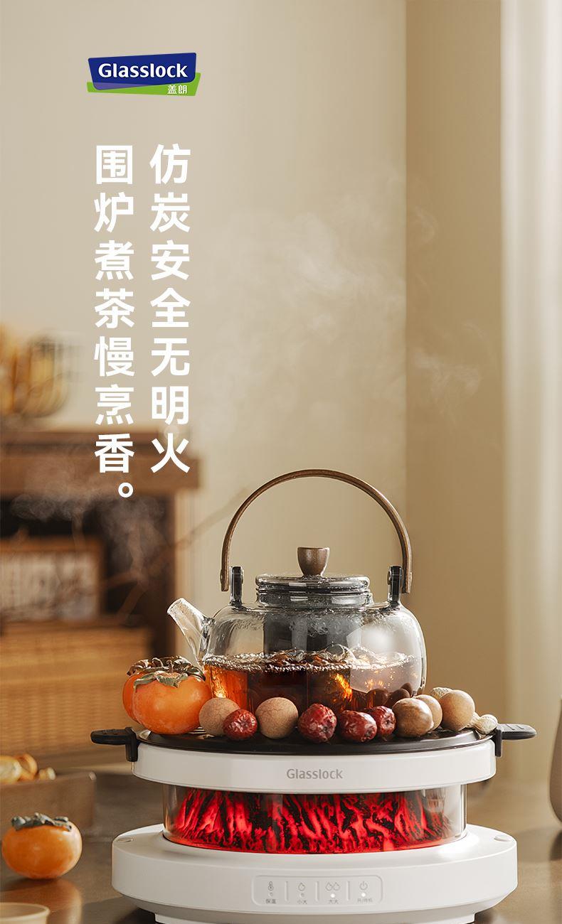 额定电压:220V~50Hz 额定功率:1300W 茶壶容量:800ml 茶壶材质:高硼硅玻璃 烤网材质:陶瓷油涂层 配件清单:主机、烤网、茶壶、茶漏、蒸茶器、壶盖 1300W快速升温,烧水只需8分钟; 3D仿碳氛围屏,让生活更有仪式感; 聚能发热技术,无碳0辐射更安全; 食品级烤网,经久耐用好清洗; 三档调温,火候一键掌控; 耐高温微晶面板,防爆易清洁; 智能超温保护,无忧煮茶怡然自得。