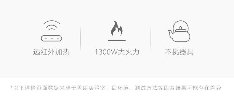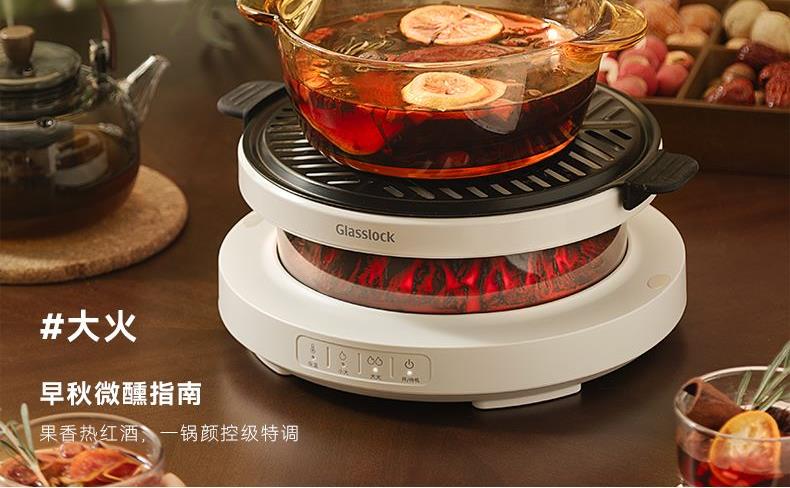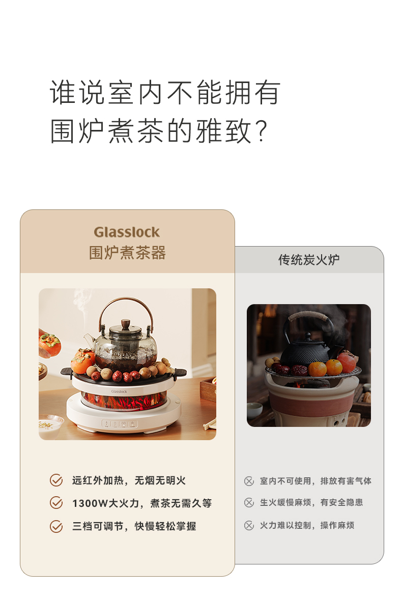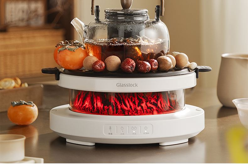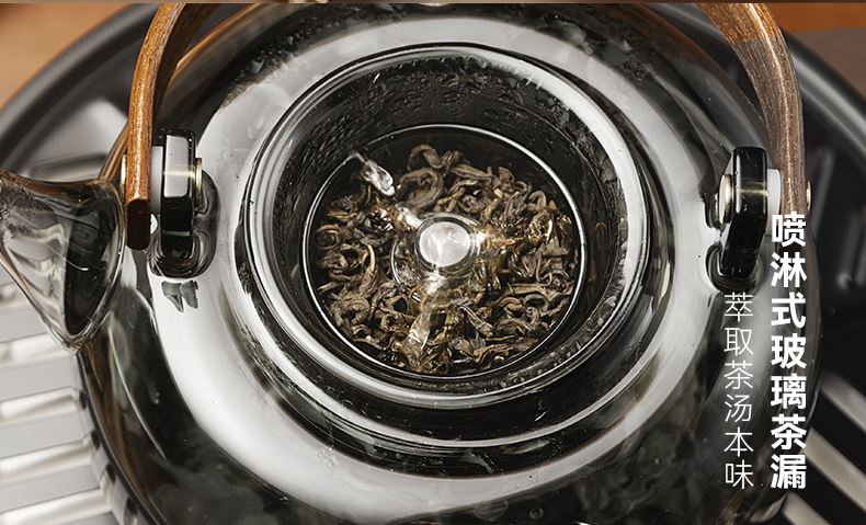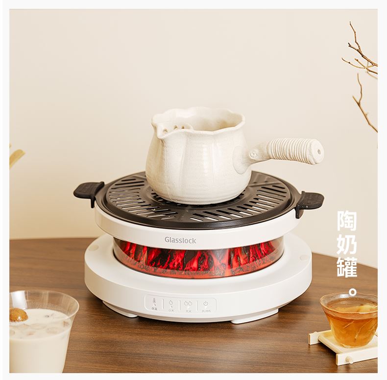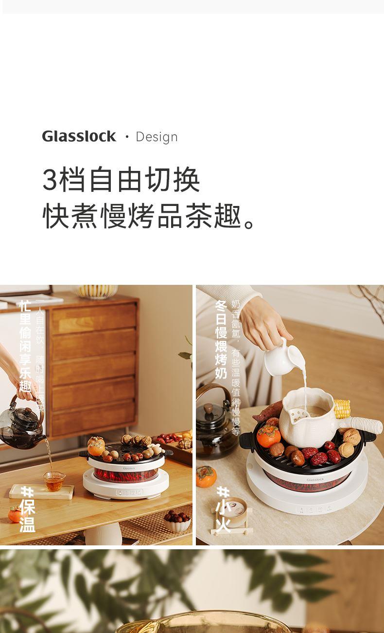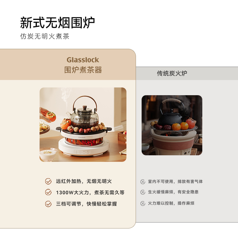 额定电压:220V~50Hz 额定功率:1300W 茶壶容量:800ml 茶壶材质:高硼硅玻璃 烤网材质:陶瓷油涂层 配件清单:主机、烤网、茶壶、茶漏、蒸茶器、壶盖 1300W快速升温,烧水只需8分钟; 3D仿碳氛围屏,让生活更有仪式感; 聚能发热技术,无碳0辐射更安全; 食品级烤网,经久耐用好清洗; 三档调温,火候一键掌控; 耐高温微晶面板,防爆易清洁; 智能超温保护,无忧煮茶怡然自得。