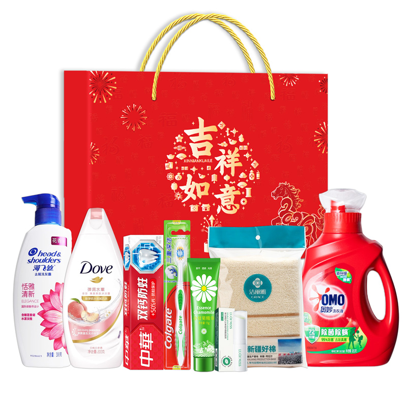 礼盒尺寸:32*8.5*24.5cm 包装尺寸:66* 46.5*51 CM 产品配置:(香型随机) 海飞丝洗发水300ml 多芬沐浴露300ml 中华牙膏90g 高露洁牙刷 洁丽雅毛巾(69*33cm) 凡士林润唇膏2.7g 洋甘菊护手霜75g 奥妙洗衣液950g 精美礼盒